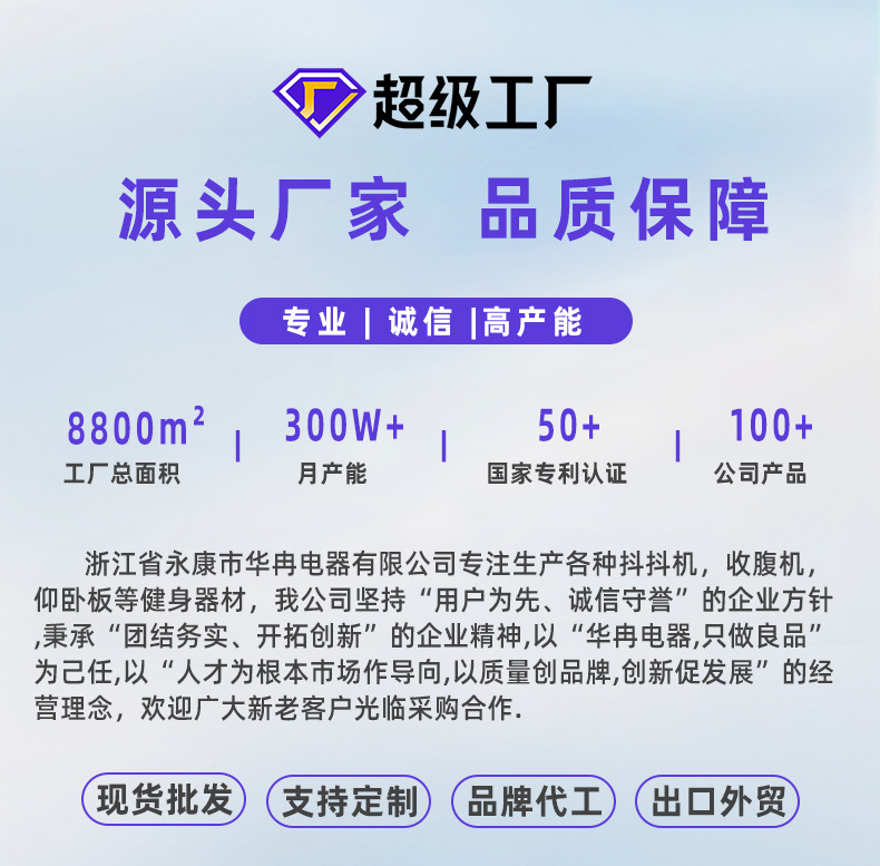 浙江省永康市华冉电器有限公司专注生产各种筋膜枪,抖抖机,收腹机,等健身器材,我公司坚持“用户为先、诚信守誉”的企业方针,秉承“团结务实、开拓创新”的企业精神,以“华冉电器,只做好产品”为己任,以“人才为根本,市场作导向,以质量创品牌,创新促发展”的经营理念,欢迎广大新老客户光临采购合作