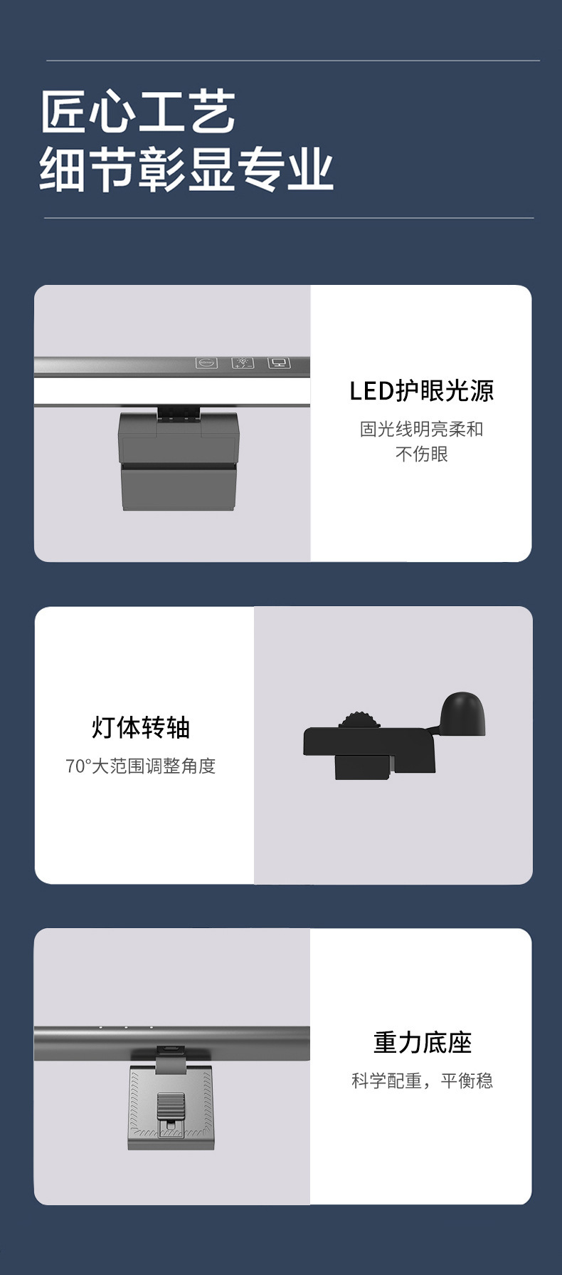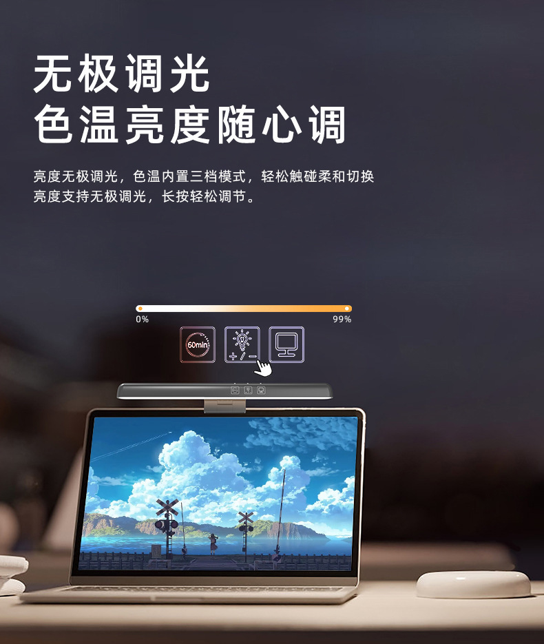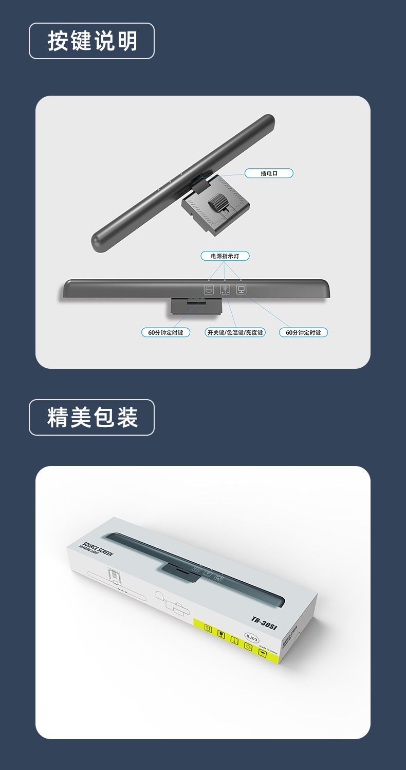 功能特点:定时60分钟关灯功能,无极调光,快捷阅读模式,三色温调节,非对称光源,type-c接口