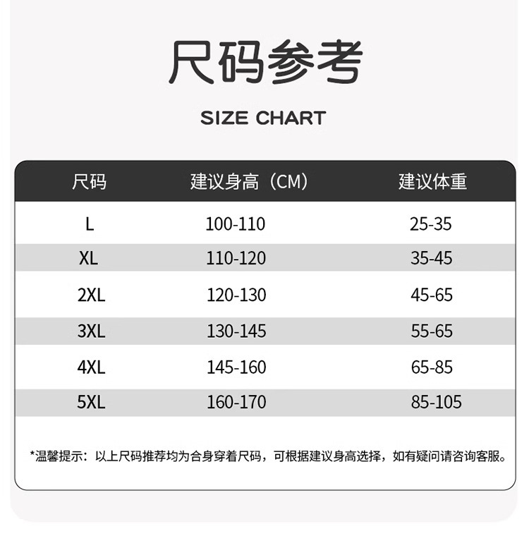 L (рекомендуемый рост 110-112 см и вес 12.5-16kg); XL (рекомендуемый рост 112-122 см и вес 17.5-22.5kg); 2XL (рекомендуемый рост 122-134 см и вес 22.5-27.5kg); 3XL (рекомендуемый рост 134-143 см и вес 27.5-35kg); 4XL (рекомендуемый рост 143-151 см и вес 35-45kg); 5XL (рекомендуемый рост 151-160 см и вес 45-55kg); 6XL (рекомендуемый рост 160-175 см и вес 50-62.5kg)