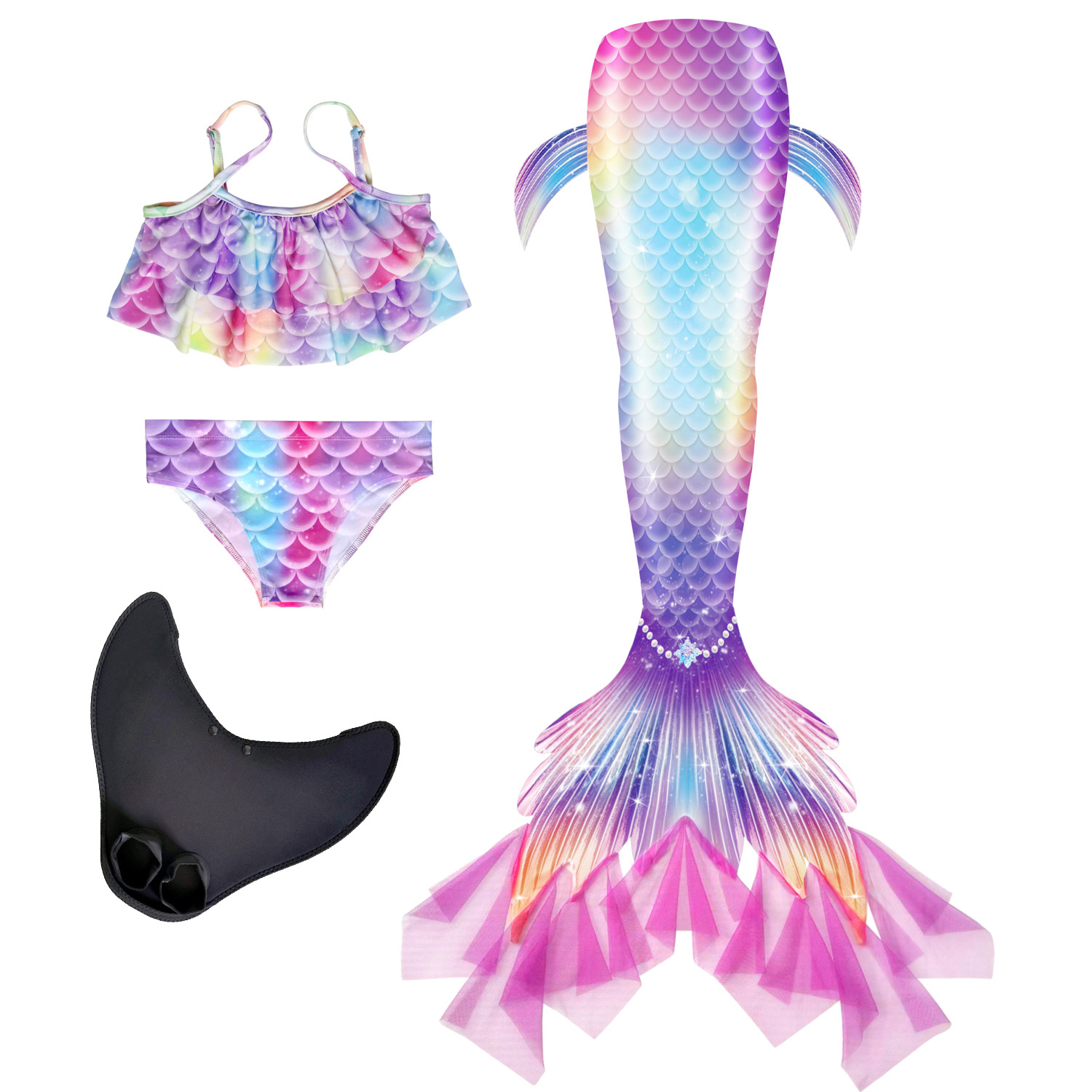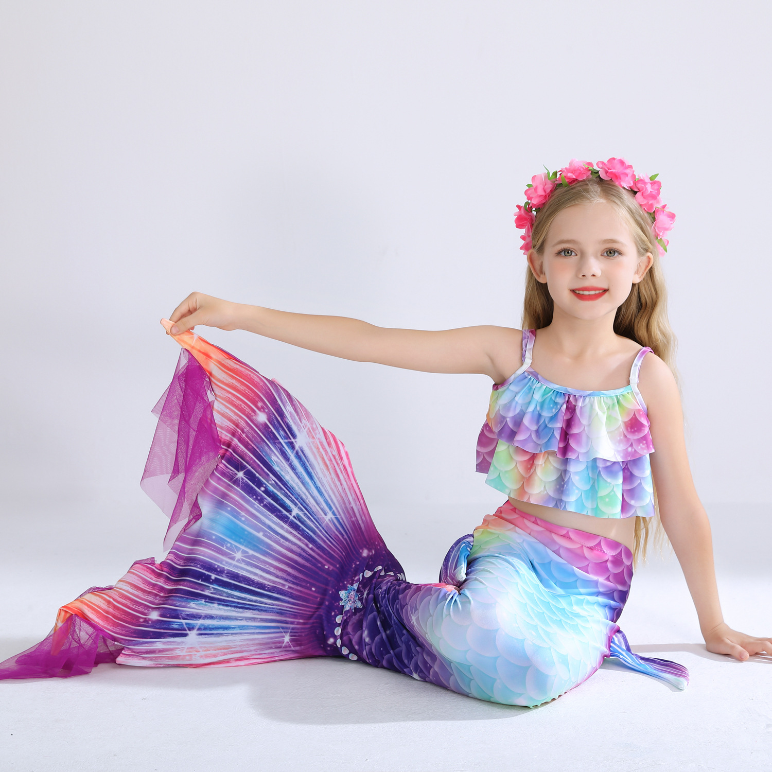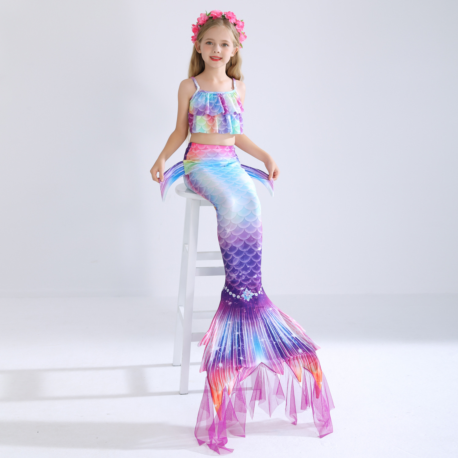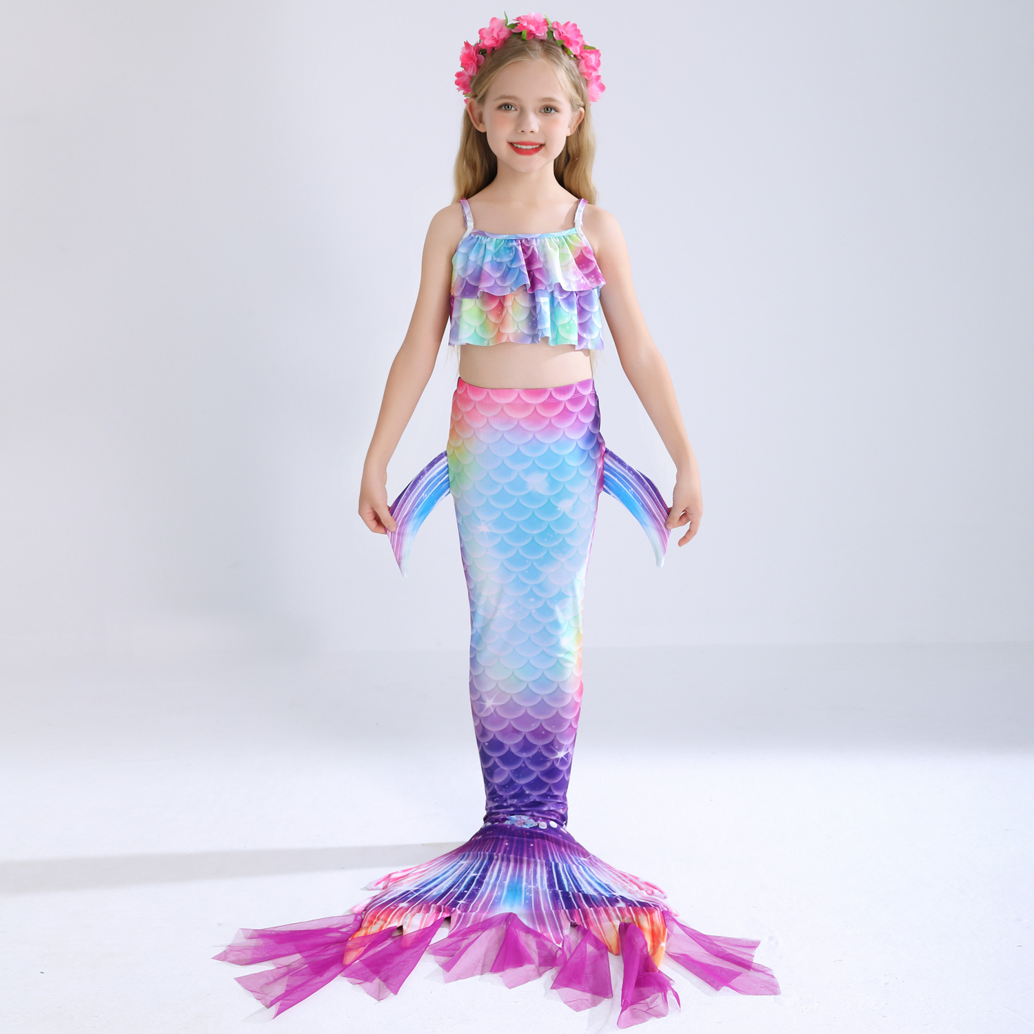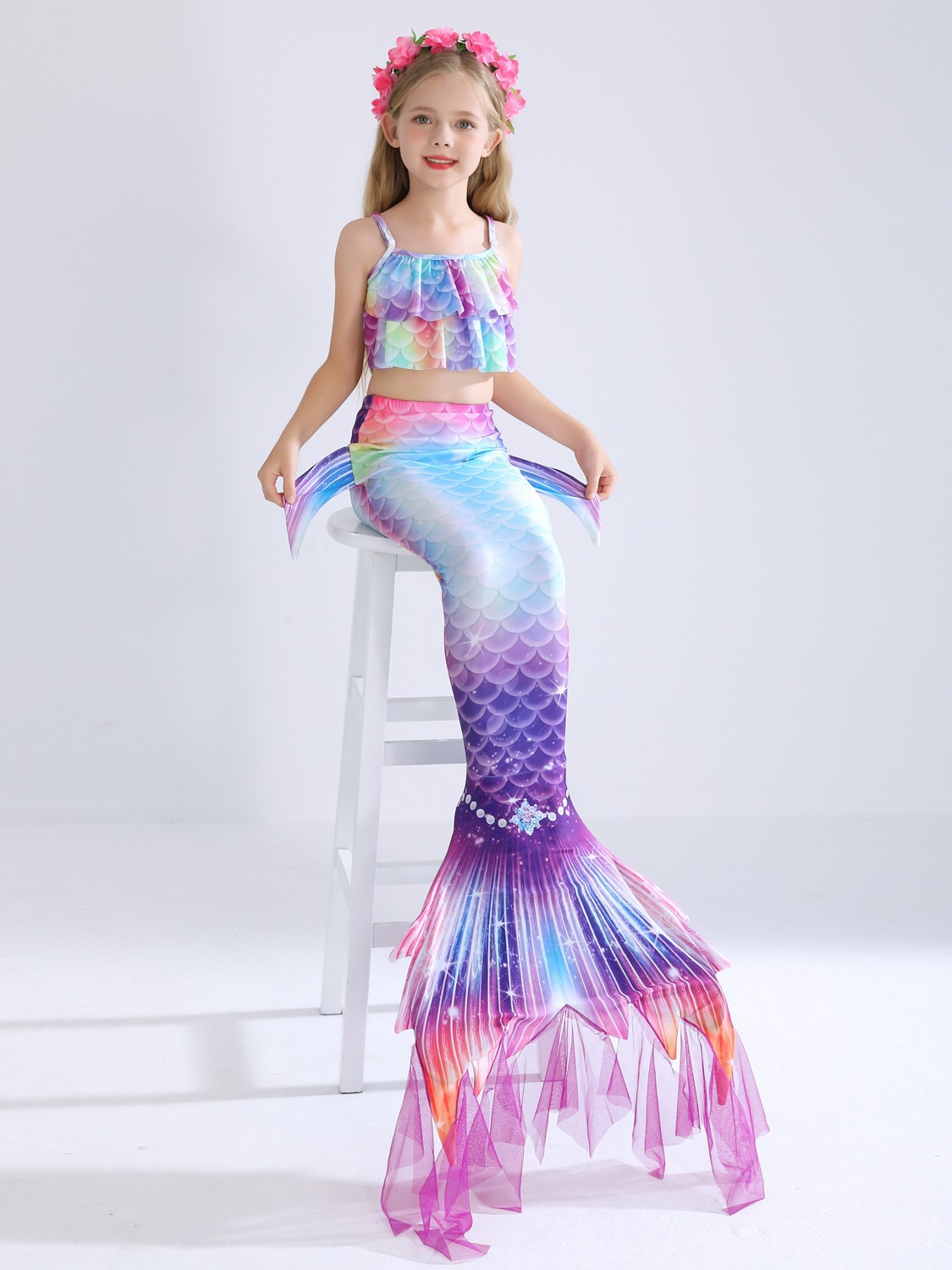 Детский купальник русалки для девочек, купальник с хвостом русалки, комплект из трех предметов, бикини принцессы для больших, средних и маленьких девочек