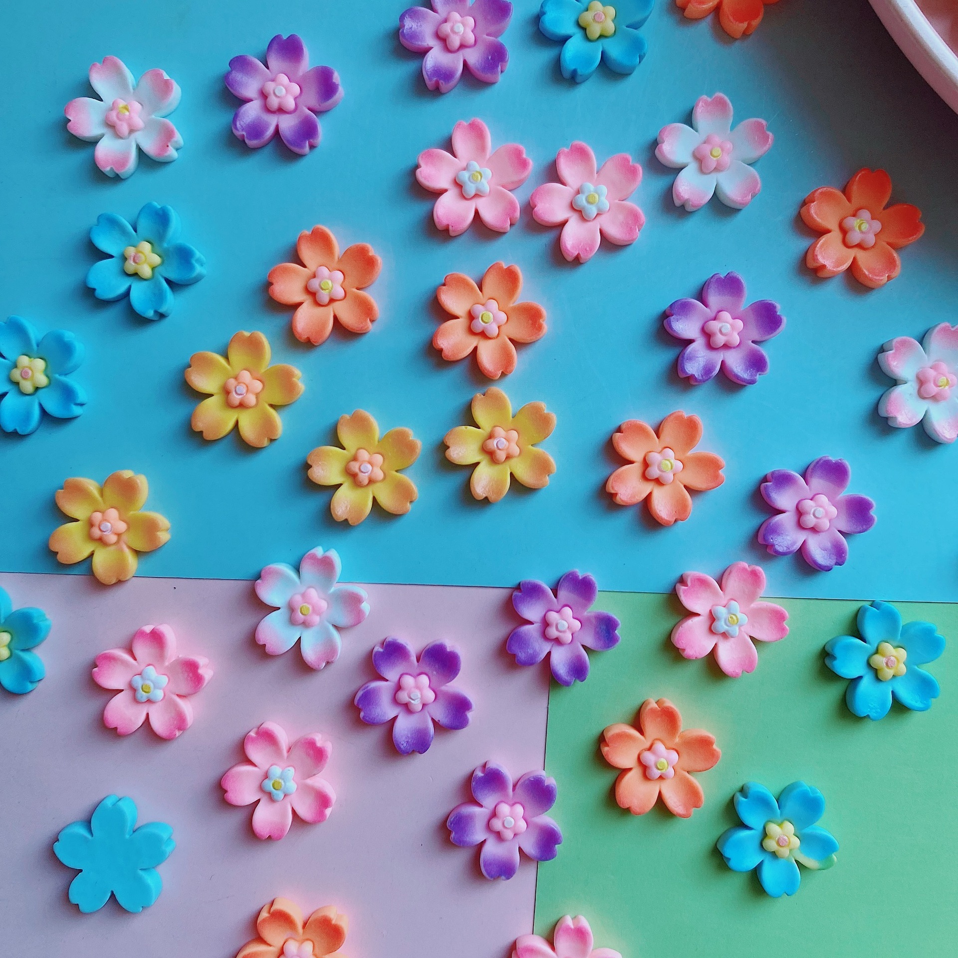 Смешанный (настоящие вишни); Оранжевый (цветная сакура); Светло-розовый (цельноцветная вишня); Желтый (цветная вишня); Синий (сплошная вишня); Фиолетовый (сплошная вишня); Белый (настоящие вишни)