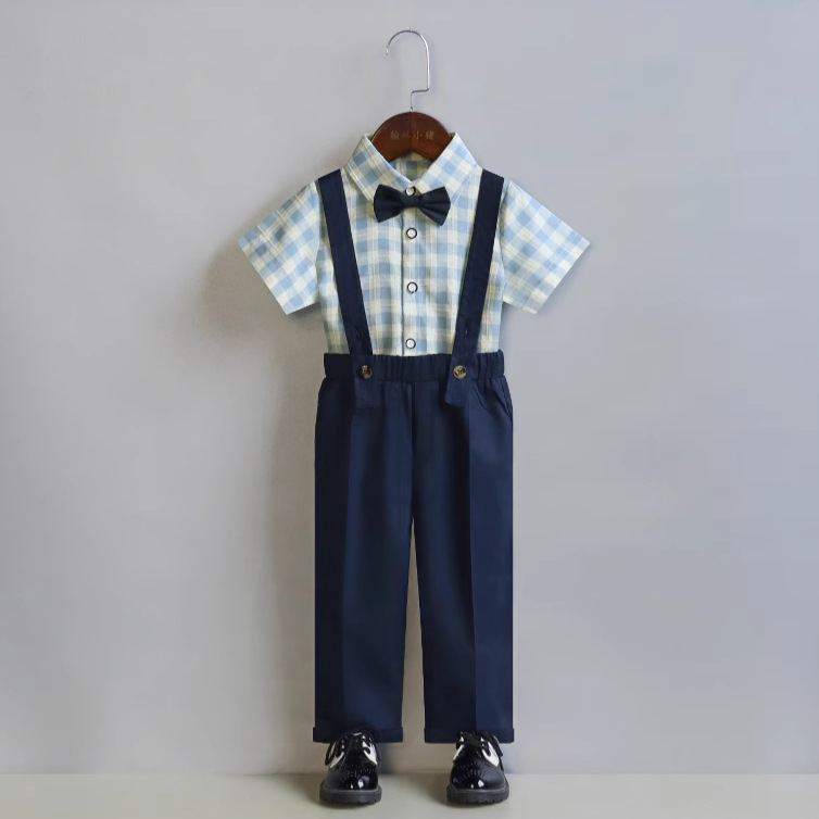 Темно-синий: шорты на подтяжках+рубашка в клетку с короткими рукавами+темно-синий натуральный галстук-бабочка.; Темно-синий: брюки на подтяжках + клетчатая рубашка с короткими рукавами + темно-синий натуральный галстук-бабочка.; Темно-синий: брюки на подтяжках + клетчатая рубашка с длинными рукавами + натуральный галстук-бабочка темно-синего цвета.; Темно-синий: шорты на подтяжках + синяя рубашка с короткими рукавами + галстук-бабочка в синюю горошек.
