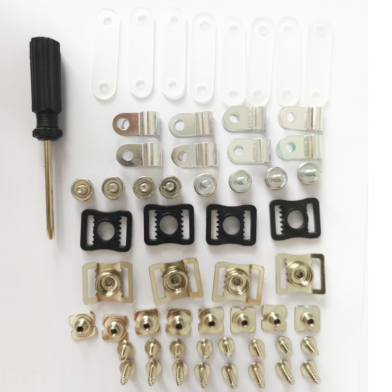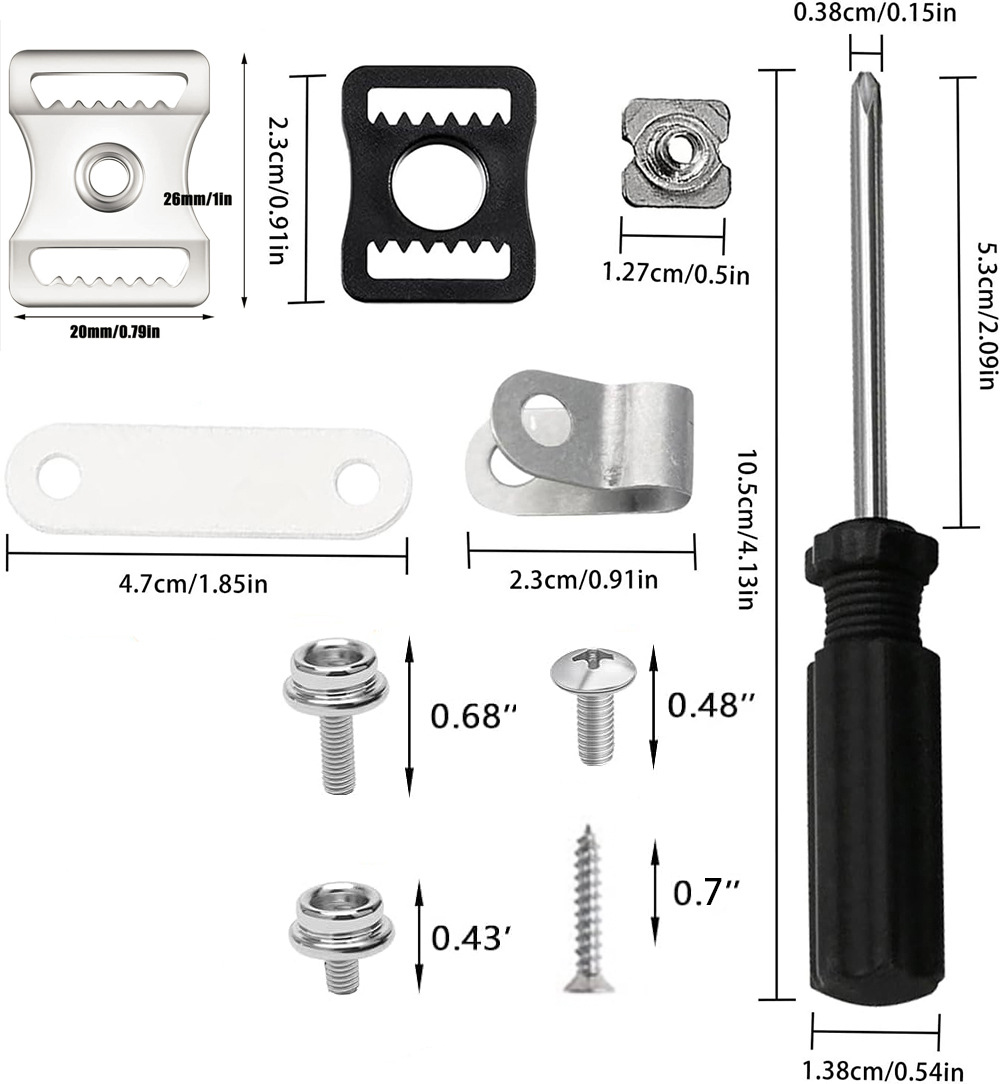 美式足球、棒球、垒球、冰球头盔维修包。其中,8个螺母、8个螺钉、8个螺丝、8个R形夹、8个卡箍橡胶垫圈、4个+4个钳口织带紧固件、4个公扣长螺丝、4个公扣短螺丝和1个螺丝刀工具足以满足您的日常使用和更换需求。