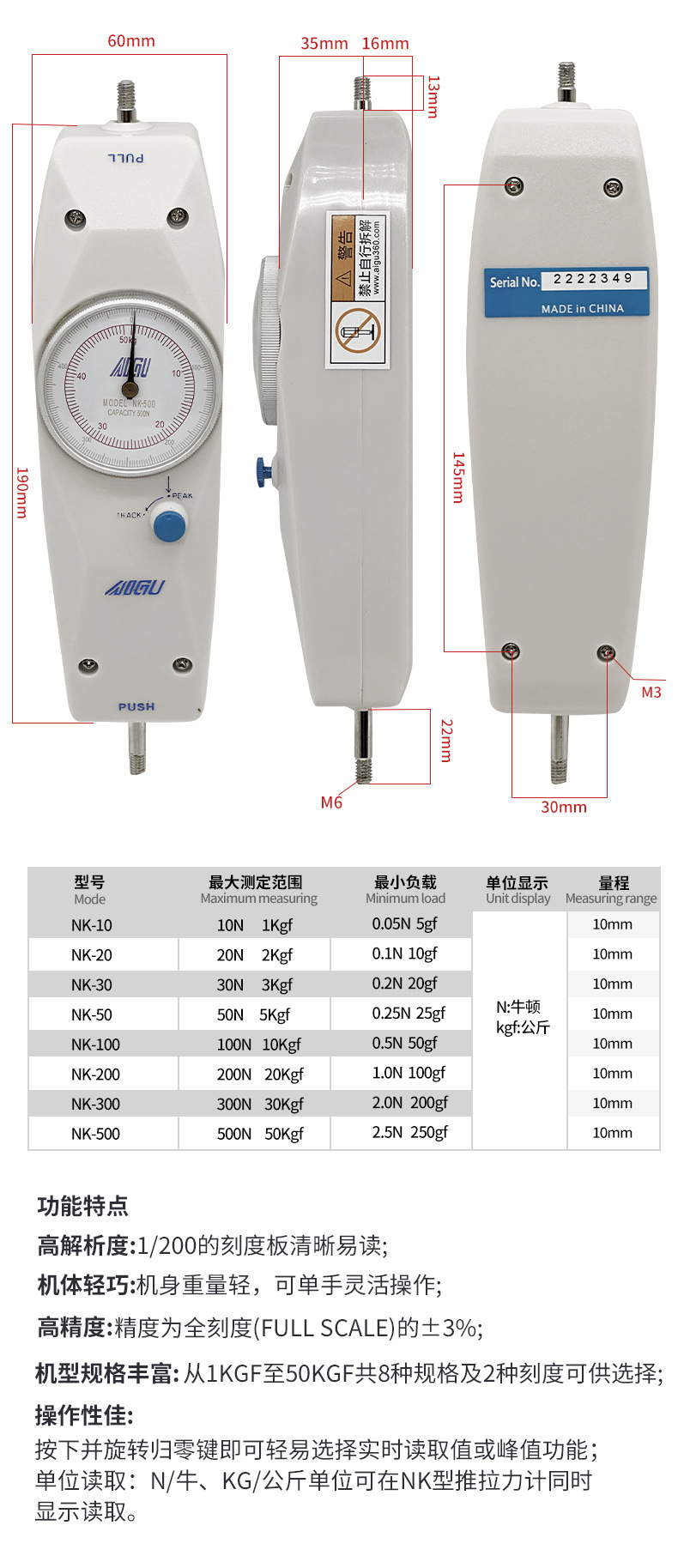 NK-10(10N/1kg); NK-20(20N/2kg); NK-30(30N/3kg); NK-50(50N/5kg); NK-100(100N/10kg); NK-200(200N/20kg); NK-300(300N/30kg); NK-500(500N/50kg)