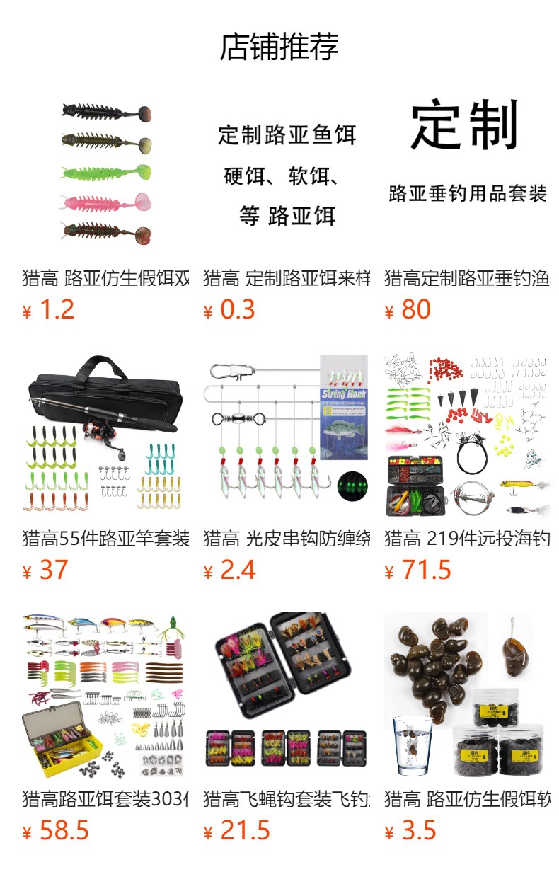 威海猎高体育用品有限公司主营:渔具配件、渔具套装、路亚饵、硬饵、软饵、鱼钩、假饵、渔具用品、垂钓服饰及路亚包等产品专业生产加工的公司,产品种类齐全,有自主开发的渔具套装,销量和口碑一直在上升!其中鱼钩、路亚饵、路亚饵套装、渔具配件都是我司的优势产品。我司对产品质量严格要求,质量保证!!威海猎高体育用品有限公司的诚信、实力和产品质量获得业界的认可。我们满怀诚意求共同发展、共同进步! 我们在这里也感谢大家的支持,也愿我们的产品给大家带来更多的销量,我们不足的地方,请各位经销商们多多指出,我们会虚心的接受和改进,欢迎各地经销商朋友莅临参观、指导和业务洽谈。