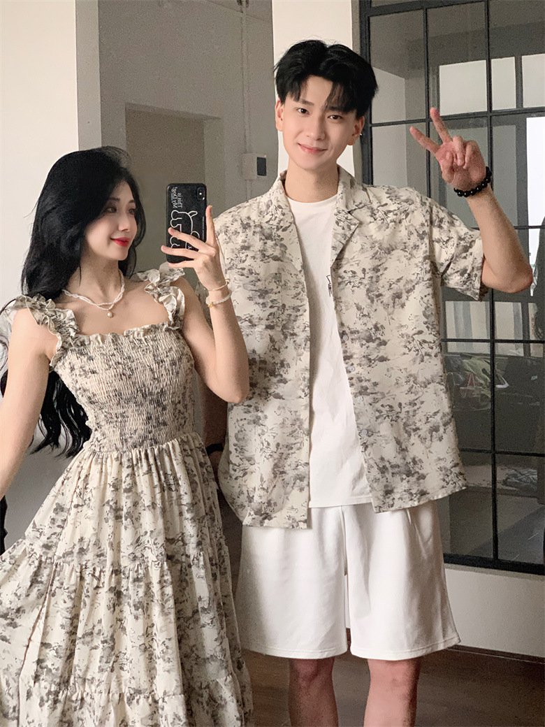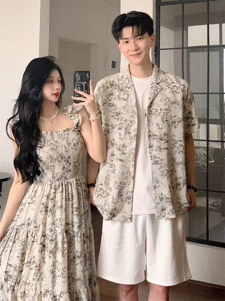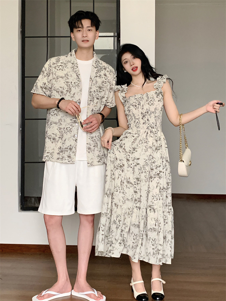 2024 летняя пара платье пляжная юбка тонкая темпераментная мужская цветочная рубашка с короткими рукавами
