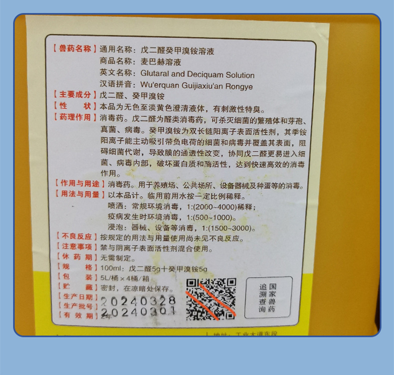 Дезинфицирующий раствор для ферм, в частности для курятников, свинарников, крупного рогатого скота, овец и кроликов, содержащий глутаральдегид и октадецилметиламмоний бромид.