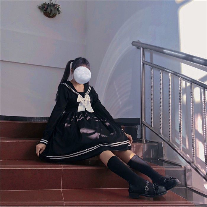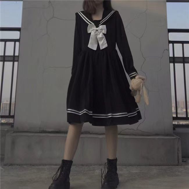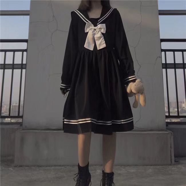 Студенческое платье с длинными рукавами корейского свободного японского стиля свежий черный темно-синий воротник милый студент jk юбка девушка