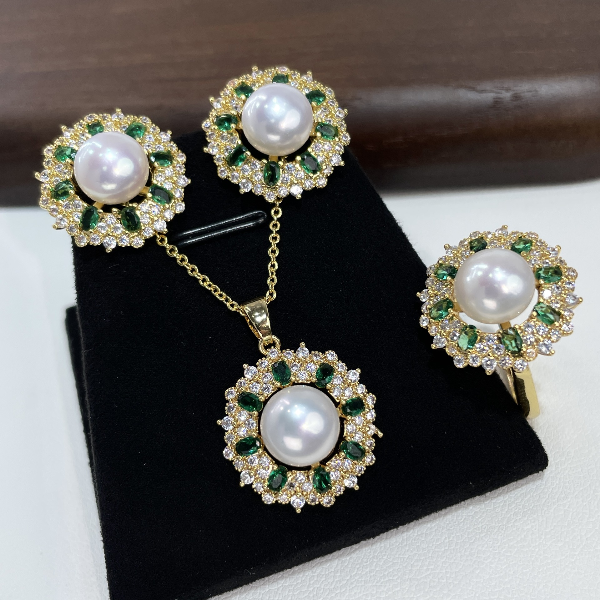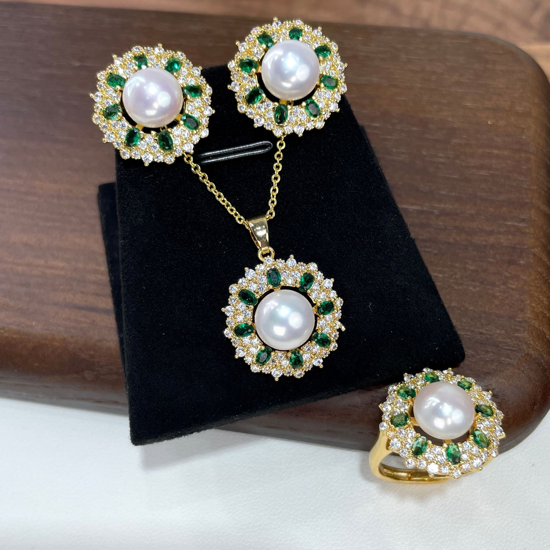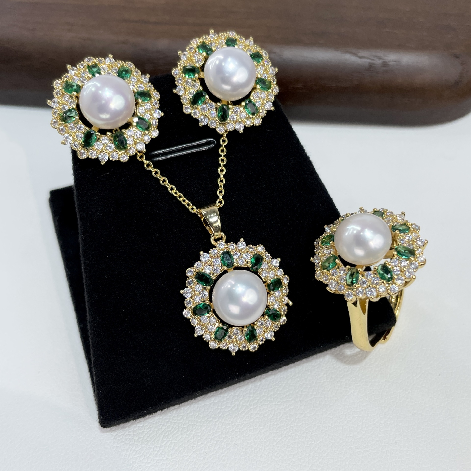Популярный новый комплект из натурального жемчуга, зеленый, с полным ореолом из бриллиантов, роскошный комплект из трех предметов: кольцо, серьги, кулон, серьги-гвоздики из серебра 925 пробы.