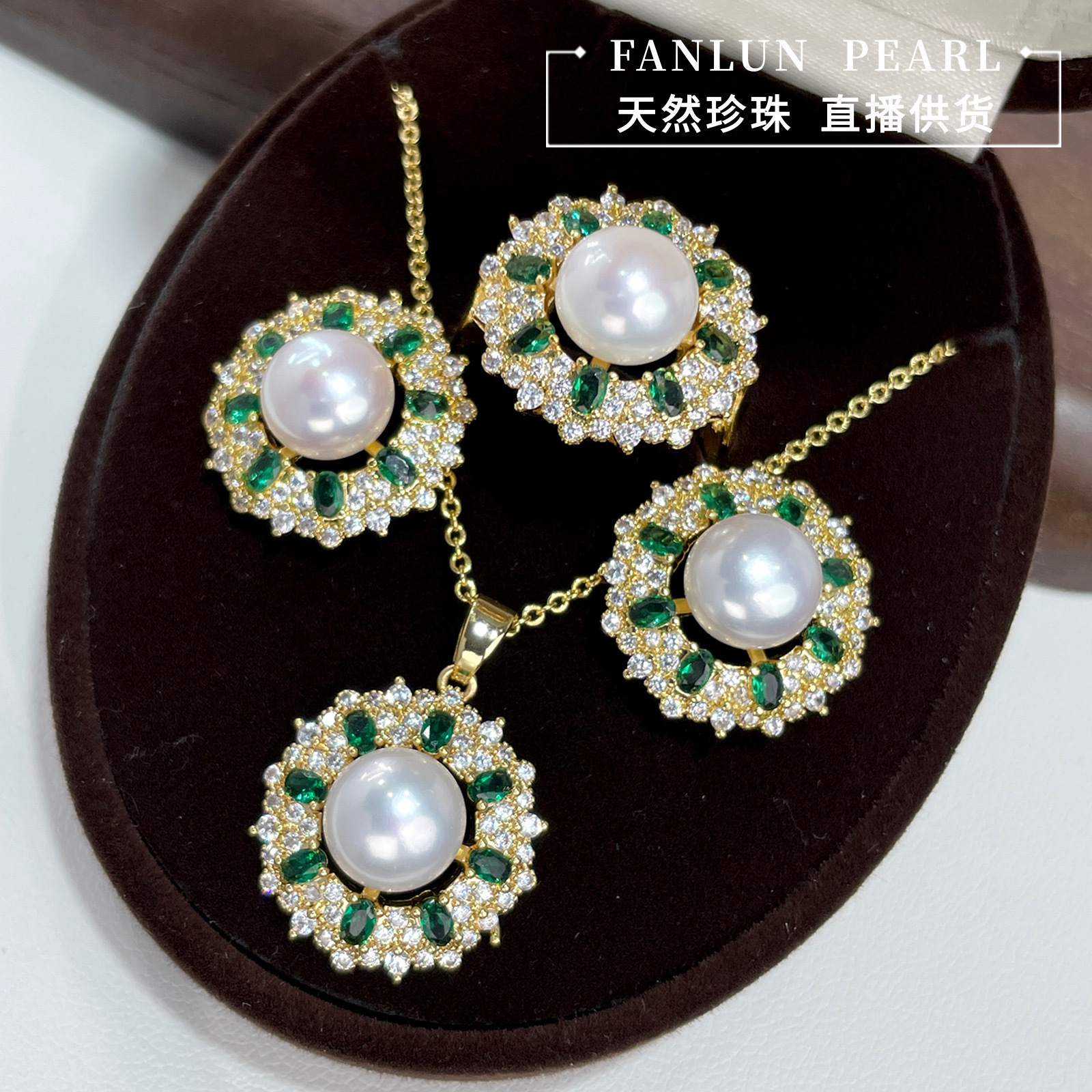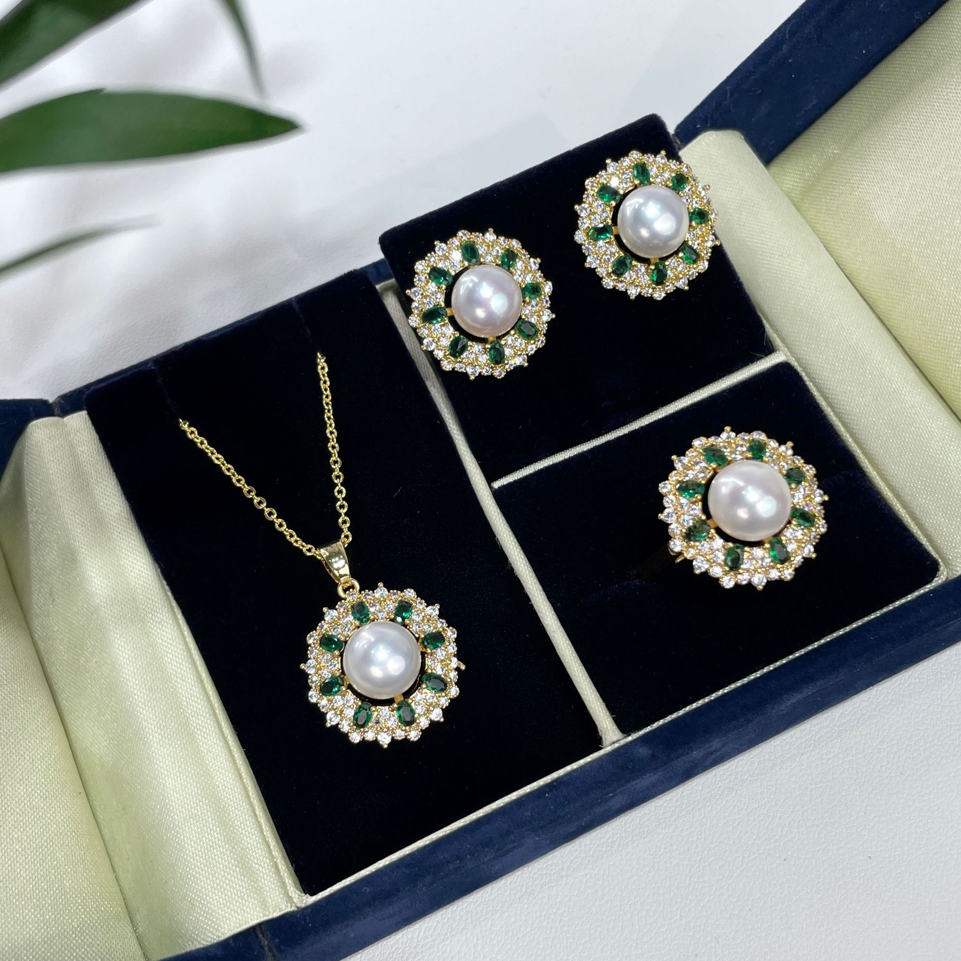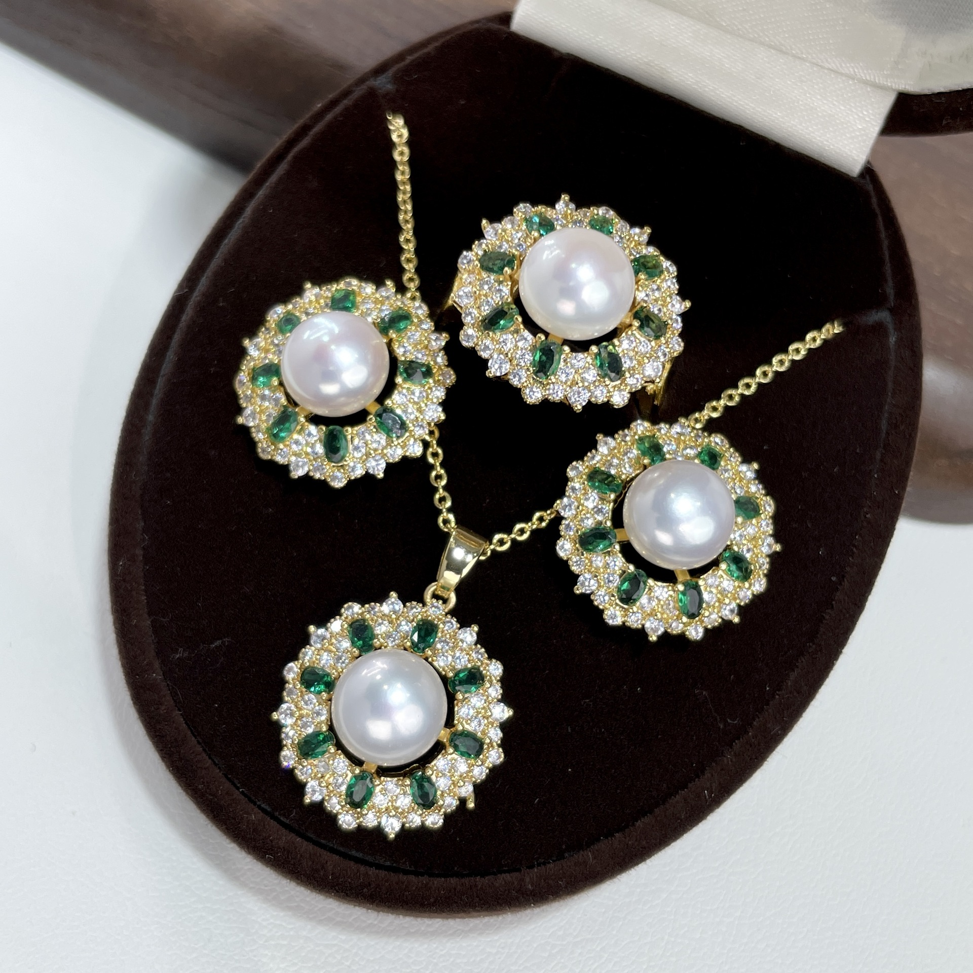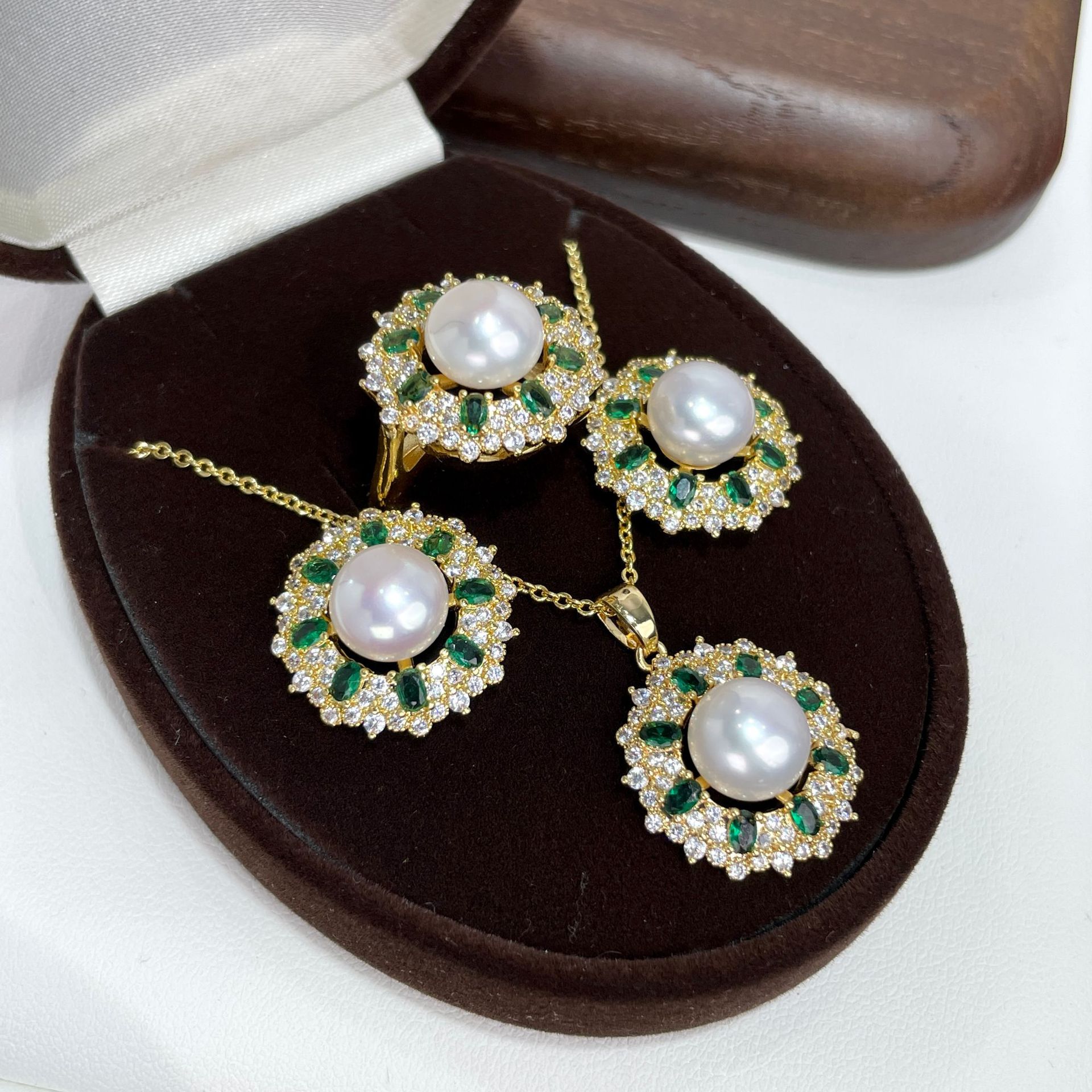 Популярный новый комплект из натурального жемчуга, зеленый, с полным ореолом из бриллиантов, роскошный комплект из трех предметов: кольцо, серьги, кулон, серьги-гвоздики из серебра 925 пробы.
