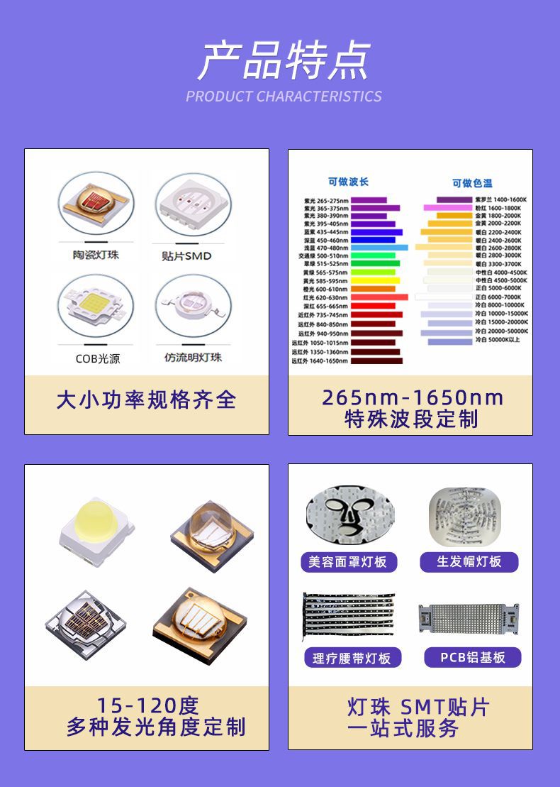 Фиолетовый свет 1 Вт, медный кронштейн 365-370; 3 Вт фиолетовый свет 365-370 медный кронштейн; 5 Вт фиолетовый свет 365-370 (двухъядерный) медный кронштейн; Фиолетовый свет мощностью 1 Вт, медный кронштейн 390-400; Фиолетовый свет 3 Вт, медный кронштейн 390-400; Фиолетовый свет 5 Вт, медный кронштейн 390-400 (двухжильный); Медный кронштейн Blu-ray 450–460 мощностью 1 Вт; Медный кронштейн Blu-ray 450-460 мощностью 3 Вт; Медный кронштейн Blu-ray 450-460 (двухъядерный) мощностью 5 Вт; 1 Вт, голубой, 475-485, медный кронштейн; 3-ватт водный озерный синий медный кронштейн 475-485; 5 Вт Water Lake Blue 470-480 (двухжильный) медный кронштейн; Зеленый свет 1 Вт, медный кронштейн 520-530; Зеленый свет 3 Вт, медный кронштейн 520-530; 5-ваттный зеленый свет 520-530 (двухжильный) медный кронштейн; Желтый свет 1 Вт, медный кронштейн 580-590; Желтый свет 3 Вт, медный кронштейн 580-590; Желтый свет 5 Вт, медный кронштейн 580-590 (двухжильный); Красный свет 1 Вт, медный кронштейн 620-630; Красный свет 3 Вт, медный кронштейн 620-630; Красный свет 5 Вт, медный кронштейн 620-630 (двухжильный); Темно-красный медный кронштейн мощностью 1 Вт, 650–660; Медный кронштейн 3 Вт темно-красный 650-660; Темно-красный медный кронштейн 5 Вт 650-660 (двухъядерный); Инфракрасный медный кронштейн 840-850 мощностью 1 Вт; Медный кронштейн 3 Вт инфракрасный 840-850; Инфракрасный медный кронштейн 5 Вт 840-850 (двухъядерный); Медный кронштейн 940-950 мощностью 1 Вт для инфракрасного излучения; Медный кронштейн 3 Вт инфракрасный 940-950; Инфракрасный медный кронштейн 5 Вт 940-950 (двухъядерный); Медный кронштейн RGB мощностью 3*1 Вт; 4*1 Вт медный кронштейн RGBW; Медный кронштейн RGBW 4*3 Вт; Медный кронштейн мощностью 1 Вт, 6000–6500 К.; Медный кронштейн 3 Вт 6000–6500 К; Белый свет 5 Вт, 6000–6500 К (двухжильный), медный кронштейн; 3 Вт, 410–420 нм, медный кронштейн с одной струной; 5 Вт 3300–3700 К 1 строка 2 параллельно; 5 Вт, 20000–25000 К/1C2B/объектив 140 градусов; 5-ваттный фиолетовый светильник 380-390 (двухъядерный) с медным креплением; Оптический Hong 28mi 620-630нм, двухъядерный, 120 градусов; 1Вт 720-725нм медный кронштейн; 3 Вт 720-725 нм медный кронштейн; 5 Вт 720-725 нм медный кронштейн; 5W 660+850 двухъядерный четырехножный кронштейн; 1Вт 660+1Вт 850 двухъядерный двухконтактный кронштейн