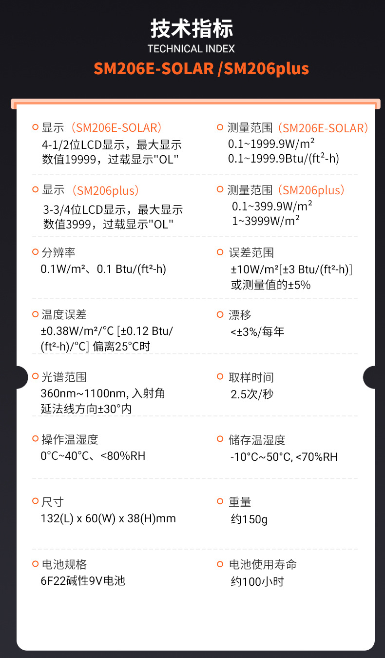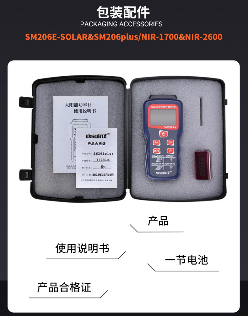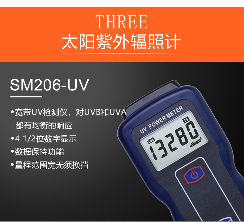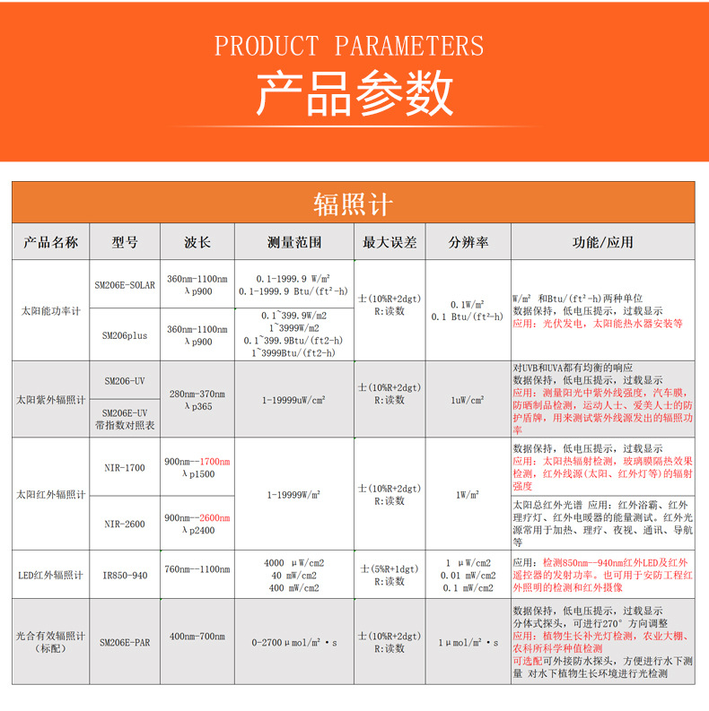 СМ206-СОЛНЕН (0.1-1999.9) Измеритель мощности; SM206E-SOLAR Новый измеритель видимой оптической мощности; SM206plus измеритель видимой оптической мощности большого диапазона; SM206-UV (1-19999) Измеритель УФ-излучения; SM206E-UV(280-370nm); SM206-NIR (1-19999) инфракрасный облучатель; NIR-1700 новый инфракрасный облучатель; NIR-2600 Солнечная инфракрасная спектроскопия; Оптический эффективный стандарт облучателя SM206-PAR; SM206-PAR включает в себя водонепроницаемый зонд.; SM206E-PAR новый стиль; SM206E-PAR (включая водонепроницаемый зонд) новый стиль; IR850-940 Мощность ИК-светодиода 850 нм/940 нм