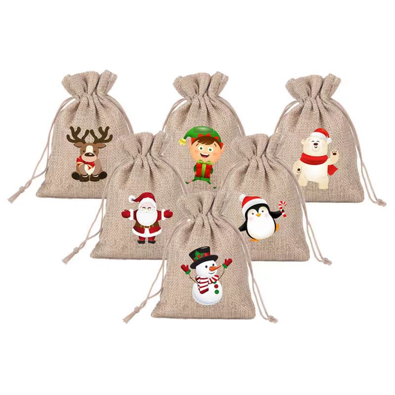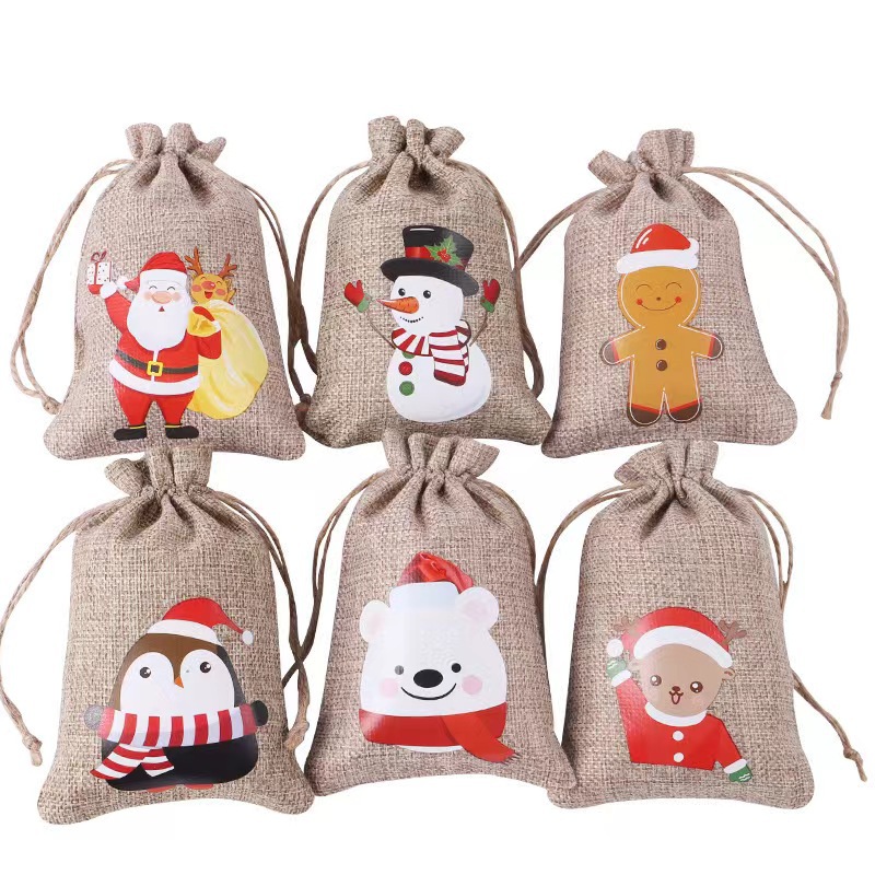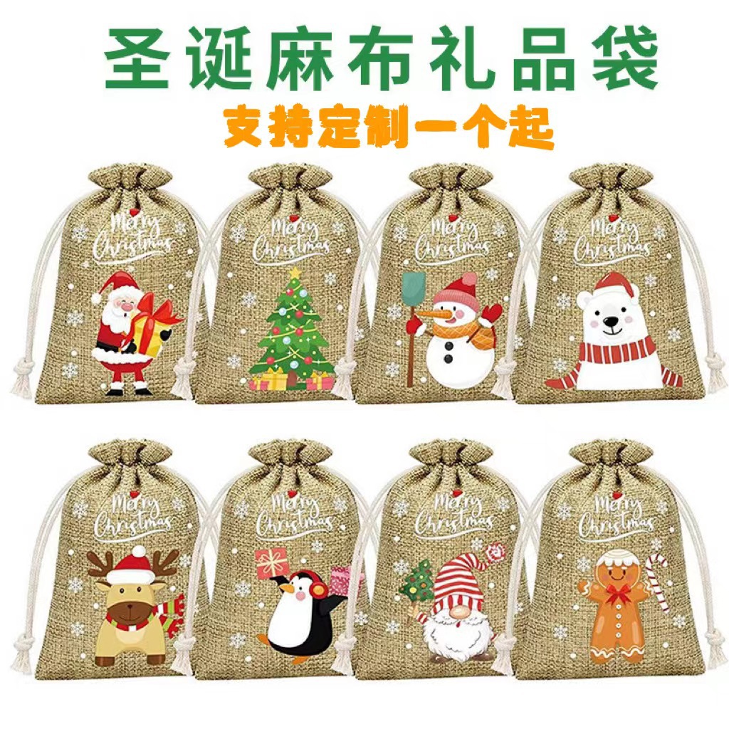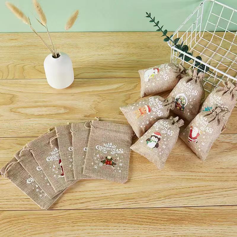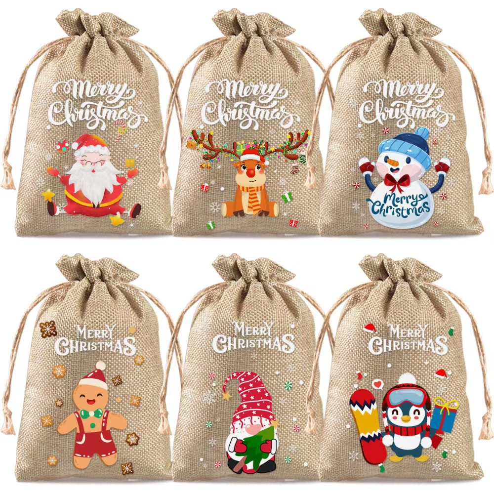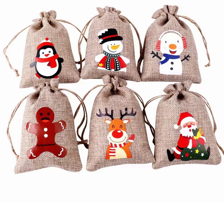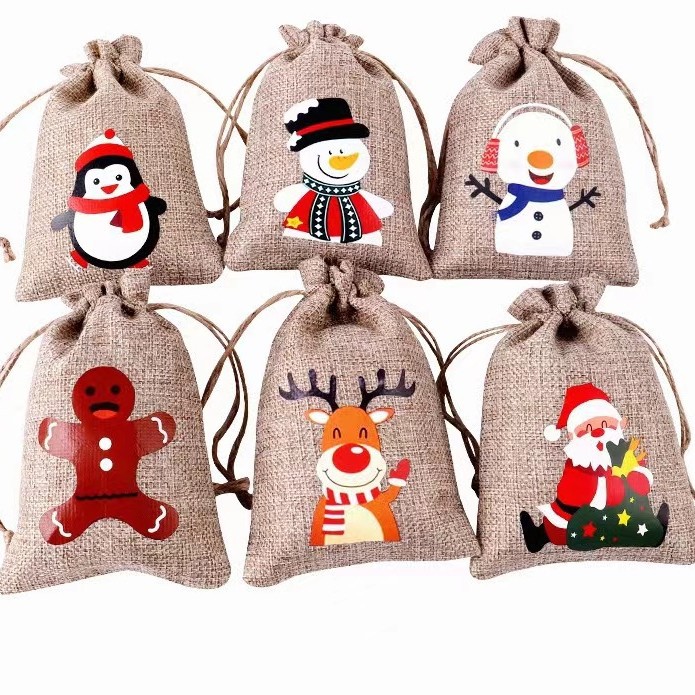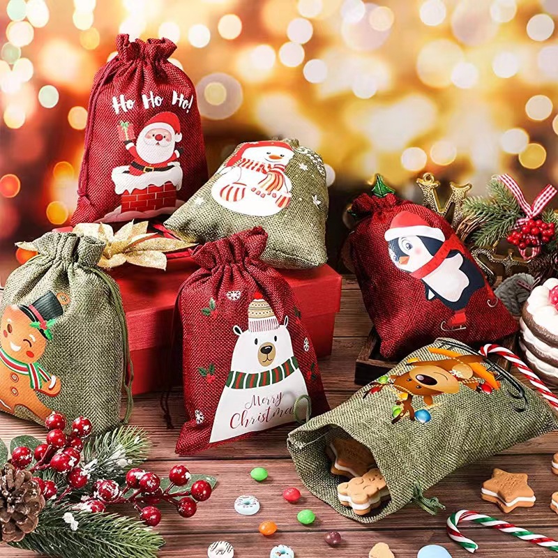 Рождественский льняной мешочек на завязках для подарков, праздничная упаковка для вина, конфет и других подарков