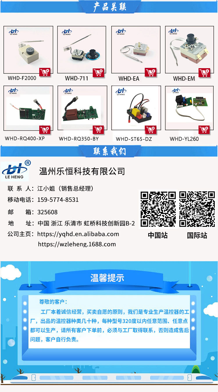 50-180度旋钮温控器WHD-250E烤肠机温控正方向不锈钢毛细管恒温器