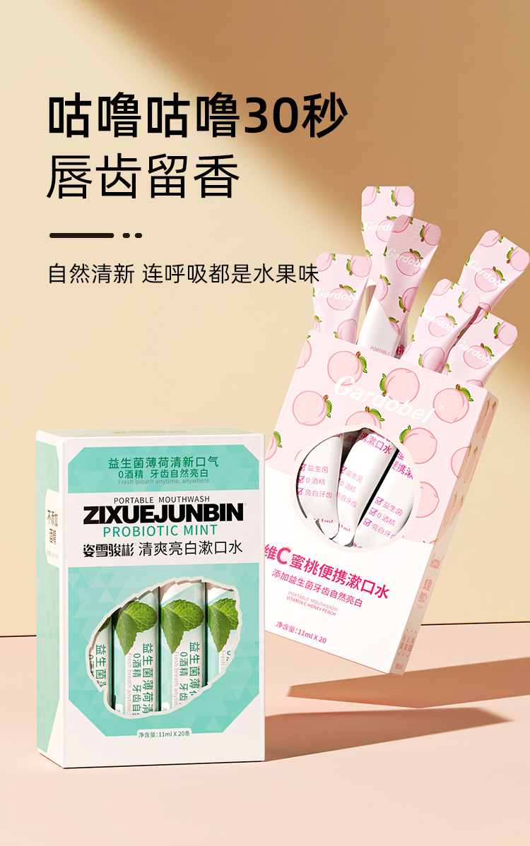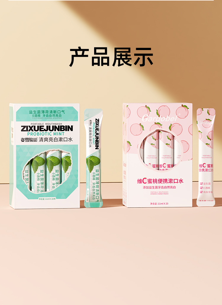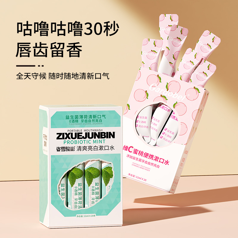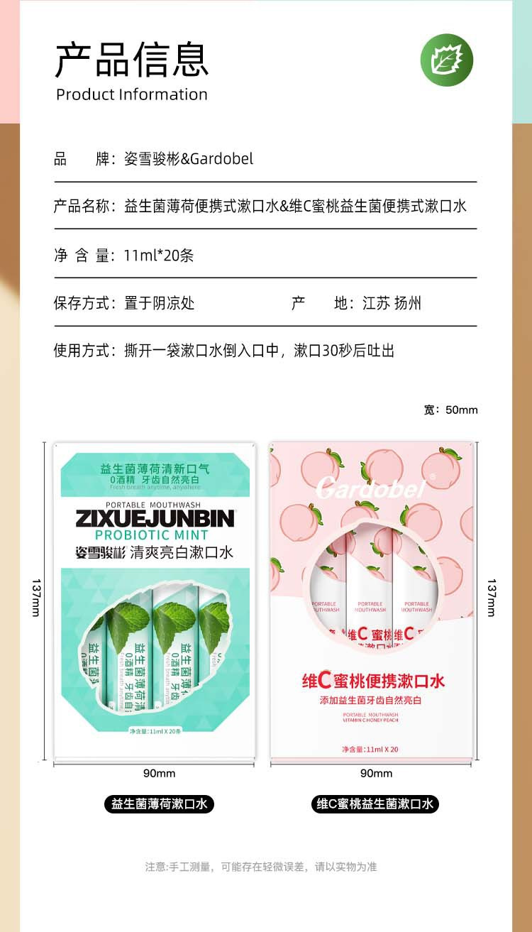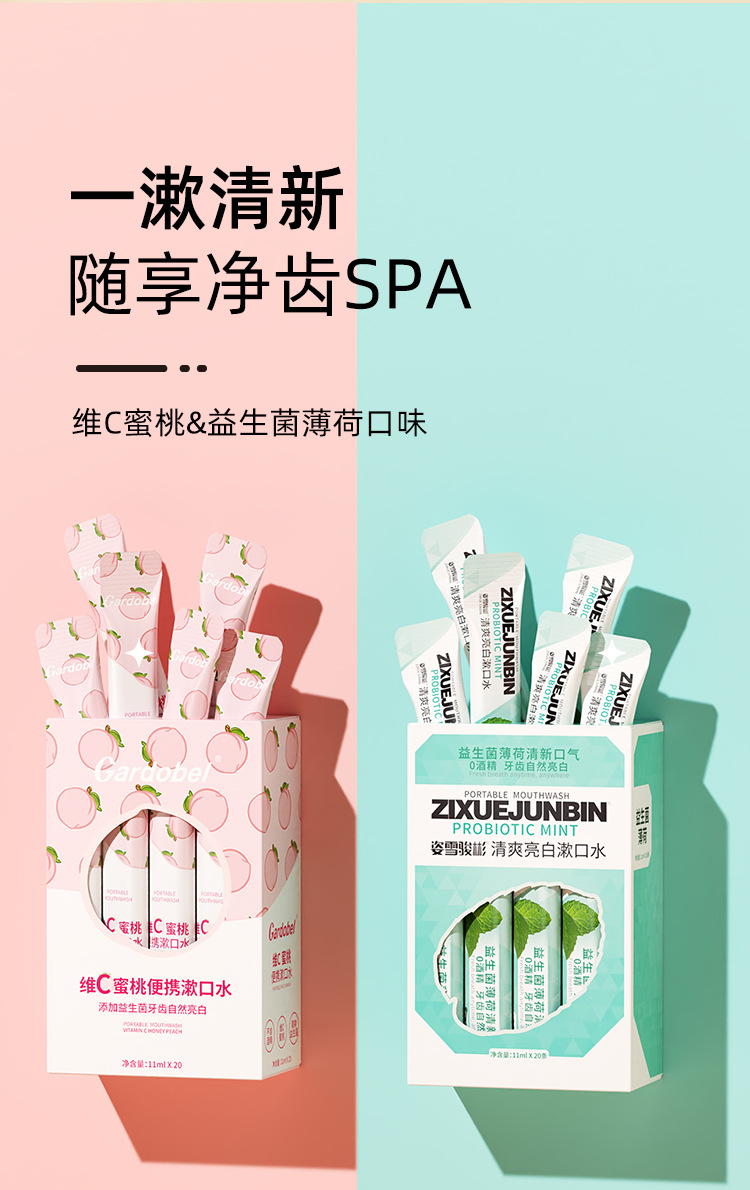 11ml * 20 персиковых полосок для полоскания рта; 11ml * 20 пробиотических полосканий для полоскания рта; 11 мл * 20 полосок свежего антимольного ополаскивателя для рта