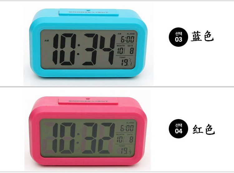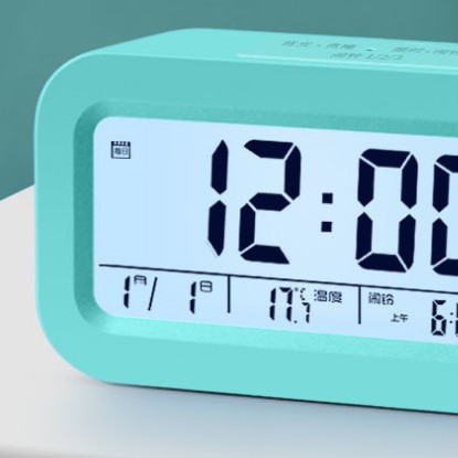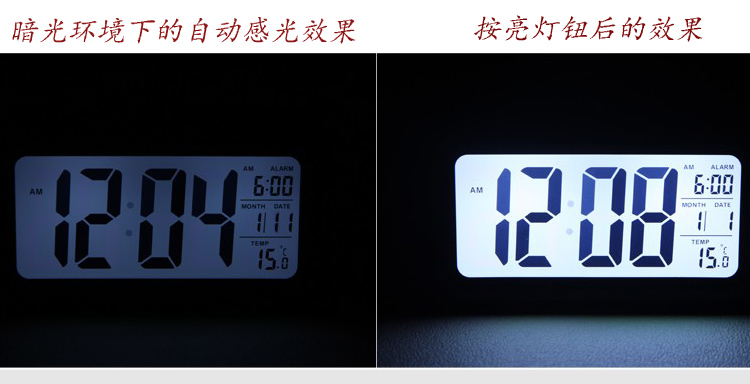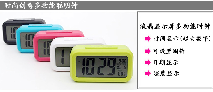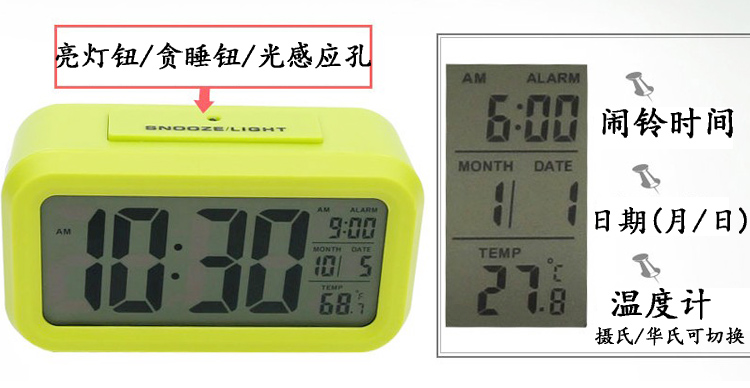 产品功能:时间+温度+万年历+星期显示,智能夜光,贪睡闹钟
