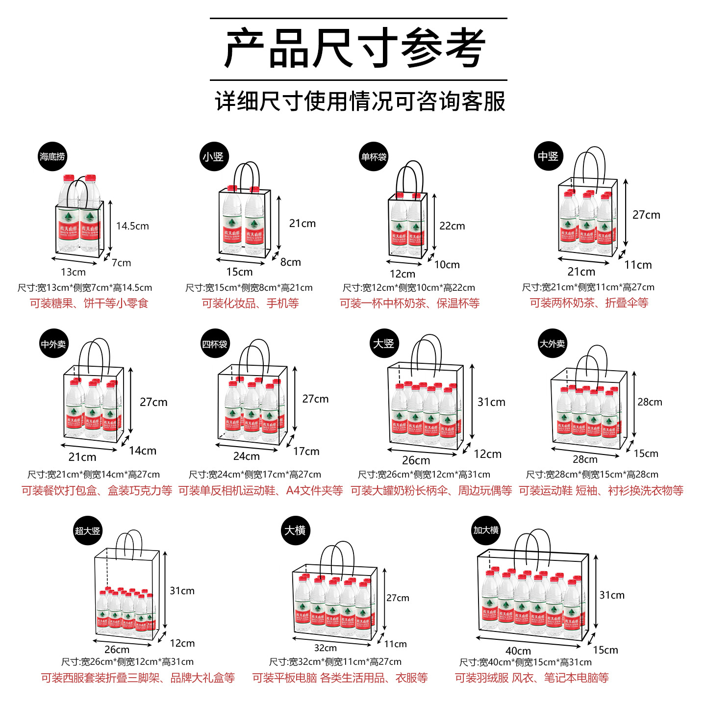 Маленькая вертикаль 15*8*21; Центр вертикальный 21*11*27; Китайская еда на вынос 21*14*27; Большой вертикальный 26*12*31; Большой горизонтальный 32*11*27; Большой на вынос 28*15*28; Одиночная чашка 12*10*22; Четыре чашки 24*17*27