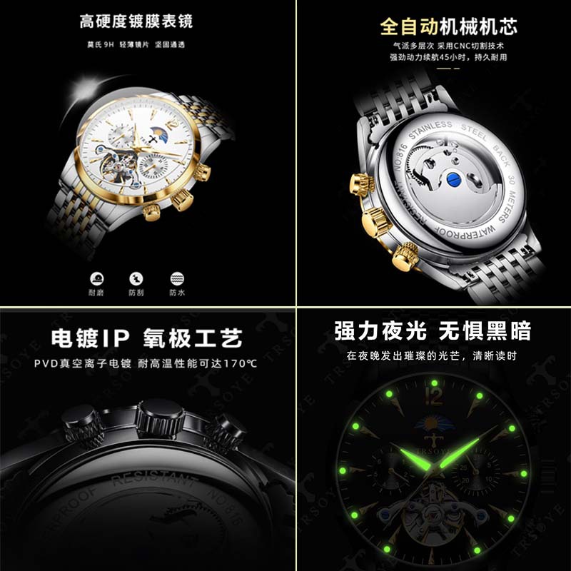 Швейцарский бренд, популярные полностью автоматические мужские механические часы, светящиеся водонепроницаемые часы, прямая трансляция, внешняя торговля, мужская дропшиппинг