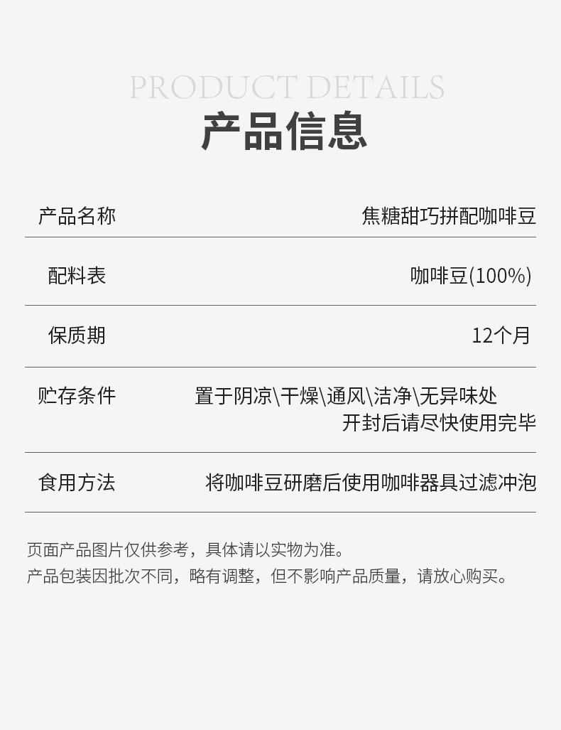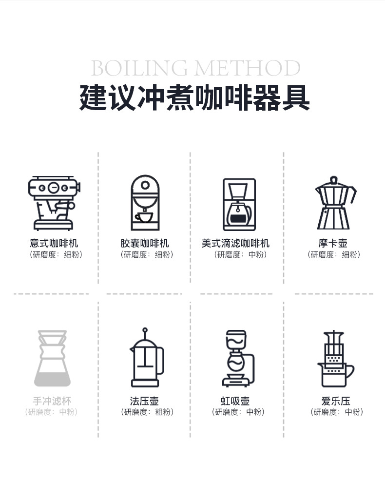 Кофейные зерна — 454 г/упаковка; Молотый порошок - средний порошок (дрип-фильтр); Мелкий порошок - крупный порошок (французское давление); Мелкоизмельчённая мука (итальянский стиль)