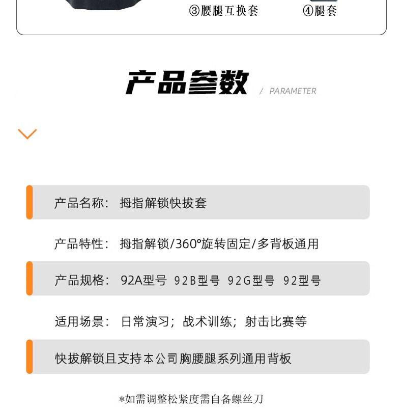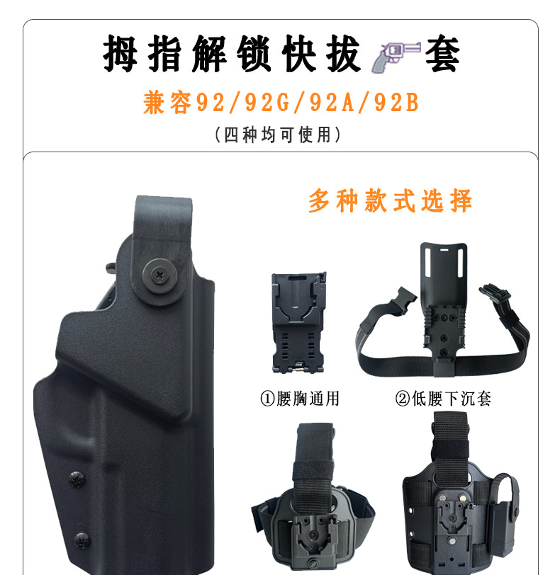 Кобура для большого пальца с 2 сетками 92А (поясной ремень); Кобура для большого пальца с 3 сетками 92А (жилет); 92a обмен талией и ногами для большого пальца; 92a рукав для большого пальца; 92a раковина с низкой талией и большим пальцем