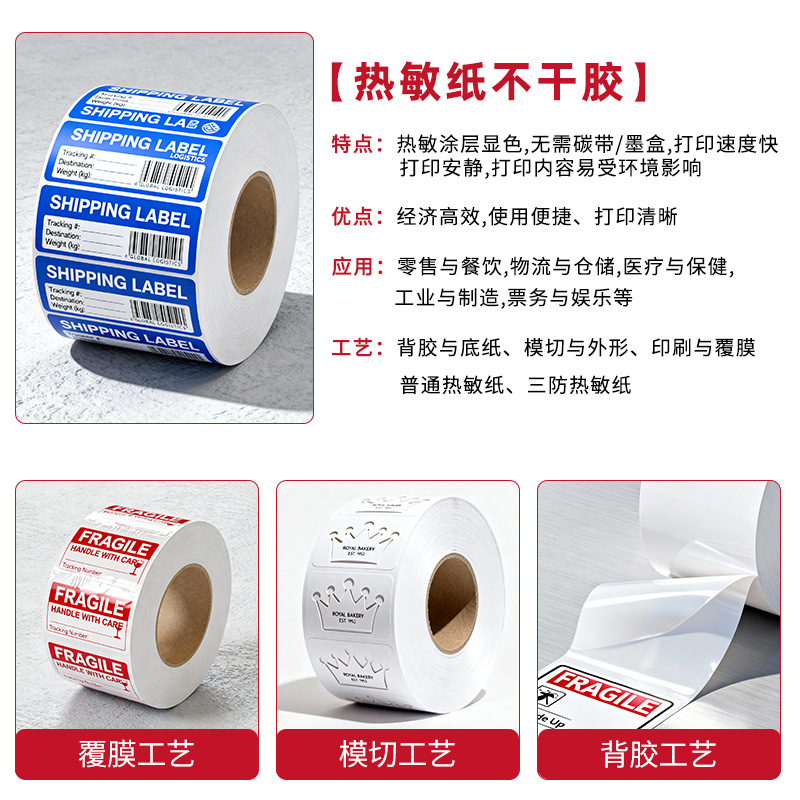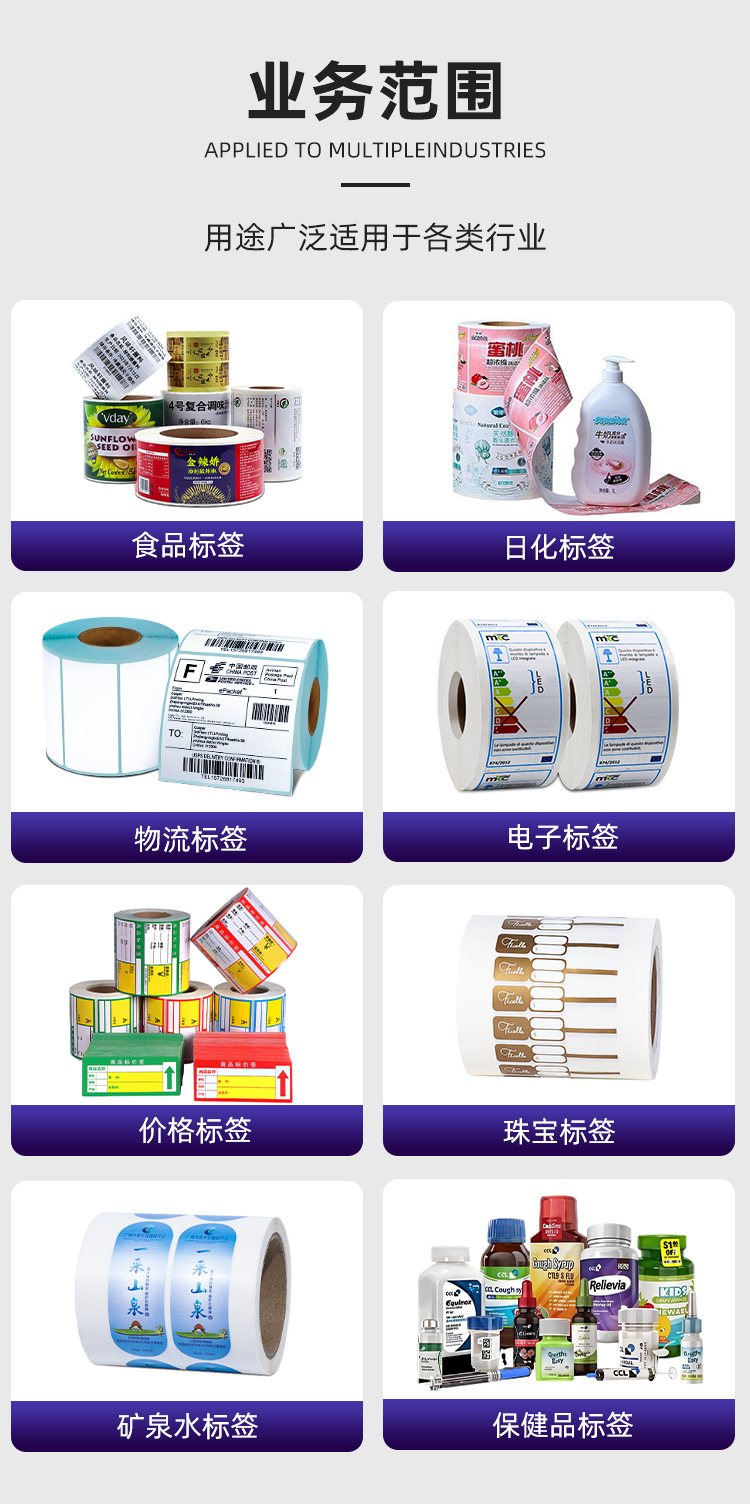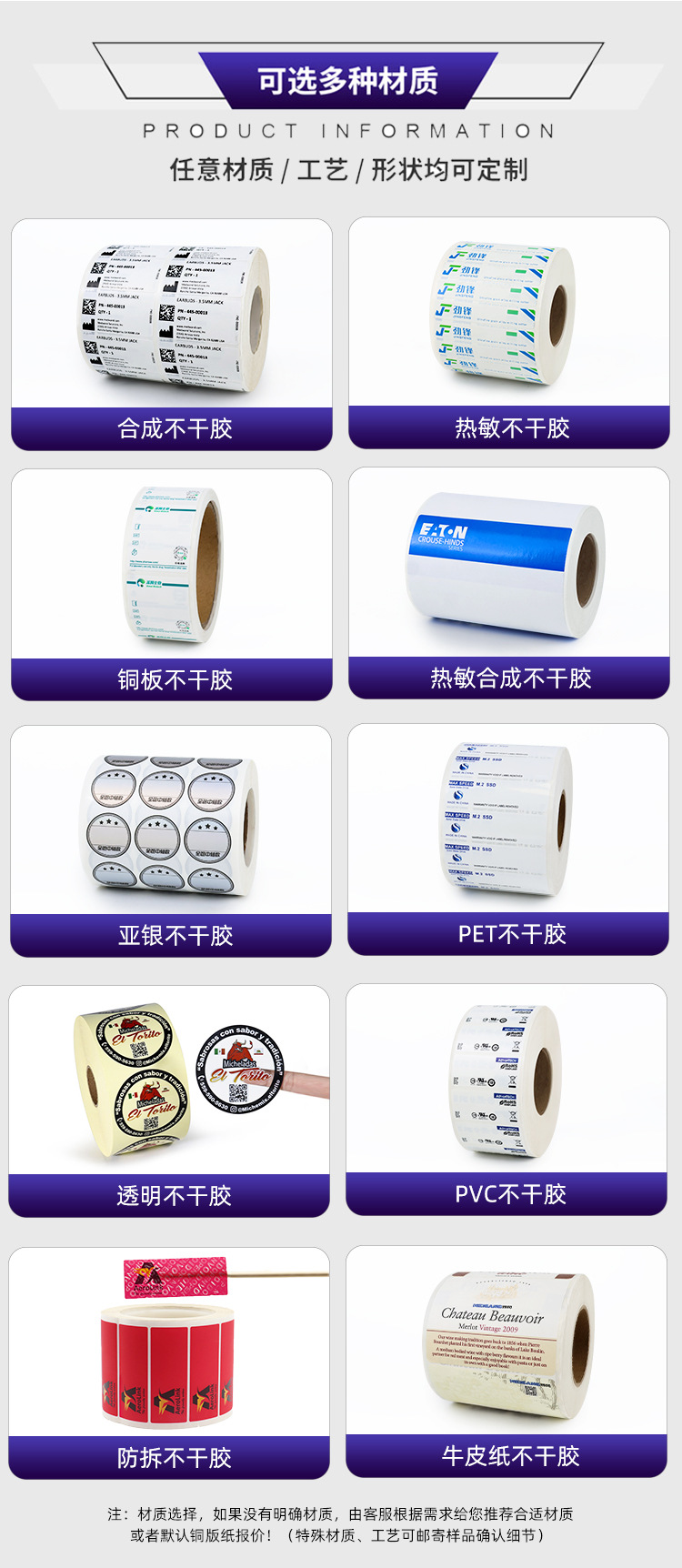 самоклеящиеся этикетки; Термосамоклеящиеся этикетки; Медные самоклеящиеся этикетки; Самоклеящаяся этикетка матового серебра.; Синтетические самоклеящиеся этикетки.; Прозрачная самоклеящаяся этикетка.; Хрупкая бумажная самоклеящаяся этикетка.; пустая самоклеящаяся этикетка; Самоклеящаяся этикетка из крафт-бумаги.; Лазерные самоклеящиеся этикетки; Самоклеящиеся этикетки с горячим тиснением