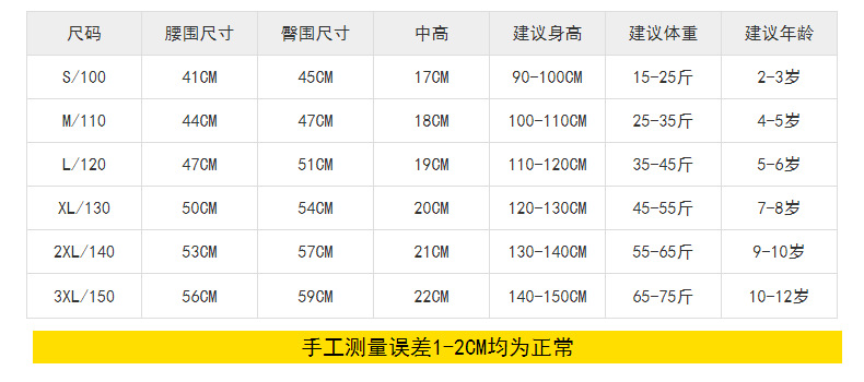 S/100 [15-25 кг]; M/110 [25-35 кг]; L/120 [35-45 кг]; XL/130 [45-55 кг]; 2XL/140 [55-65 кг]; 3XL/150 [65-75 кг]