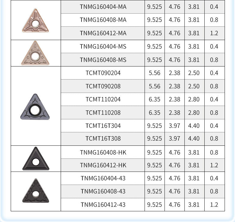 TNMG160408L-PV(LPC302); TNMG160408R-PV(LPC302); Стальные детали TNMG160408L-PV (LPC202); Стальные детали TNMG160408-43(LPC202); Стальные детали TNMG160408-43(LPC302); Нержавеющая сталь TNMG160404-TM(LMC302); Стальные детали TNMG160404-TM(LPC312); Стальные детали TNMG160404-TM(LPC202); Стальные детали TNMG160404-TM(LPC302); Стальные детали TNMG160408-TM (LPC202); Стальные детали TNMG160408-TM(LPC302); Чугун TNMG160408-HK(LKC302); Чугун TNMA160408(LKC302); TNMG160404-MA(LMP302); Средне-твердый TNMG160404-MA (LMP202); Закаленный TNMG160404-MA(LMP102); Титановый сплав TNMG160404-MA(LSP302); Высокотемпературный сплав TNMG160404-MA(LSP312); TNMG160408-MA(LMP302); TNMG160408-MA(LMP202); TNMG160412-MA(LMP302); Закаленный TNMG160408-MA(LMP102); Титановый сплав TNMG160408-MA(LSP102); Закаленный TNMG160412-MA(LMP102); TNMG160404-MS(LMP302); Закаленный TNMG160404-MS(LMP102); Титановый сплав TNMG160404-MS(LSP302); Высокотемпературный сплав TNMG160404-MS (LSP312); TNMG160408-MS(LMP302); Закаленный TNMG160408-MS(LMP102); TCMT090204(LMP202); TCMT110204(LMP202); TCMT110208(LMP202); TCMT16T304(LMP302); Чугун TCMT16T304 (LKC302); Высокотемпературный сплав TCMT16T304 (LSP312); Чугун TCMT16T308 (LKC302); TCMT16T308(LMP302); Закаленный TCMT16T308 (LMP102); Стальные детали TCMT16T308 (LPC302)
