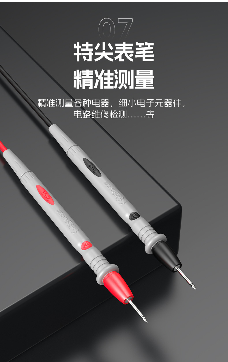 功能:支持通断测试、二极管测试、温度测量、频率测量、 空占比测量 、火线判别,智能语音播报、自动识别、自动关机、相对值测试、电场感应测试等