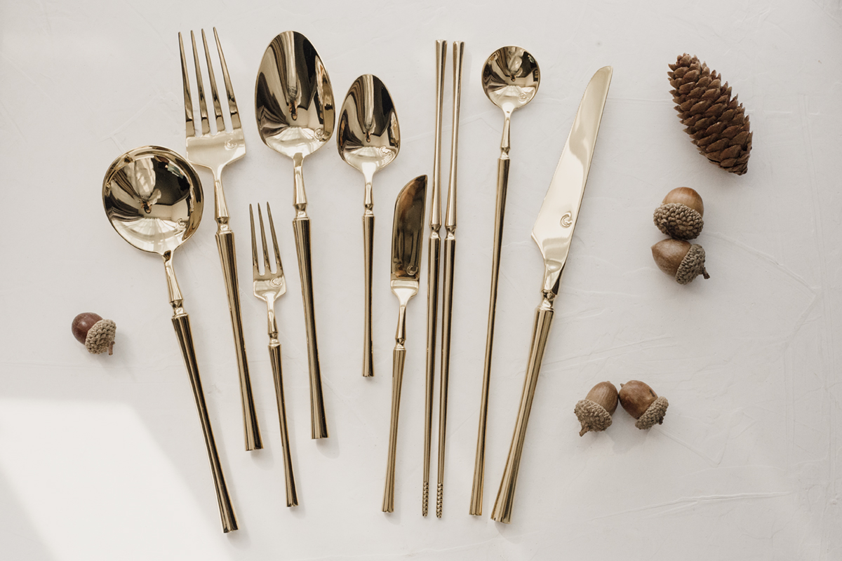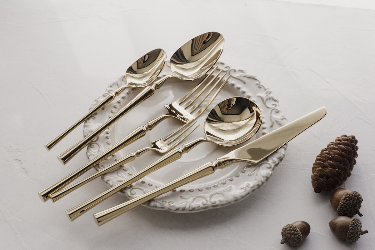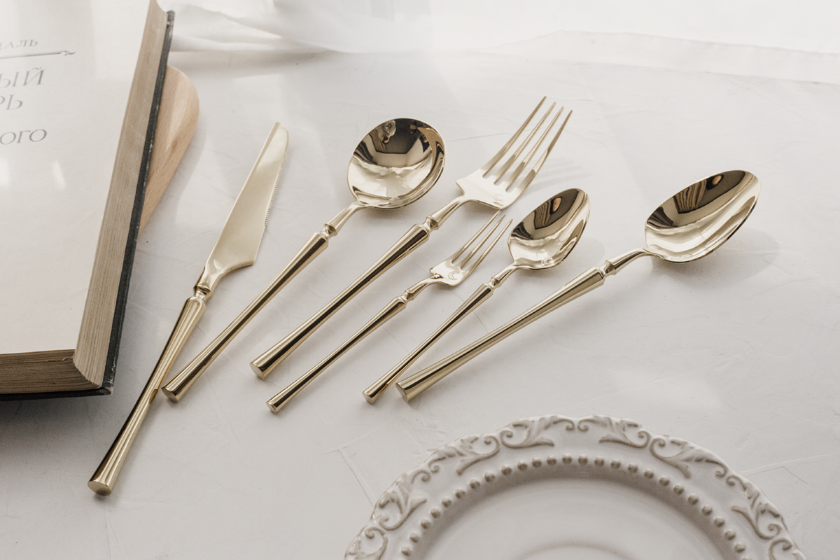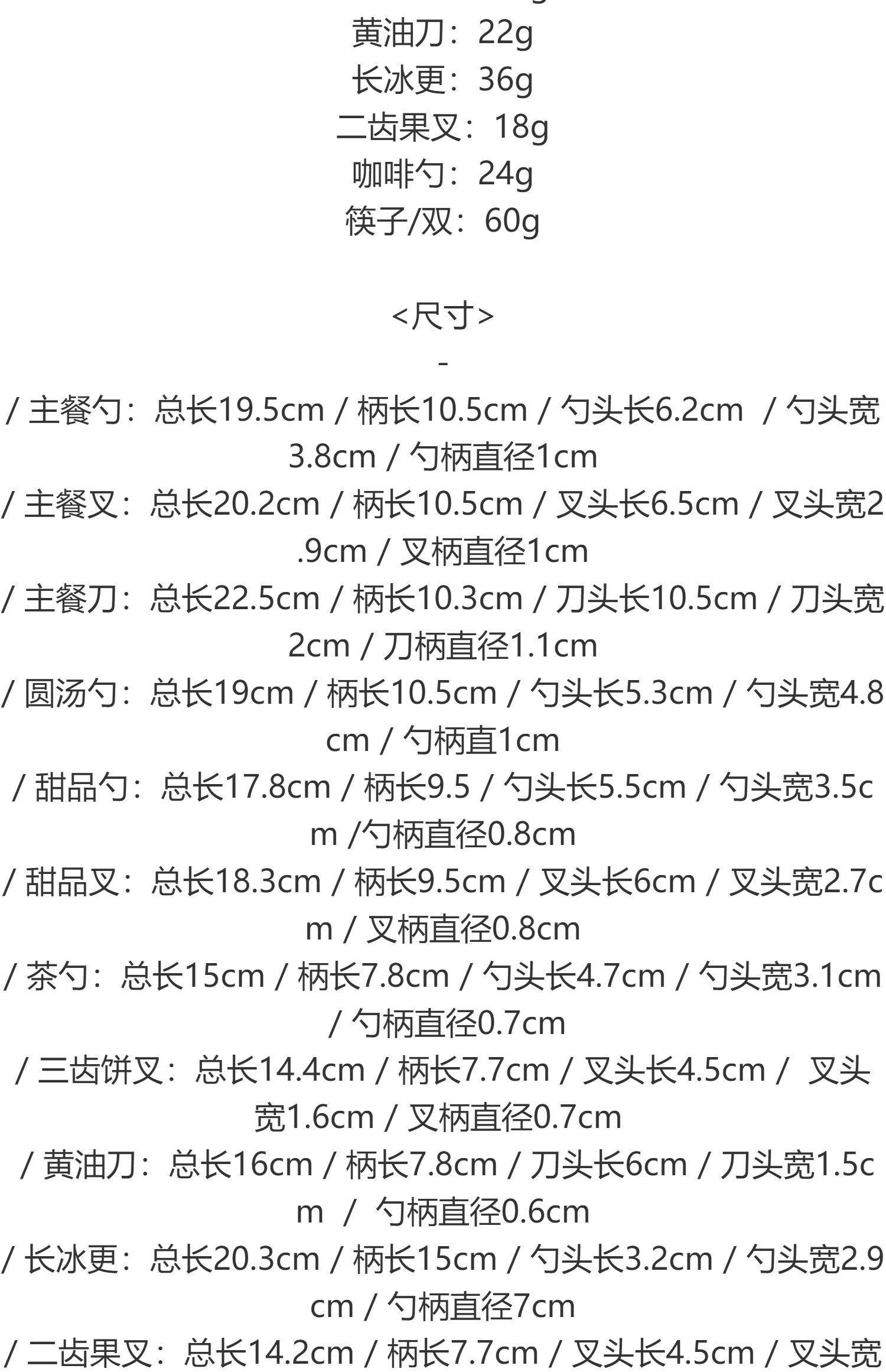 Основной столовый нож [длина 22,5 см]; Основная вилка [длина 20 см]; Основная столовая ложка [длина 19,5 см]; Круглая ложка [длина 19 см]; Десертная ложка [длина 17,8 см]; Десертная вилка [длина 18,3 см]; Чайная ложка [длина 15см]; Вилка для торта с тремя зубьями [длина 14,4 см]; Кофейная ложка [длина 13,2 см]; Выделка для фруктов с двумя зубьями [длина 14,2 см]; Нож для масла [длина 16 см]; Длинный лед еще лучше [длина 20,3 см]; Японские палочки/пара [длина 23 см]