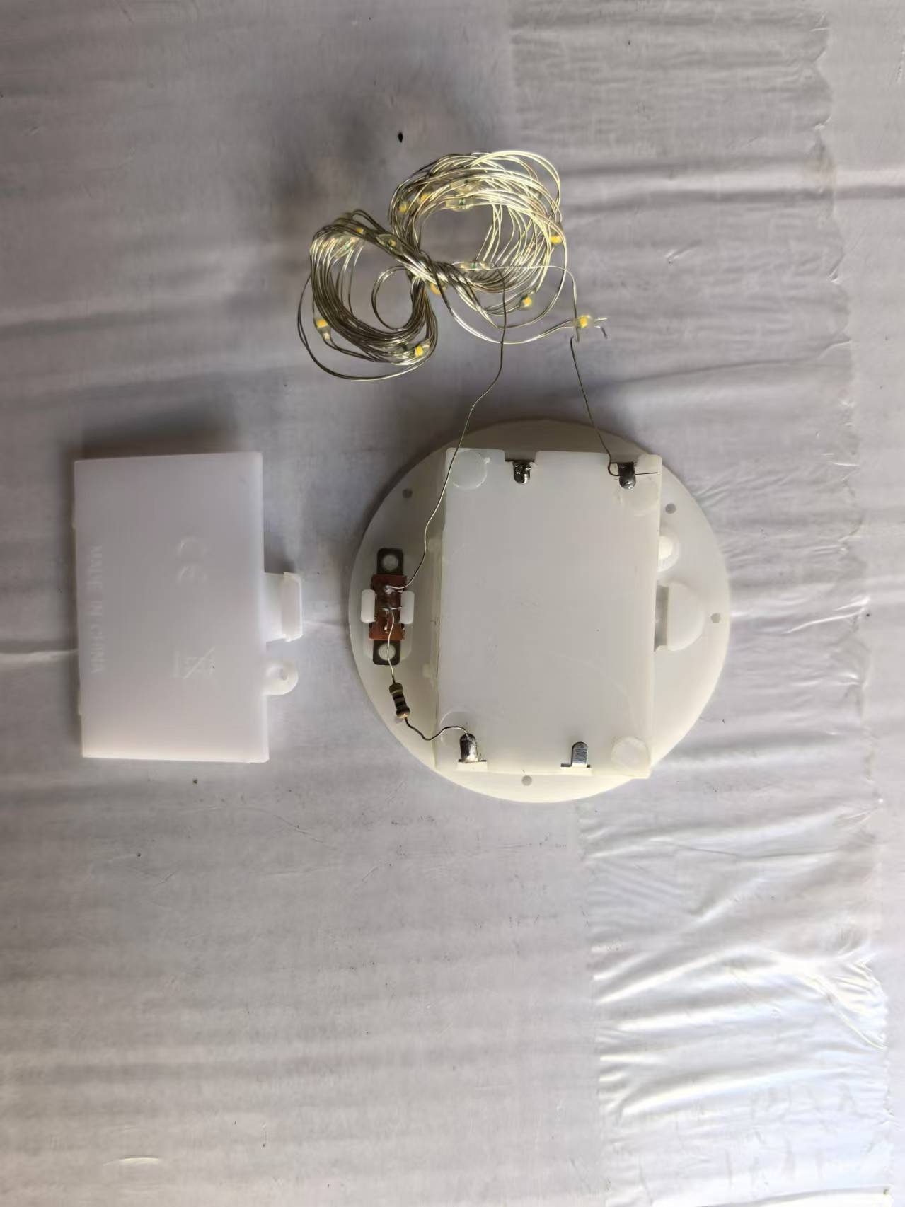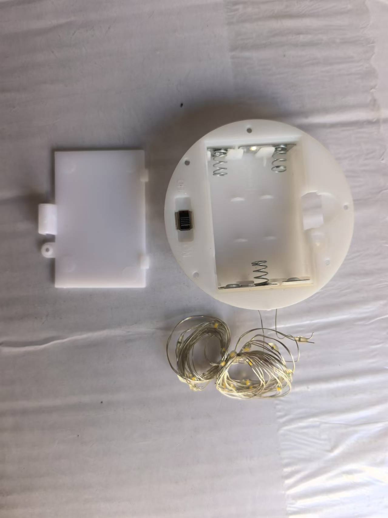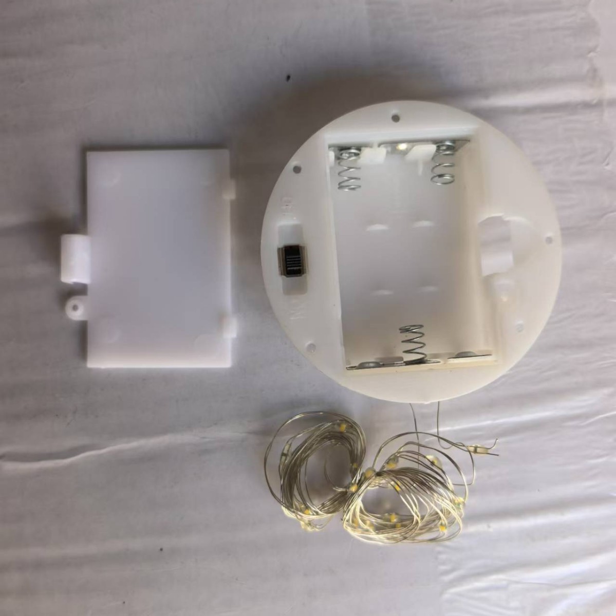 此链接为配件电池盒灯-65MM直径实际尺寸是直径64MM*厚度13.5(各长度各灯数可定做),不含木底座,不含电池,产品包装(如下图),一袋一捆,100个一捆,不卷线,工人安装时:线拉直,尾端也拉直,然后用重点东西压着尾端,用一个,抽一个,这样不怕绞到其他线,工人很方便的直接穿过底座拉出来。