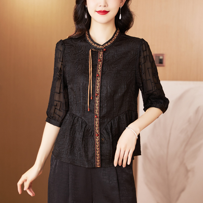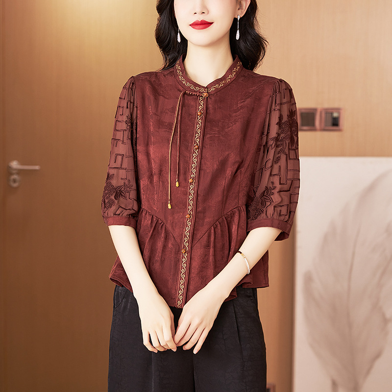 Высококачественная знаменитая ароматная облачная пряжа топ женский 2024 весна и лето новый ретро вышивка имитация шелковая рубашка женский