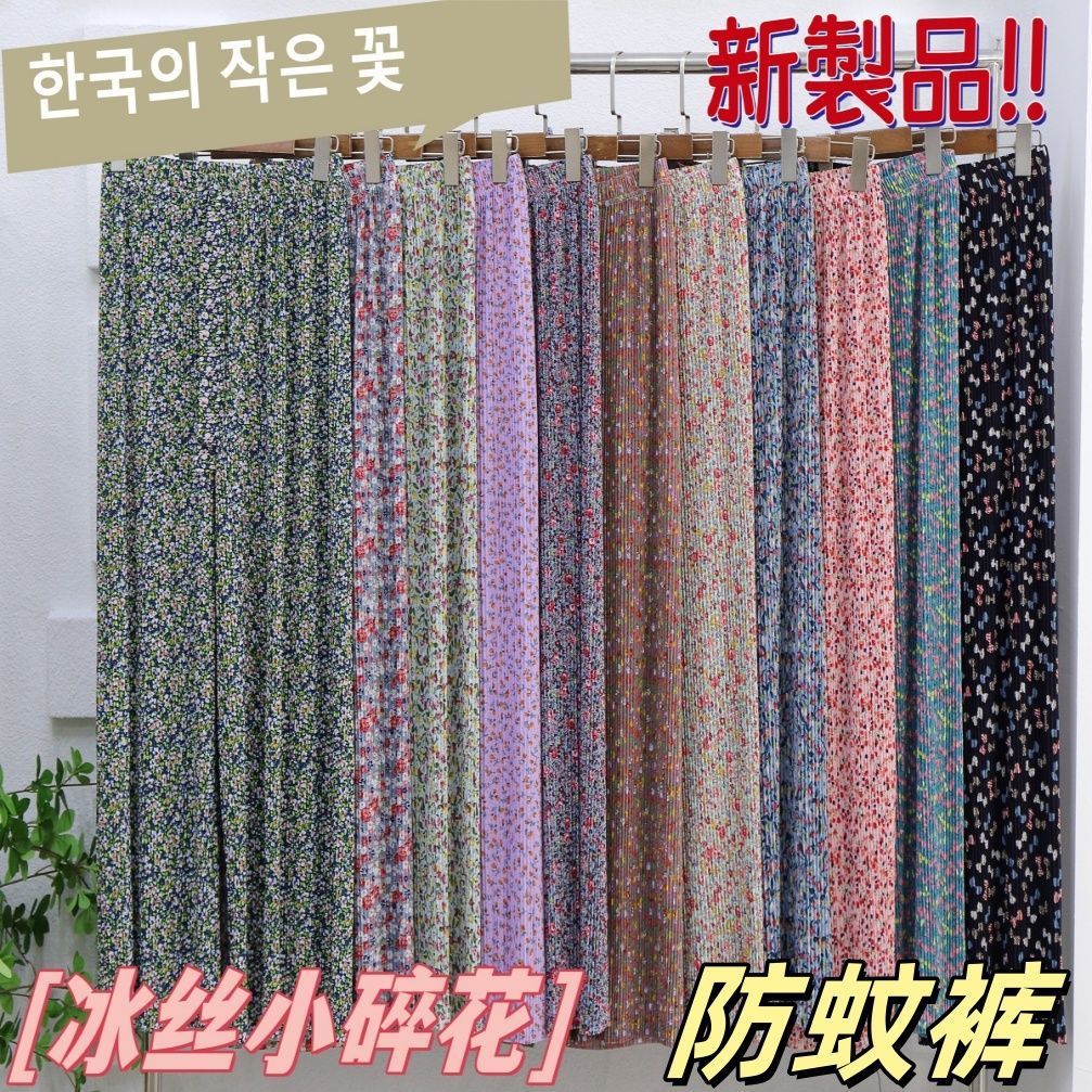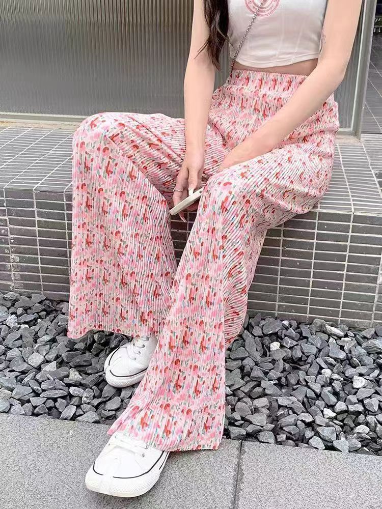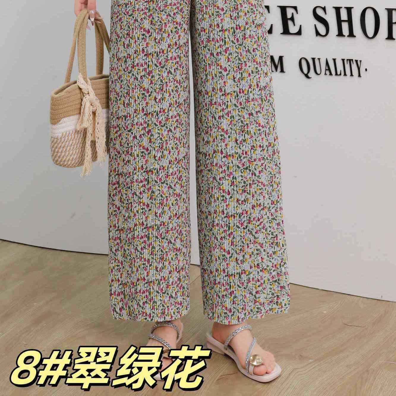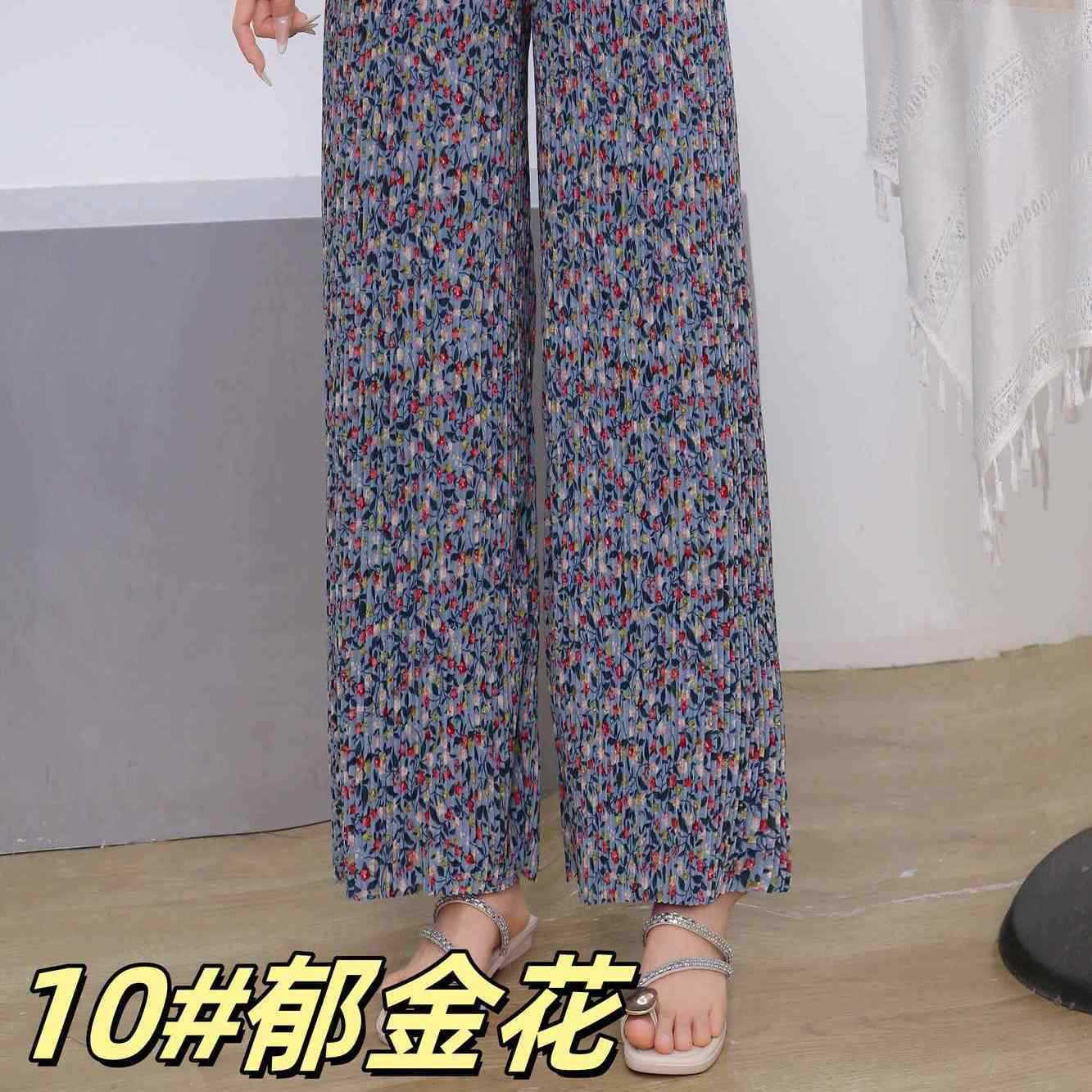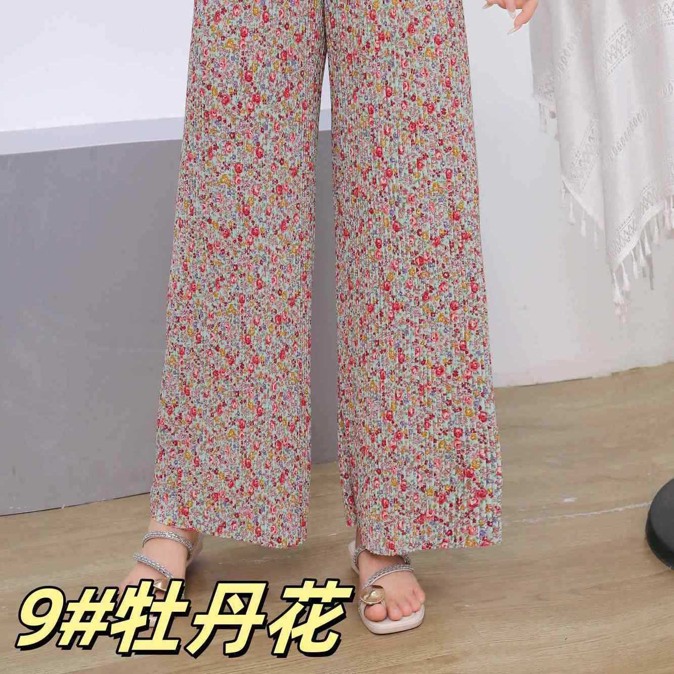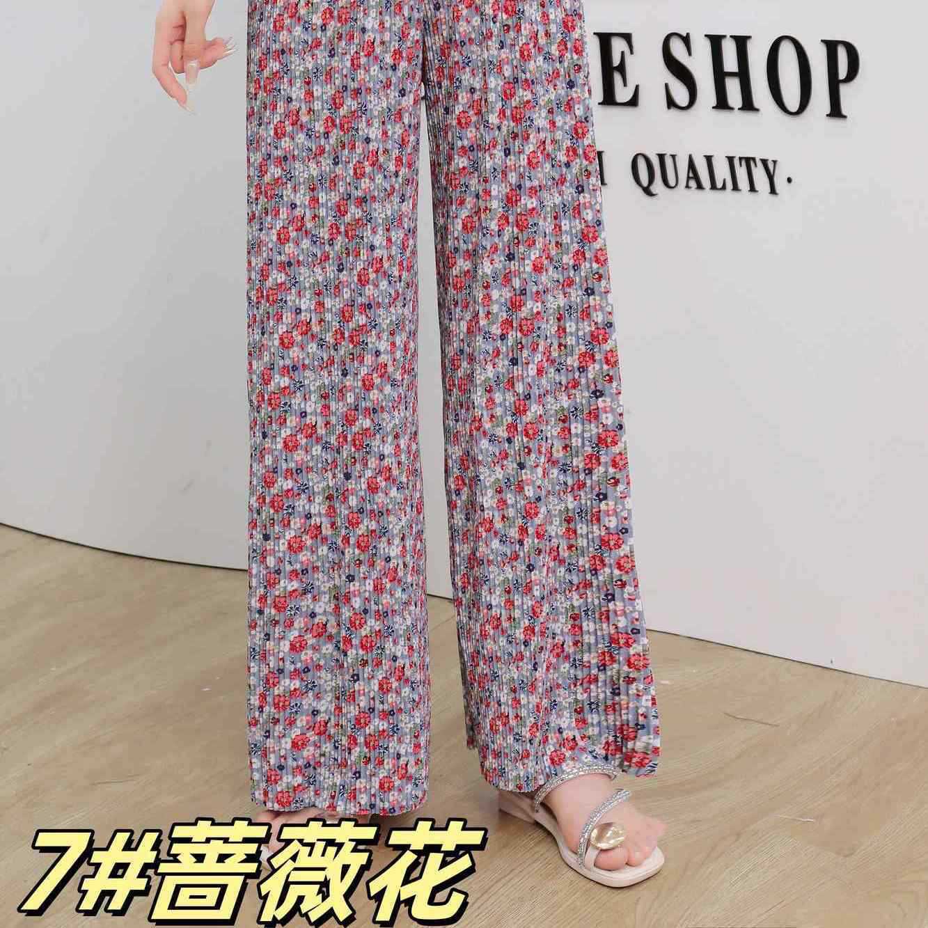 Корейские плиссированные широкие брюки из ледяного шелка с цветочным принтом, повседневные солнцезащитные пляжные крутые брюки, летние домашние прогулочные повседневные брюки