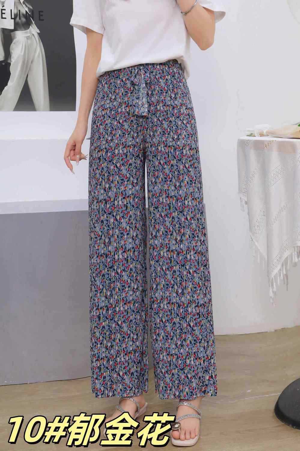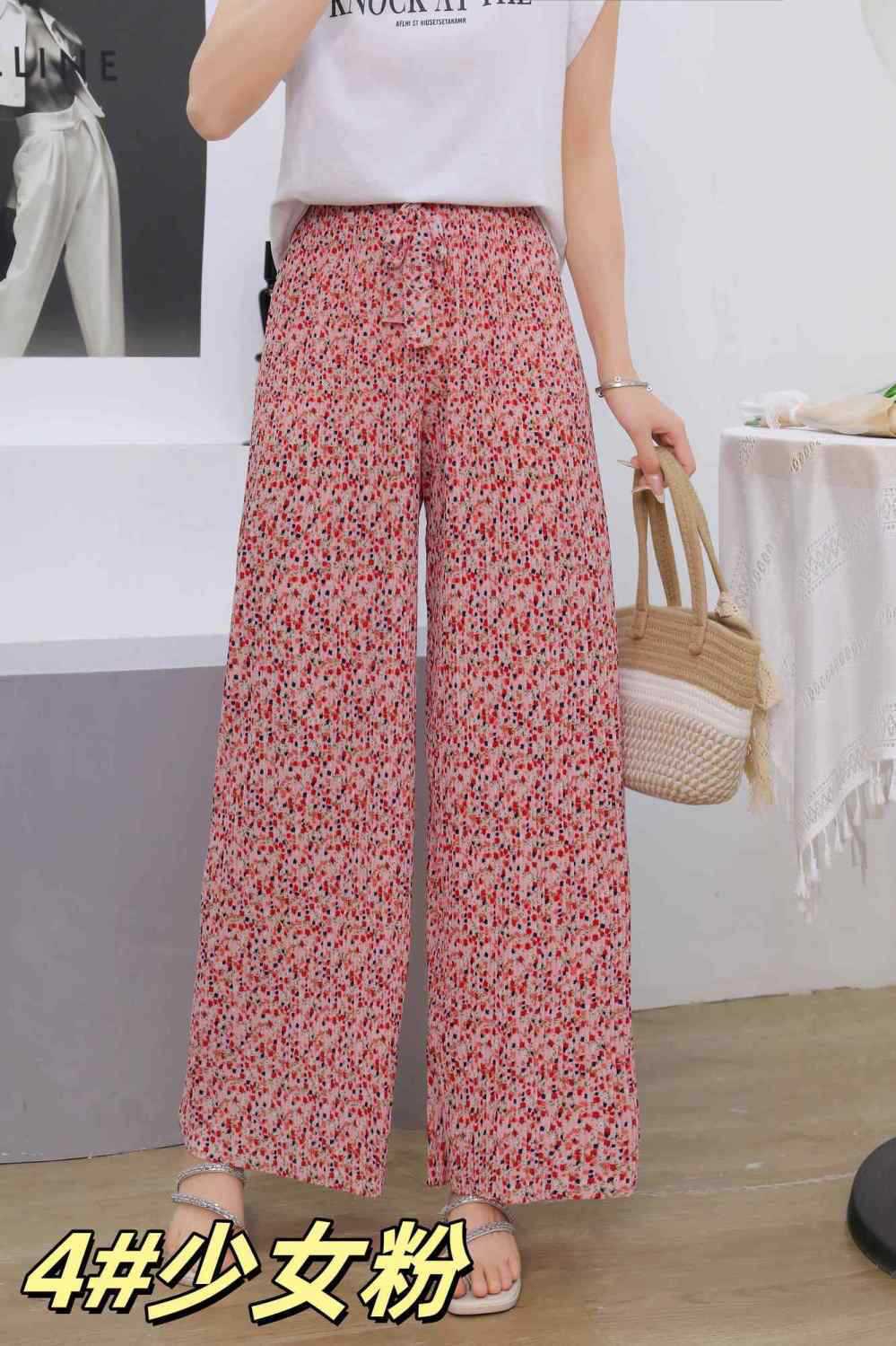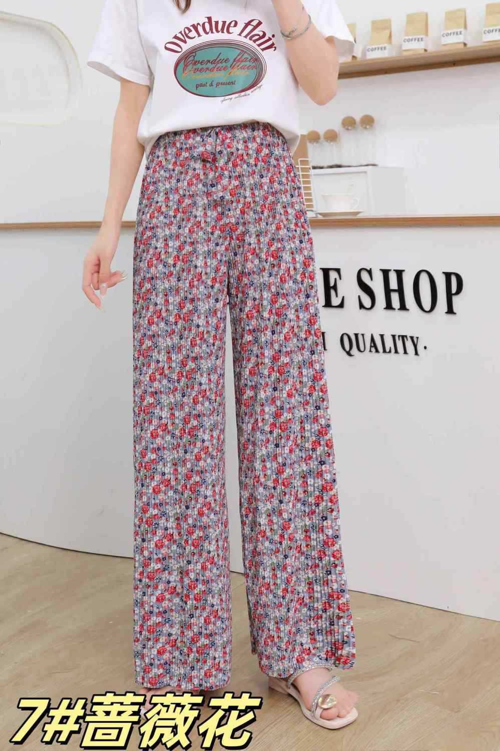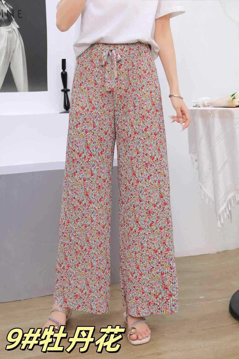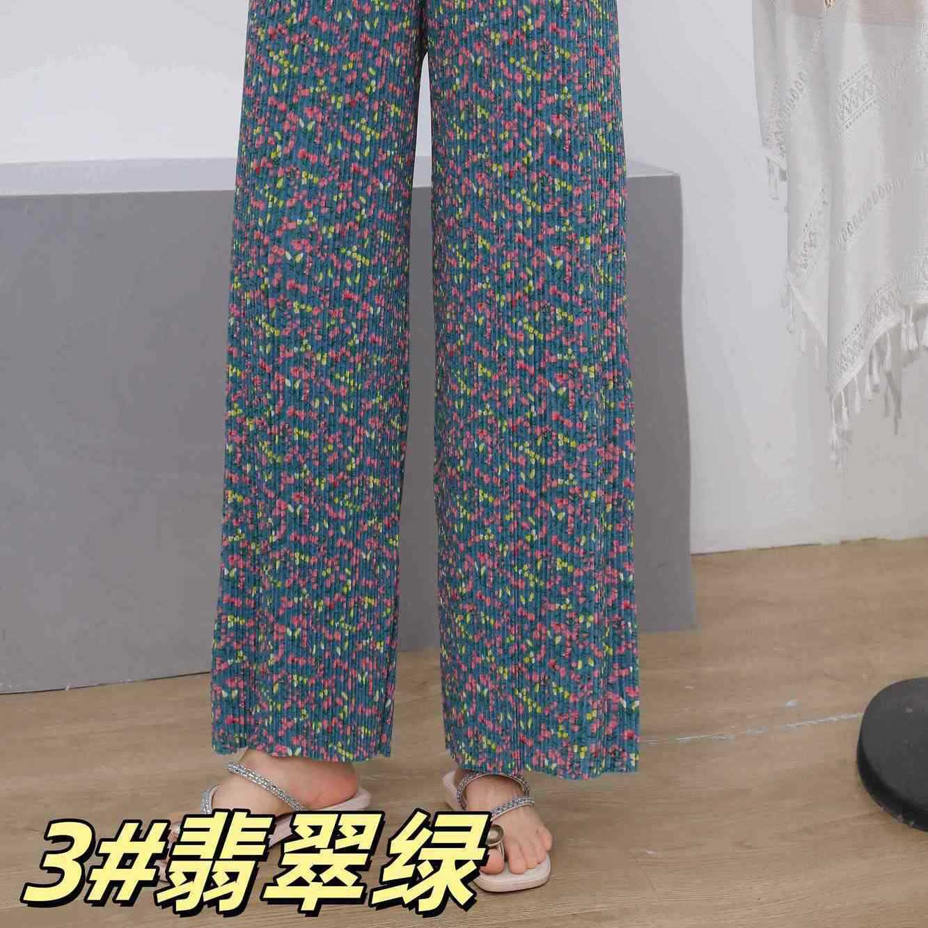 Корейские плиссированные широкие брюки из ледяного шелка с цветочным принтом, повседневные солнцезащитные пляжные крутые брюки, летние домашние прогулочные повседневные брюки