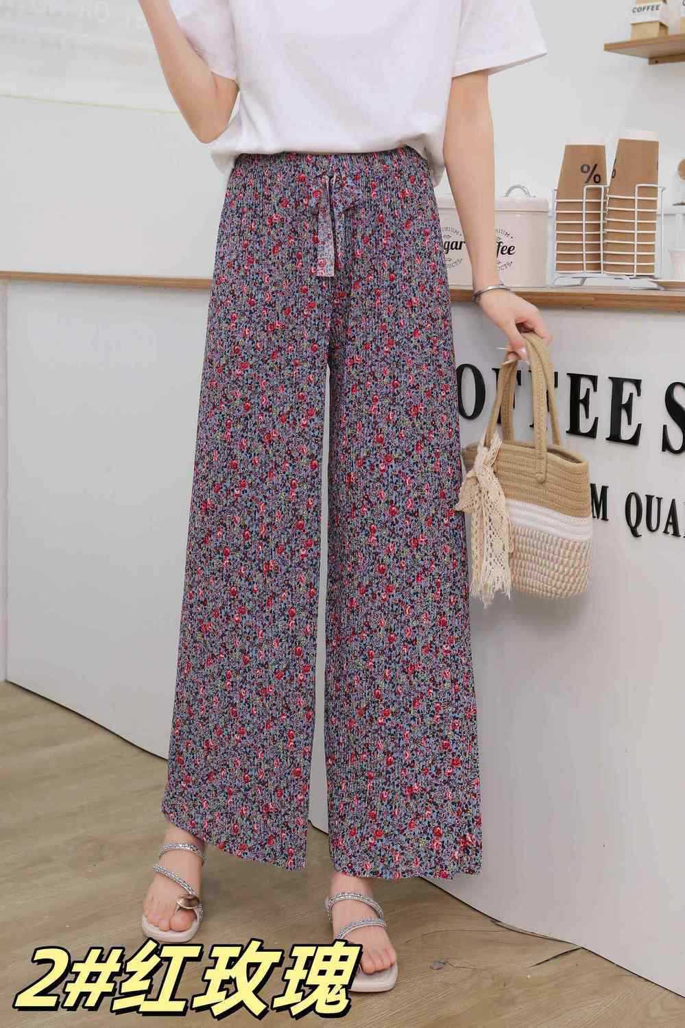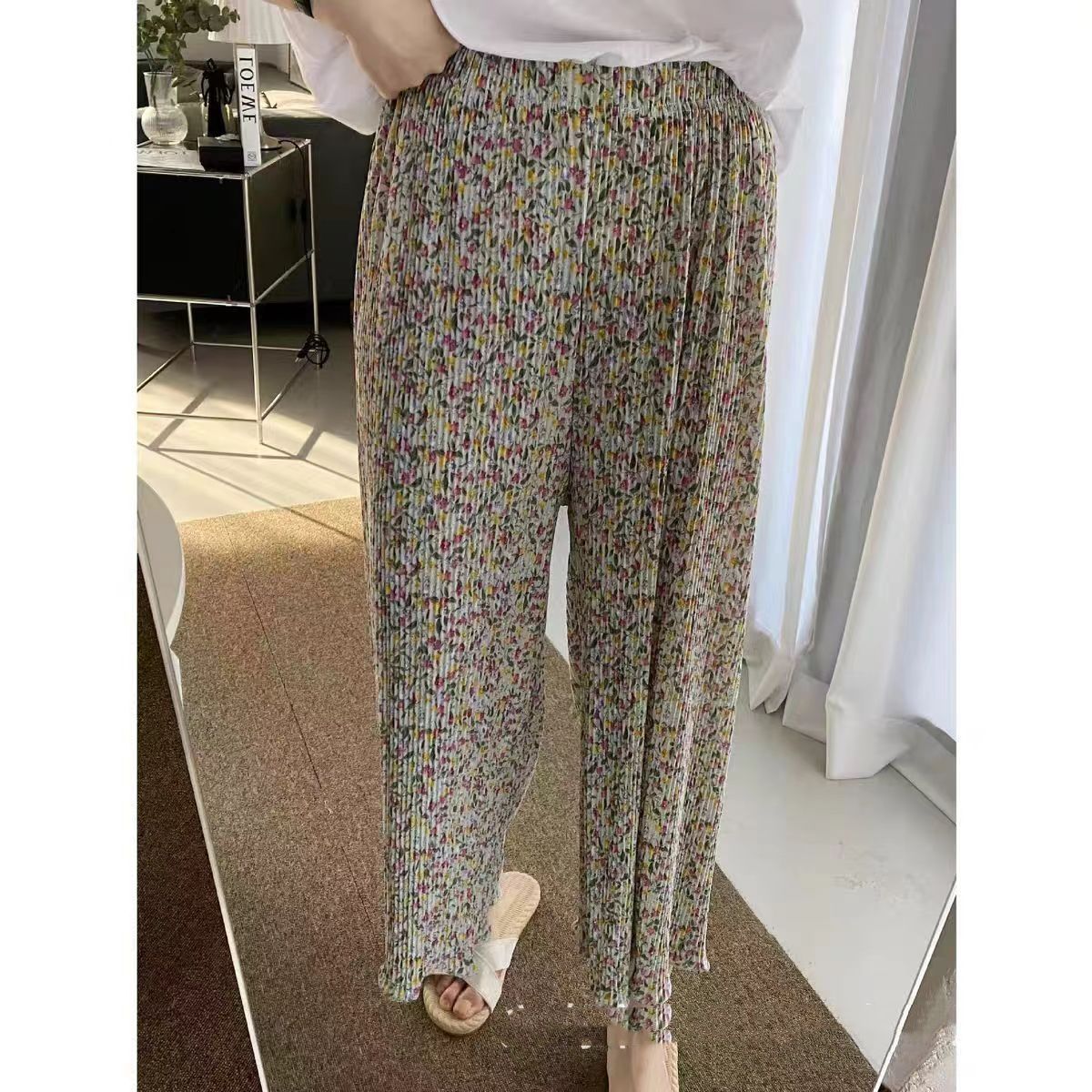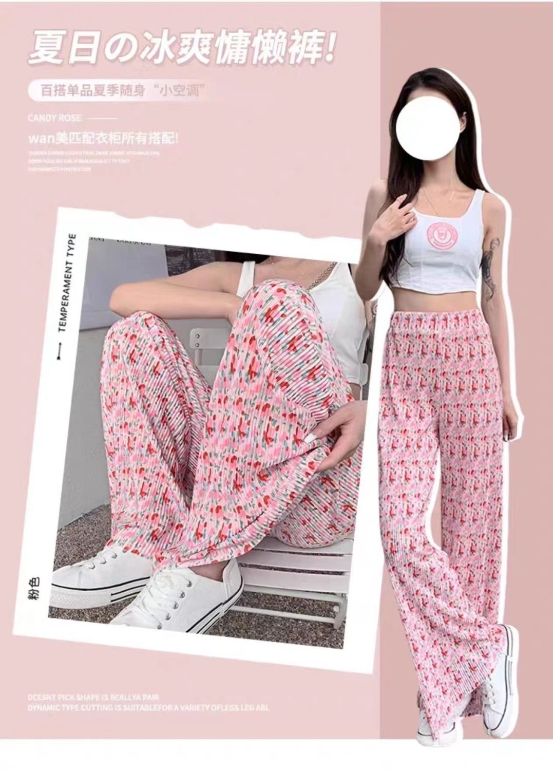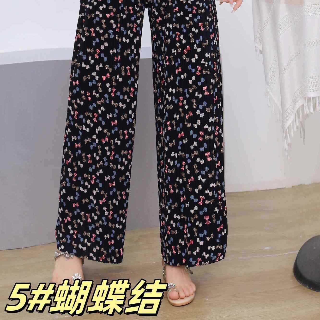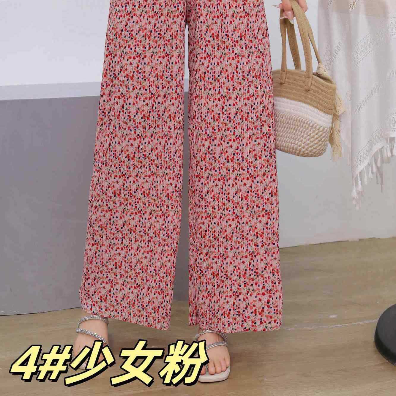 Корейские плиссированные широкие брюки из ледяного шелка с цветочным принтом, повседневные солнцезащитные пляжные крутые брюки, летние домашние прогулочные повседневные брюки