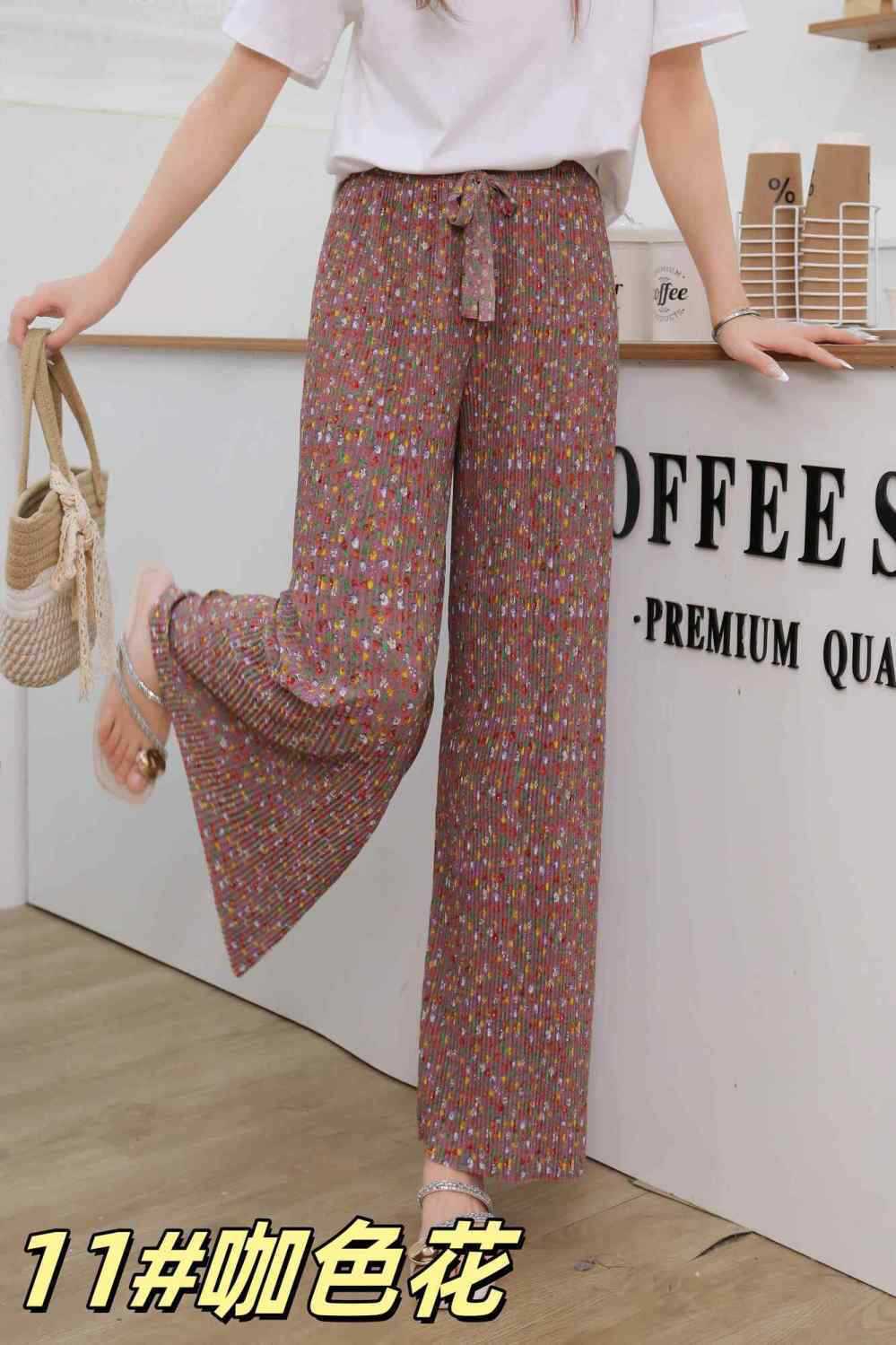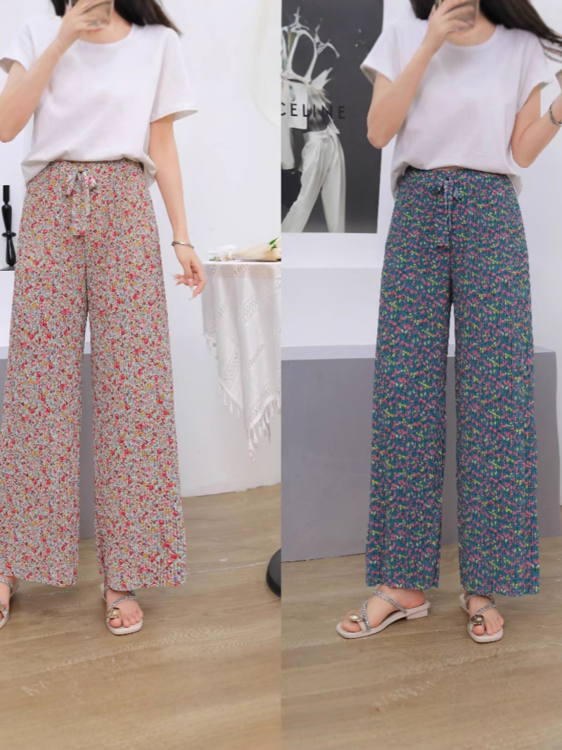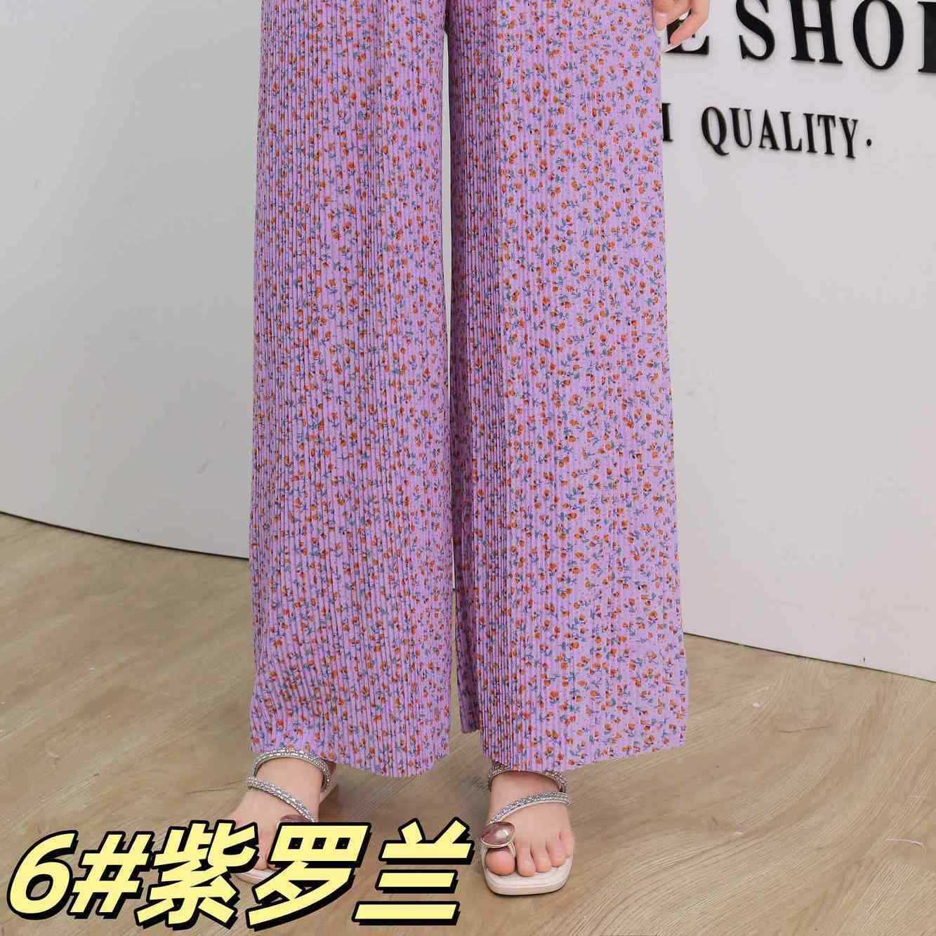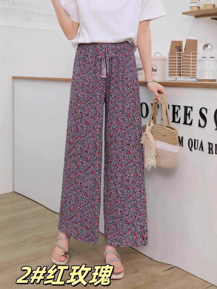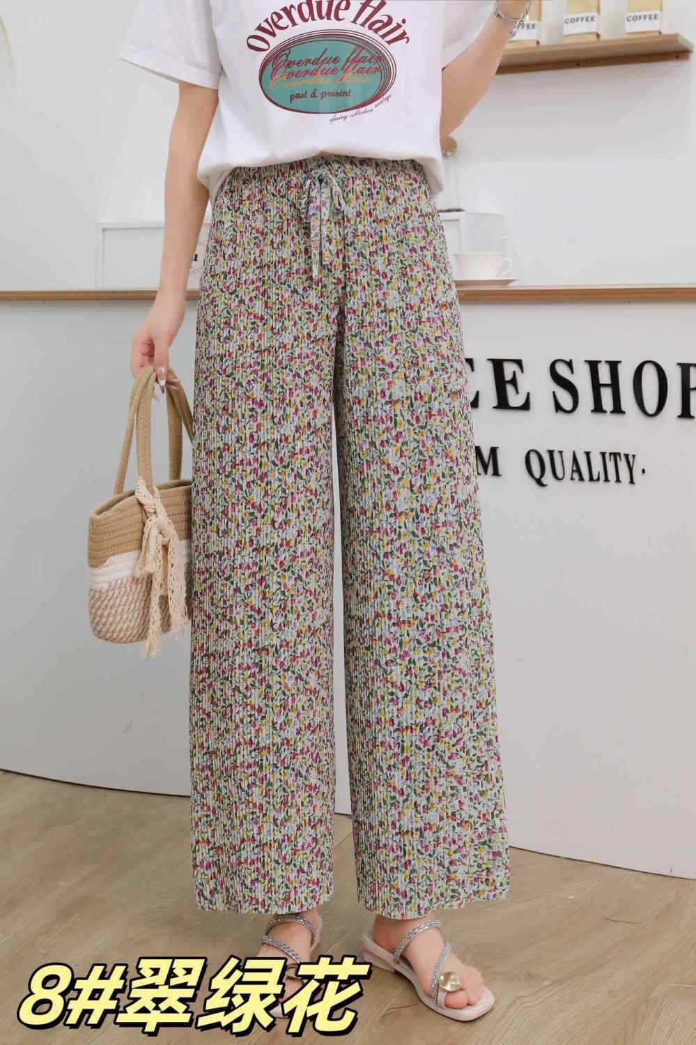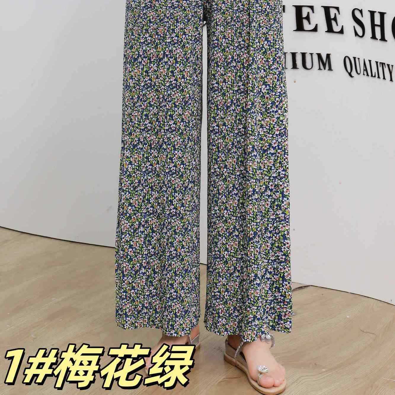 Корейские плиссированные широкие брюки из ледяного шелка с цветочным принтом, повседневные солнцезащитные пляжные крутые брюки, летние домашние прогулочные повседневные брюки