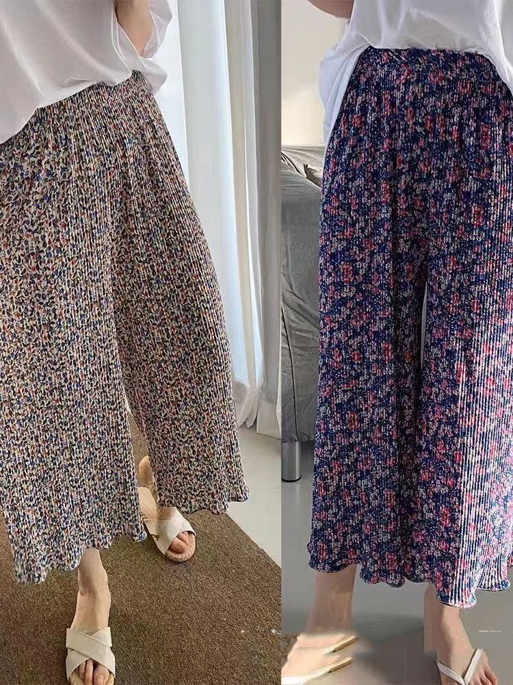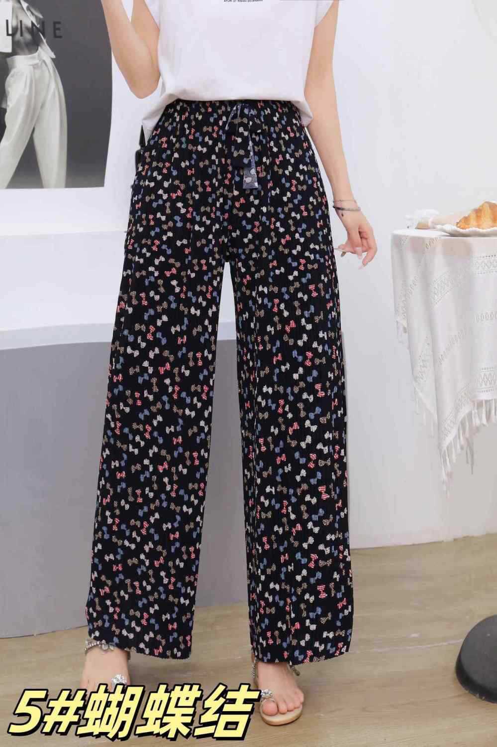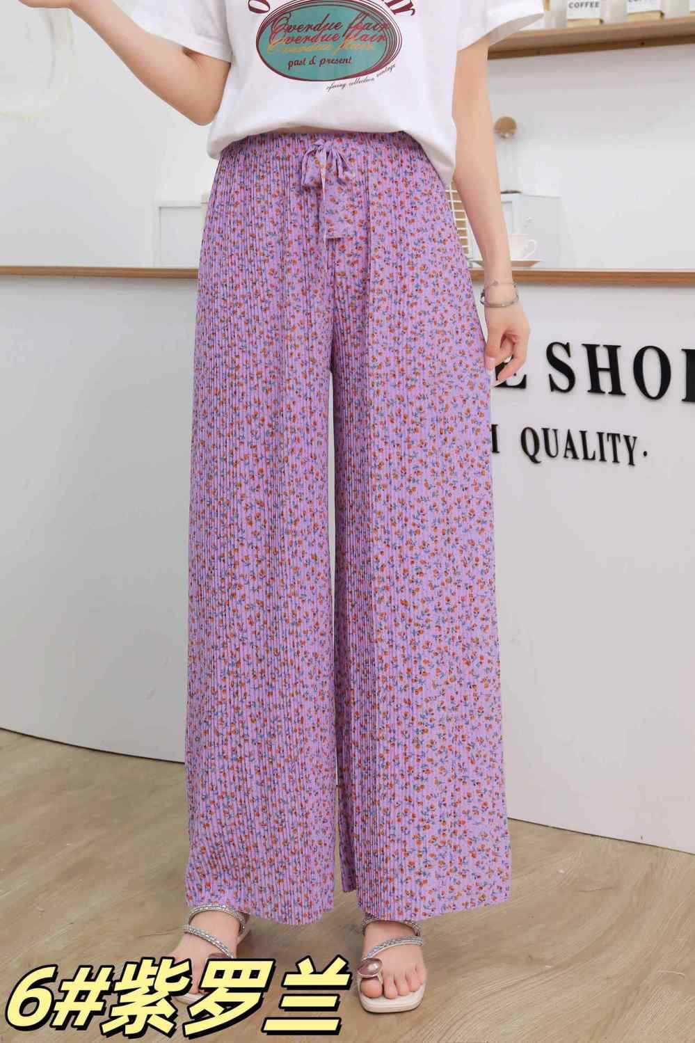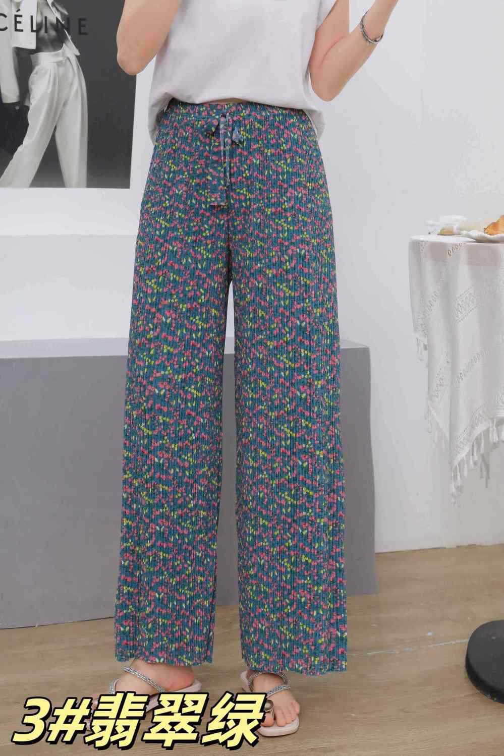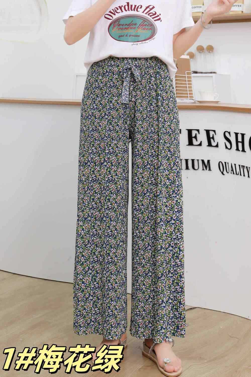 Корейские плиссированные широкие брюки из ледяного шелка с цветочным принтом, повседневные солнцезащитные пляжные крутые брюки, летние домашние прогулочные повседневные брюки