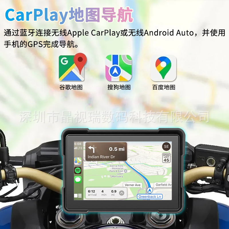 Беспроводная навигация для езды на мотоцикле с поддержкой Carplay Apple 5inch Bluetooth IPX7, водонепроницаемая навигация высокой четкости для езды на мотоцикле
