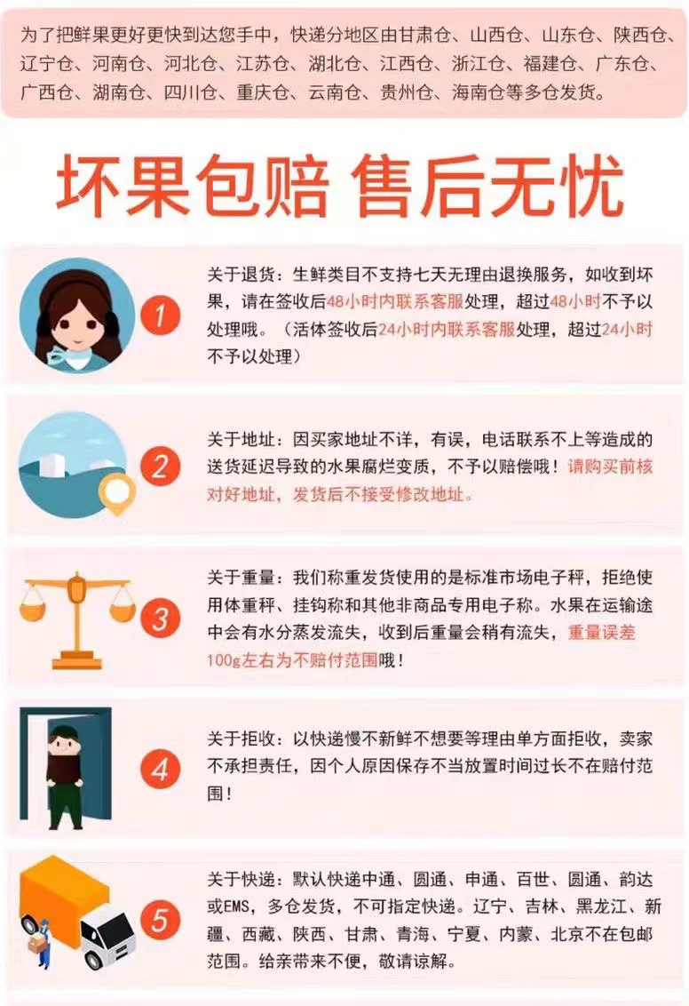 售后说明:生鲜产品请及时签收,签收24小时内,坏果烂果提供与面单合拍照片处理。未及时签收,或者签收24小时后不处理坏果烂果。
