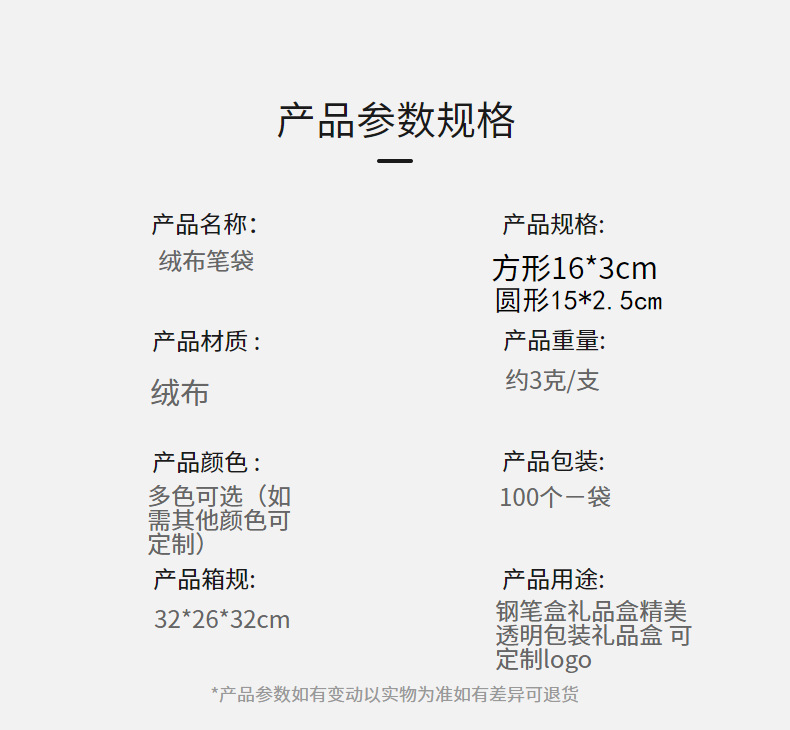 Круглый бархатный пенал【15.*2,5 см]; Квадратный фланелевой пенал [16*3см]; Прозрачный пенал [16,5*3см]; Пенал матовый [16,5*3см]; Черный двусторонний бархатный пенал [17,5*3,3см]; Красный двусторонний бархатный пенал [17,5*3,3см]; Коричневый двусторонний бархатный пенал [17,5*3,3см]; Темно-синий двусторонний бархатный пенал [17,5*3,3см]; Розовый двусторонний бархатный пенал [17,5*3,3см]; прямоугольный красный; прямоугольный синий; прямоугольный серый; круглый красный; круглый синий; круглый серый