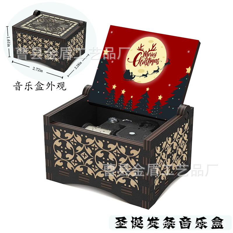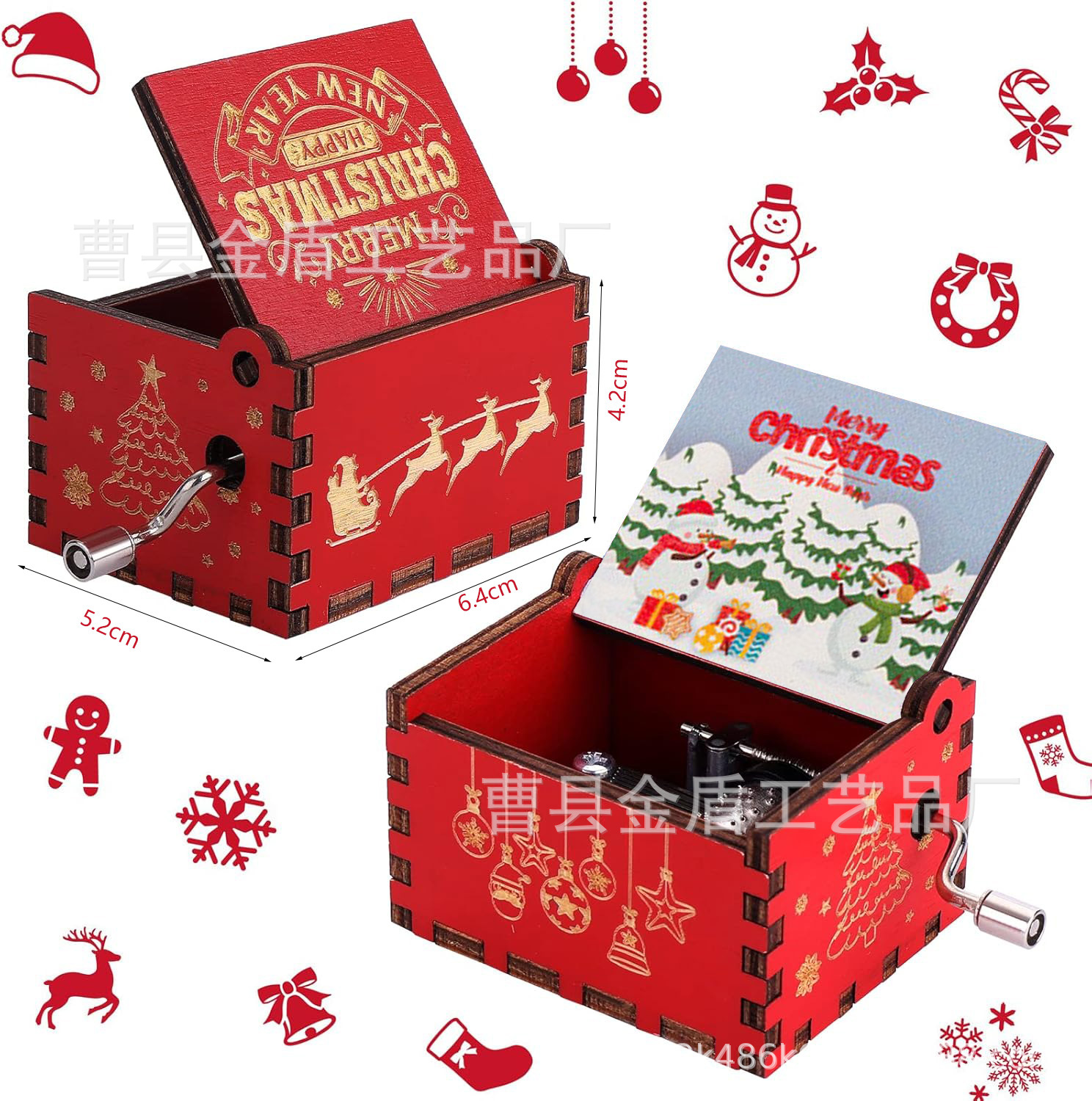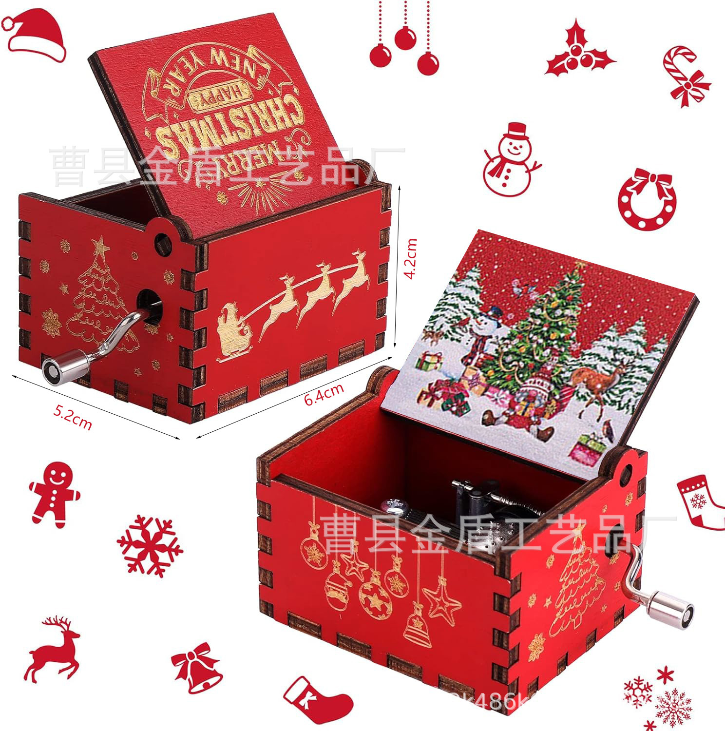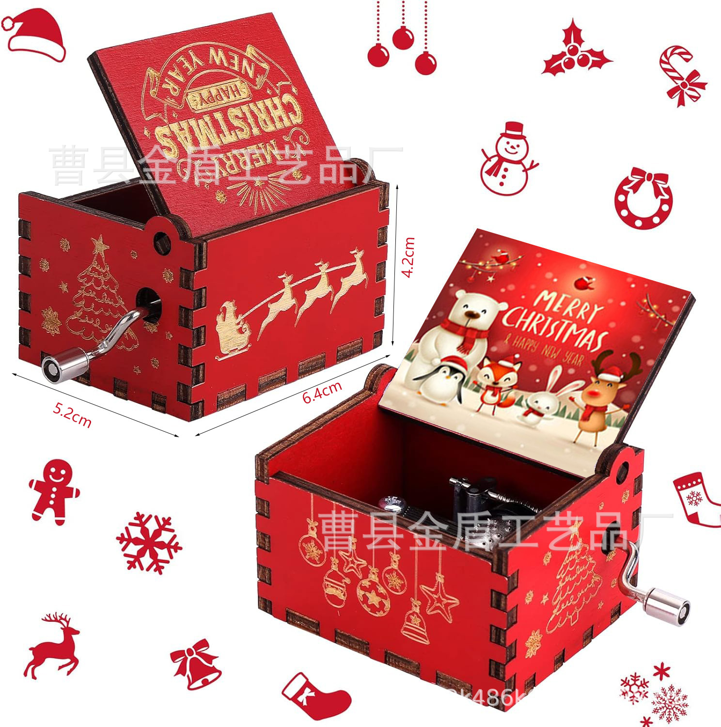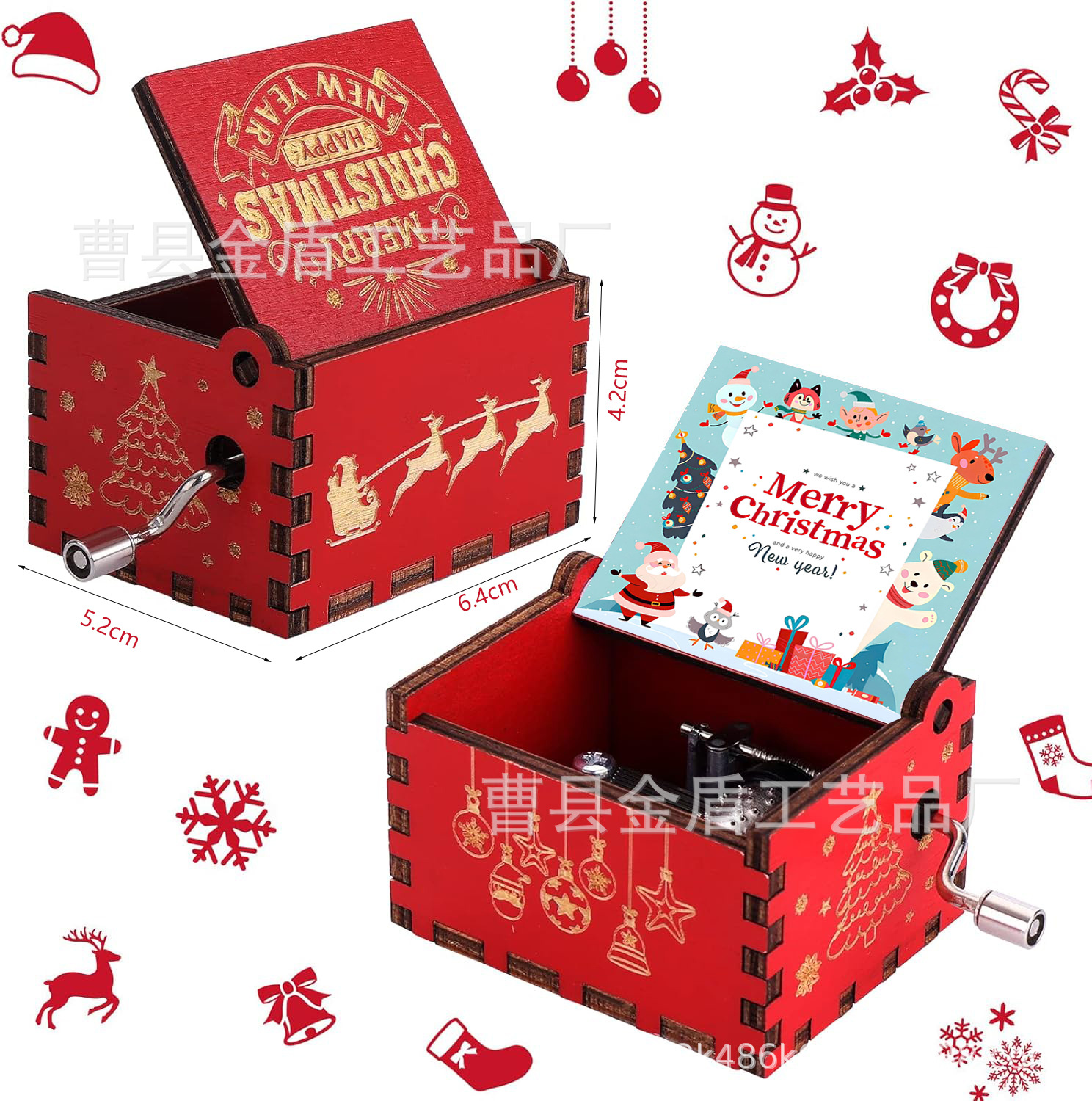 Рождественская деревянная музыкальная шкатулка с ручным приводом, винтажной гравировкой и УФ-печатью, оптовая продажа рождественских музыкальных шкатулок с заводным механизмом