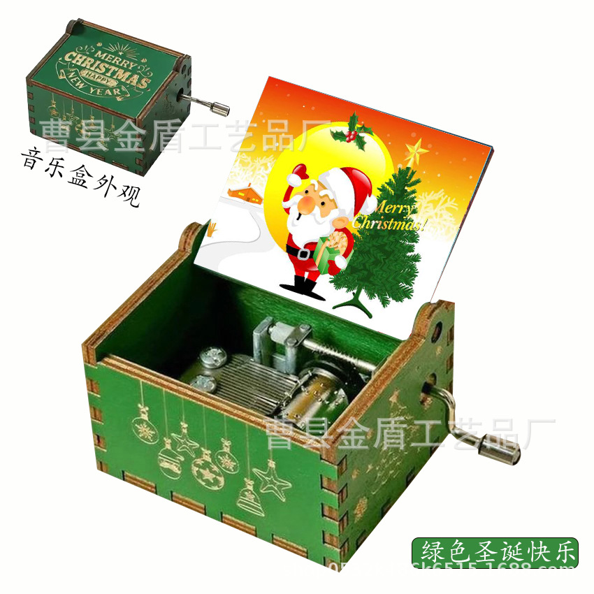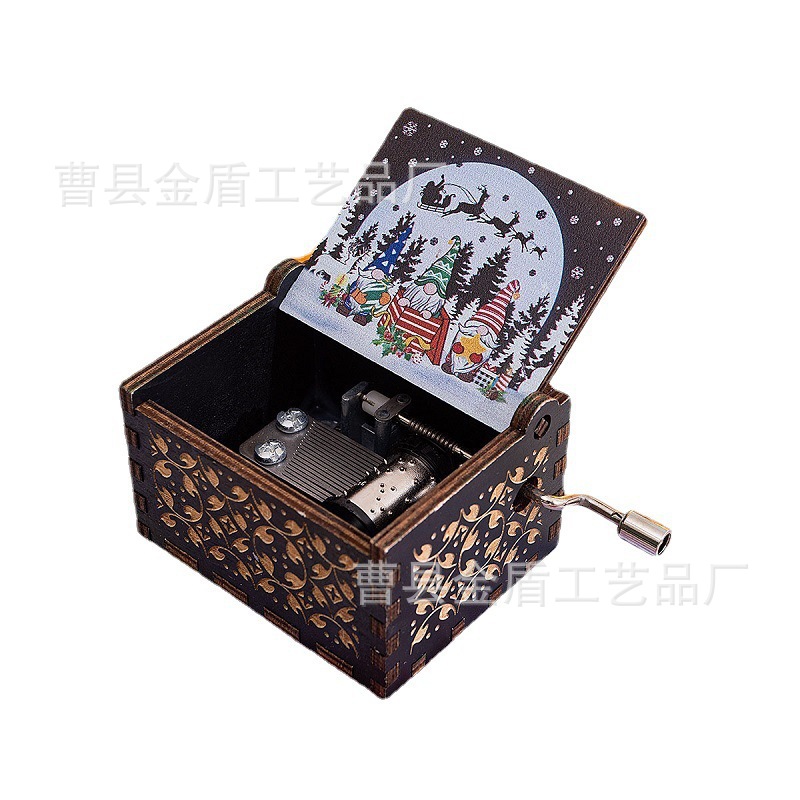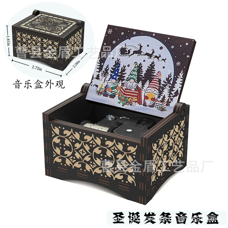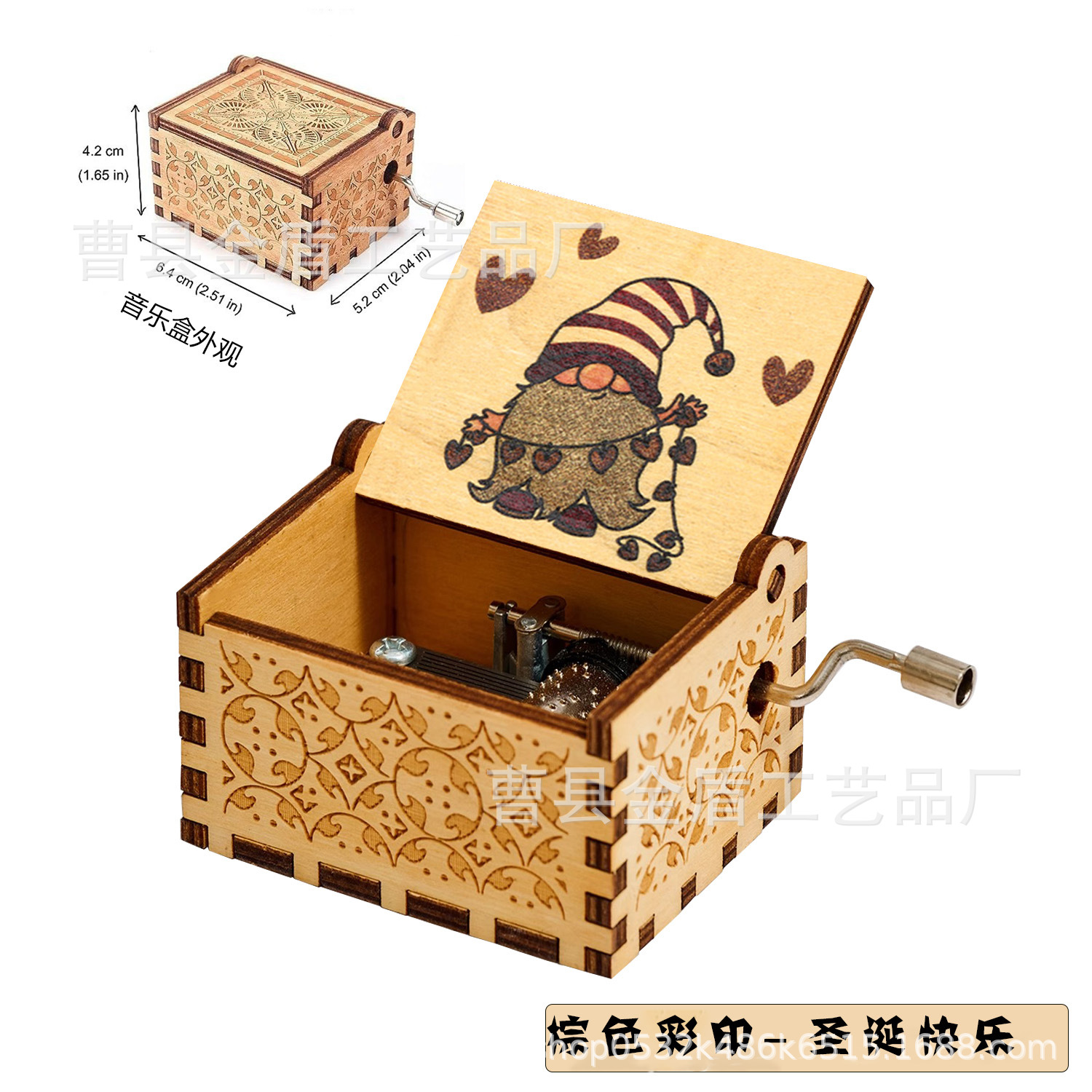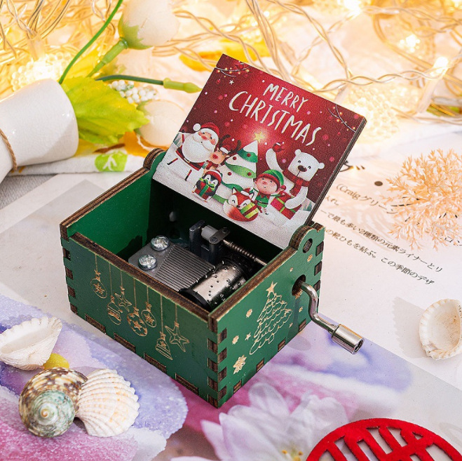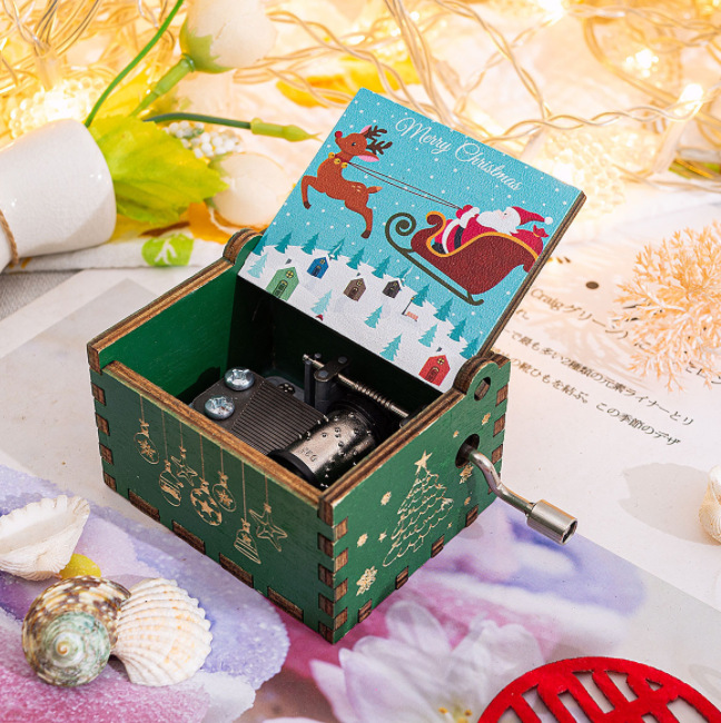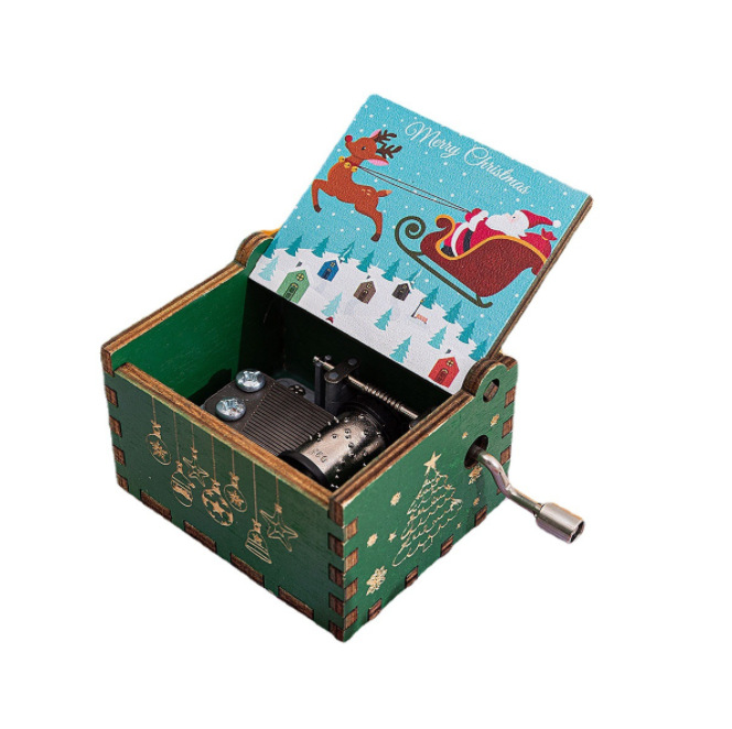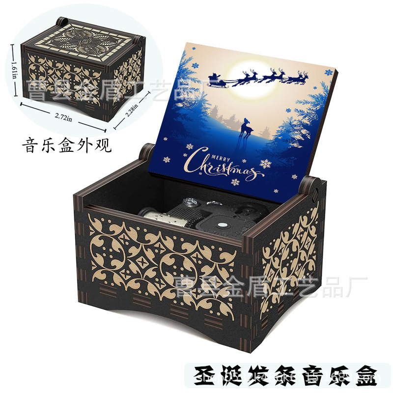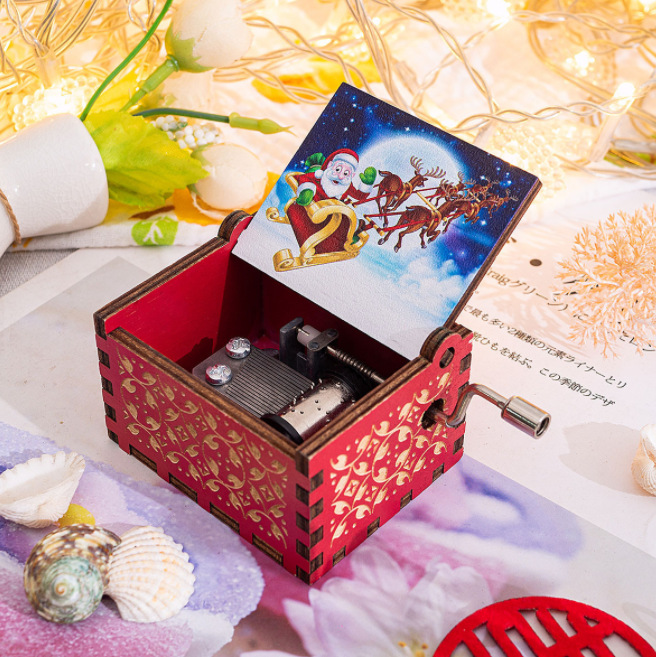 Рождественская деревянная музыкальная шкатулка с ручным приводом, винтажной гравировкой и УФ-печатью, оптовая продажа рождественских музыкальных шкатулок с заводным механизмом
