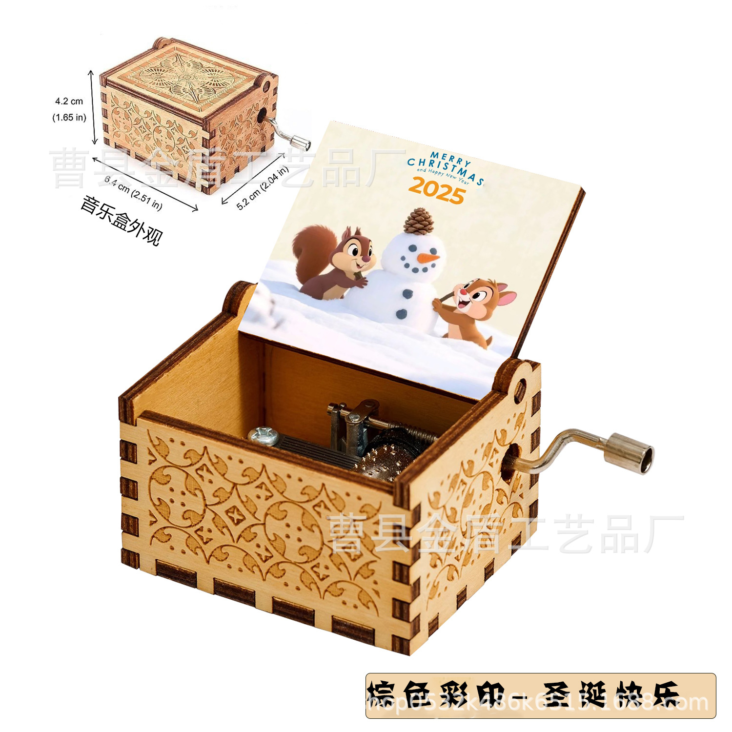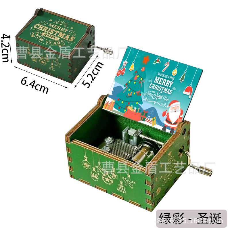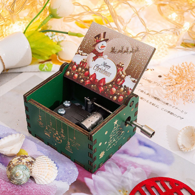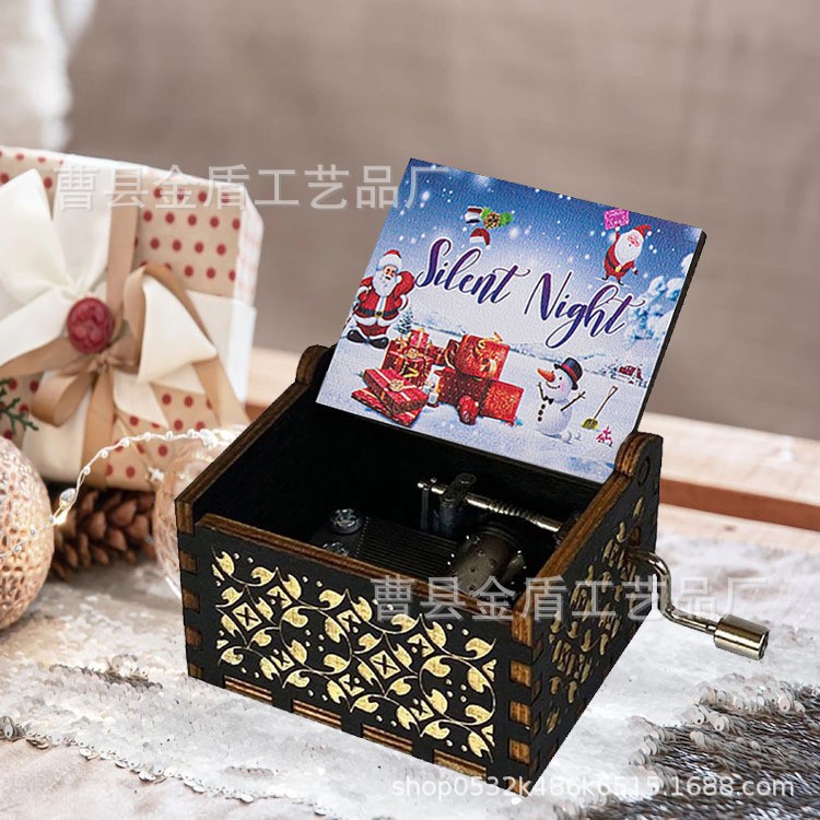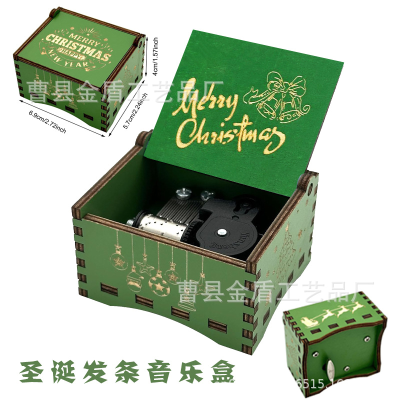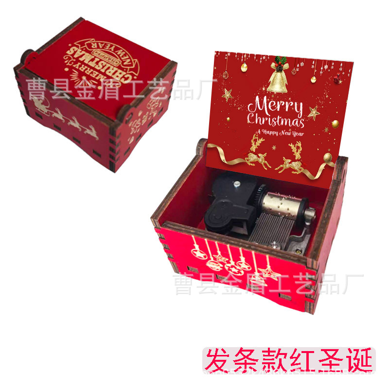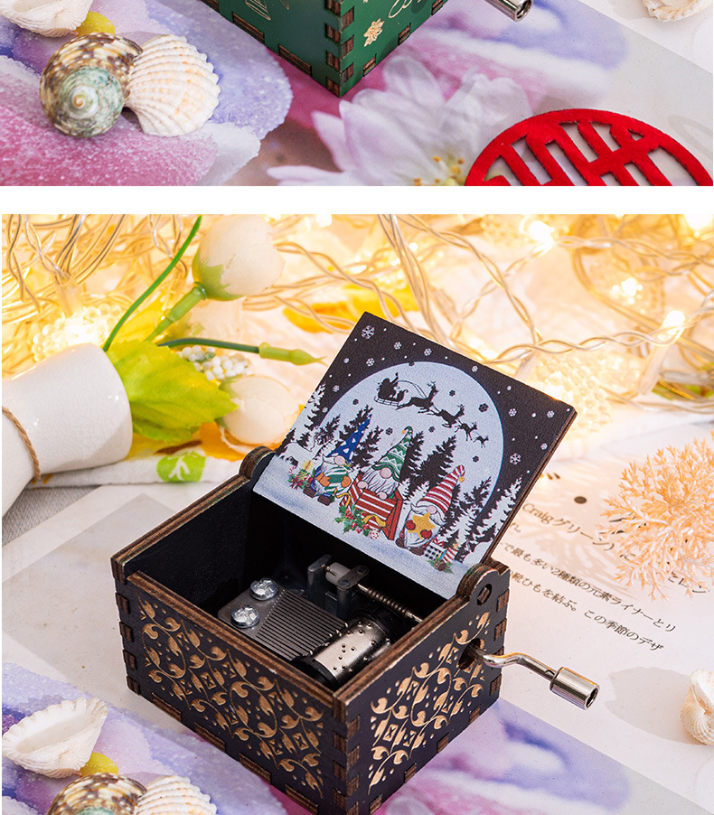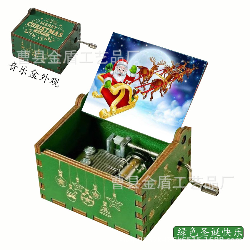 Рождественская деревянная музыкальная шкатулка с ручным приводом, винтажной гравировкой и УФ-печатью, оптовая продажа рождественских музыкальных шкатулок с заводным механизмом