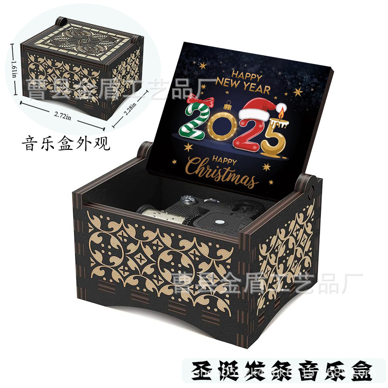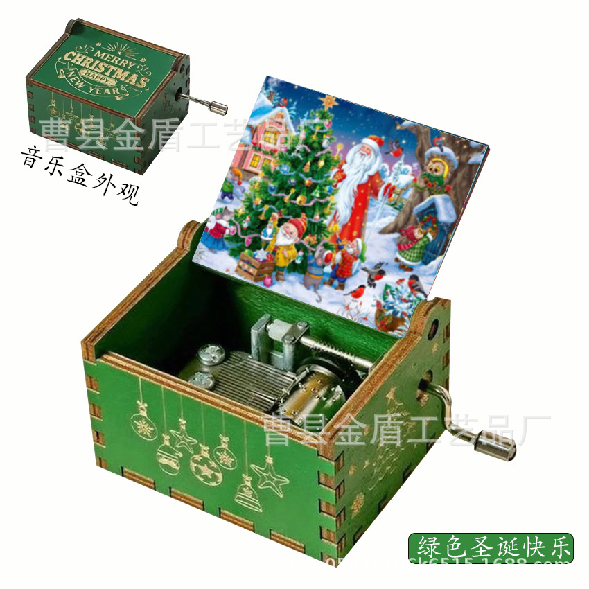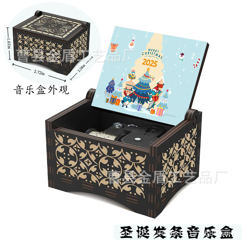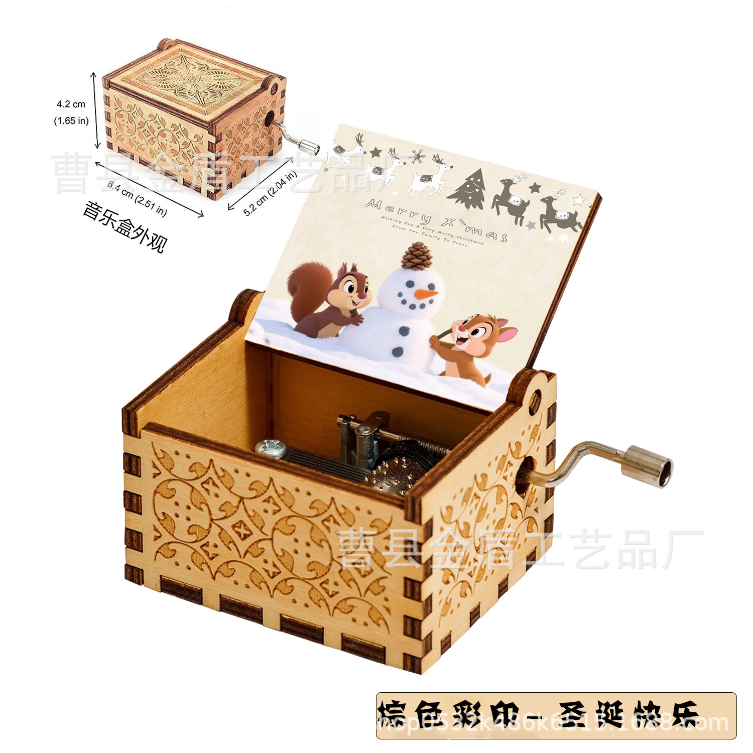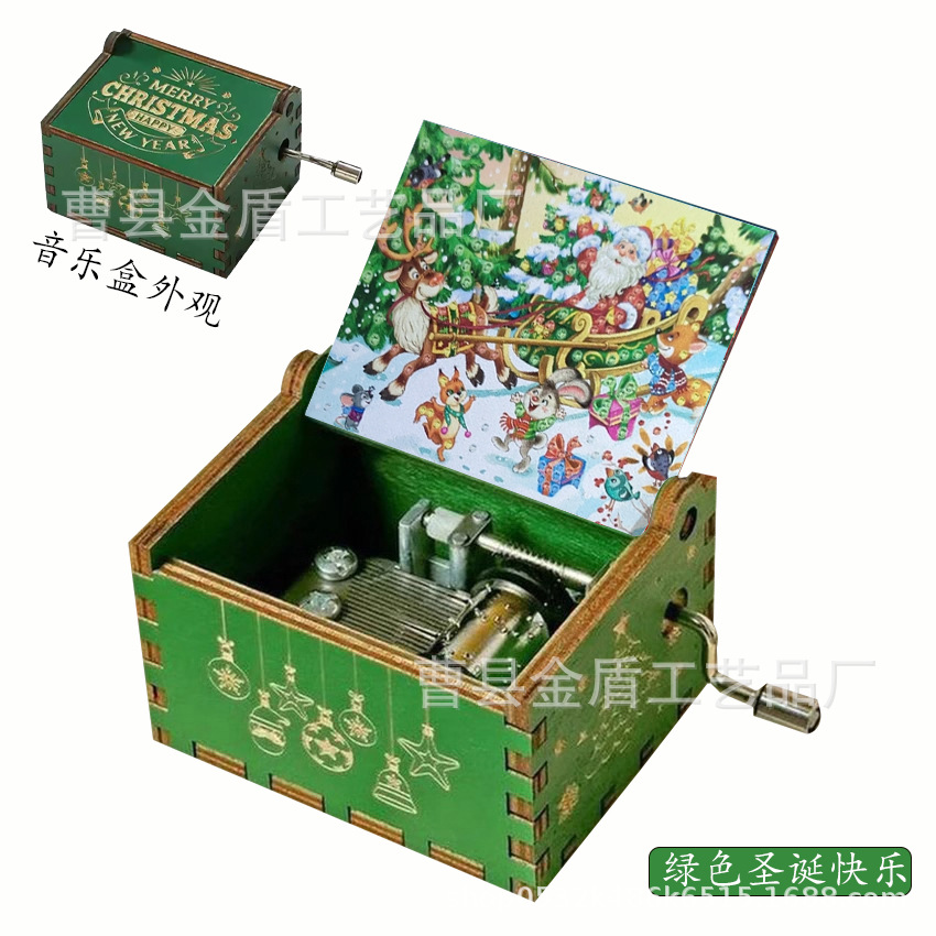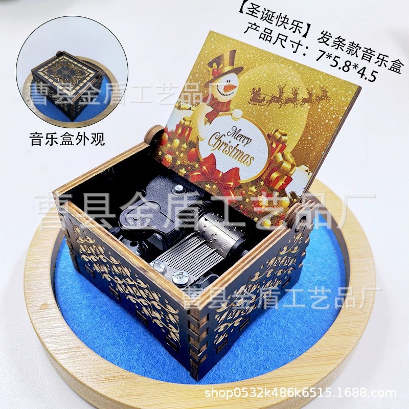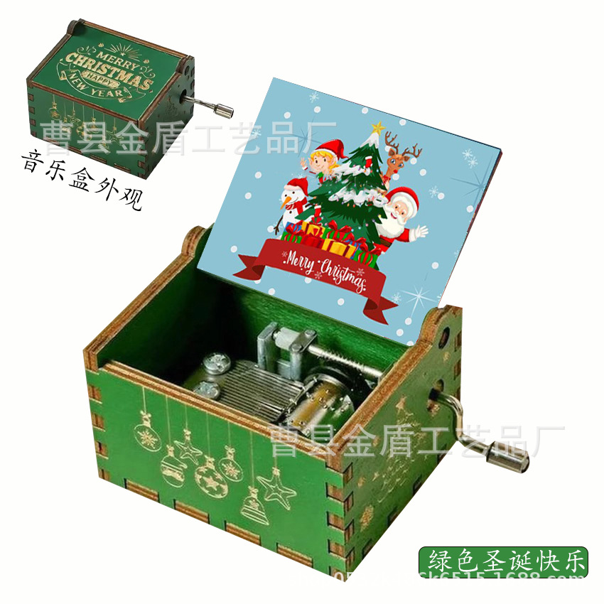 Рождественская деревянная музыкальная шкатулка с ручным приводом, винтажной гравировкой и УФ-печатью, оптовая продажа рождественских музыкальных шкатулок с заводным механизмом