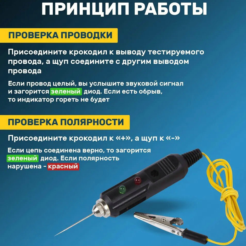Автотестер универсальный черный (ИГЛА) JINDA предназначен для быстрой и эффективной диагностики электрооборудования автомобилей. Позволяет определить полярность напряжения (+/-), выявить замыкание и обрыв проводки без необходимости размыкать проводку - за счет возможности ввести тонкую иглу непосредственно через изоляцию в проводку или проверить предохранители, лампочки и диоды. Корпус выполнен из ударопрочного пластика и снабжен проводом с зажимом типа «крокодил», светодиодным и звуковым индикатором. Питание: 3 х LR 41.