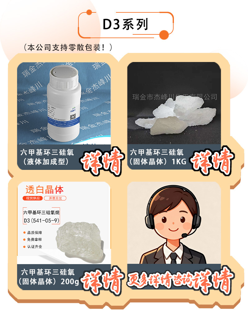Гексаметилциклотрисилоксан D3 в твердой форме подходит для использования в качестве агента для обработки поверхностей и сшивающего агента для изделий из винилового силиконового каучука.