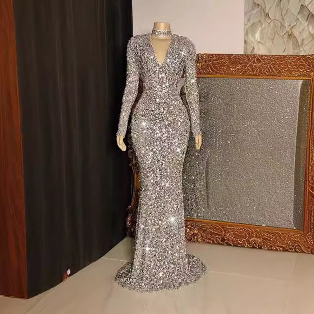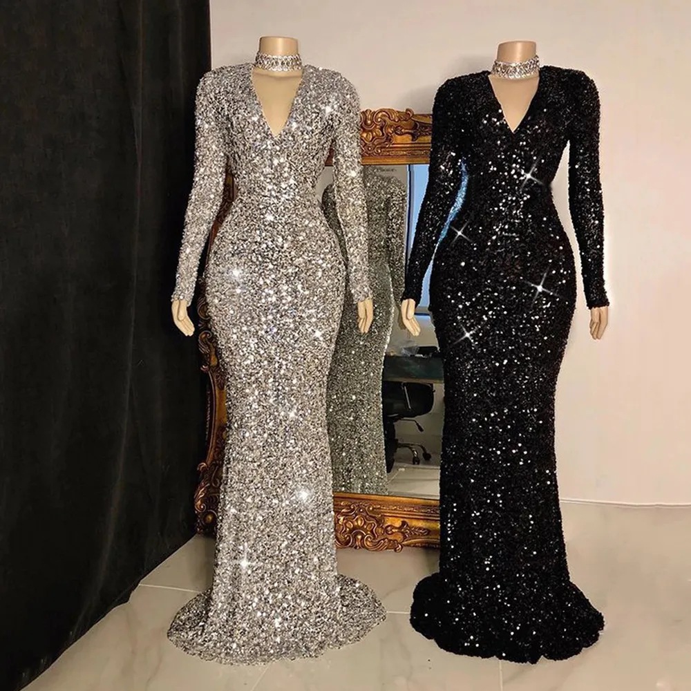 2025 новое кросс-бордерное платье с пайетками, V-образным вырезом, длинными рукавами, для ведущих, банкетов, элегантное, сексуальное, облегающее вечернее платье
