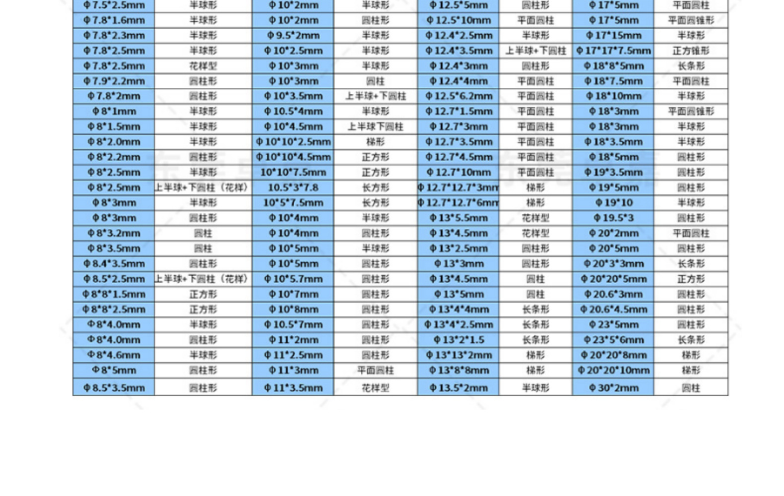 Полусфера 6мм*2мм; Полусфера 8 мм*1,5 мм; Полусфера 8мм*2мм; Полусфера 8 мм*2,5 мм; Полусфера 8мм*4мм; Полусфера 10мм*2мм; Полусфера прозрачная 12мм*6мм; Полусфера 16мм*8мм; Полусфера 15мм*5мм, черная матовая поверхность; Полусфера 18мм*3,6мм черная; Цилиндрический 8 мм*2,2 мм; Цилиндрический 12мм*3мм; Цилиндрический 12мм*4мм; Цилиндрический 12мм*5мм; Узор 13 мм*5,5 мм; Цилиндрический 20мм*2мм; Цилиндрический 11,8 мм*8 мм белый; Цилиндрический 12мм*2мм черный; Цилиндрический 12мм*2,5мм черный