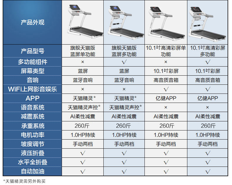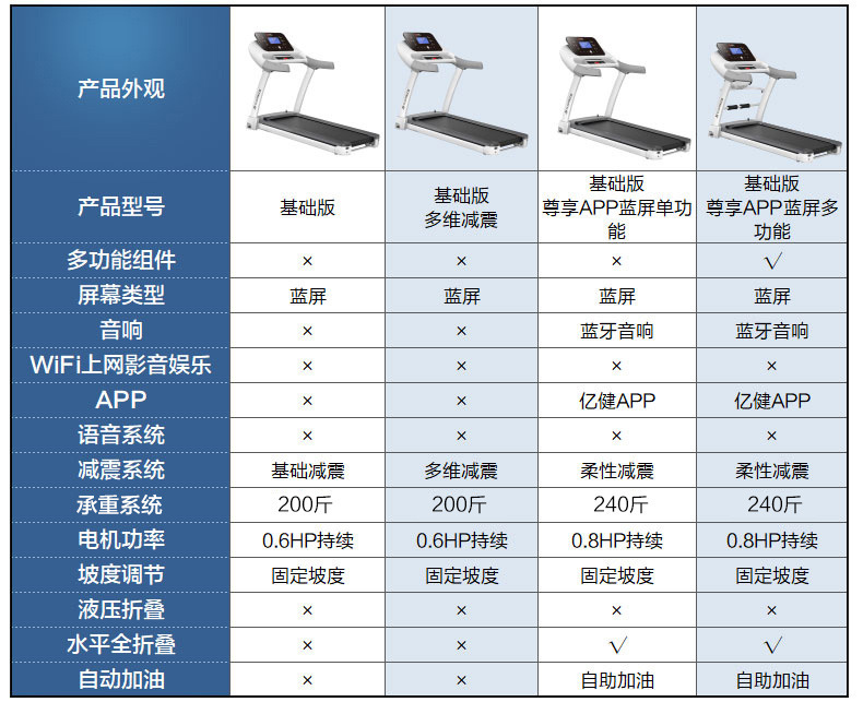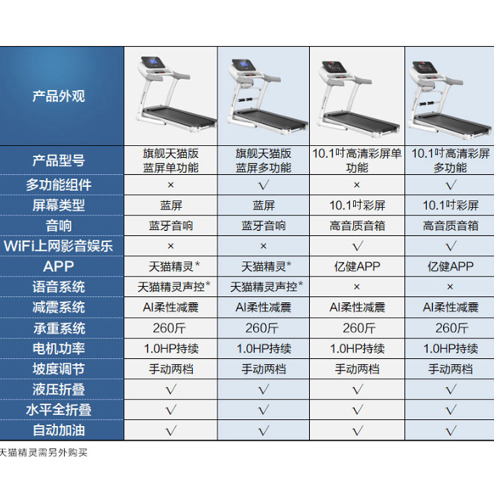 Удобная версия: взлетно-посадочная полоса 55 см, скорость/12 км.; Классическая версия-59 см бегун/12 км/бесщеточный двигатель; Стандартная версия: скорость 12 км/бесщеточный двигатель/мониторинг сердечного ритма/интеллектуальное уменьшение жира; Версия приложения с одной функцией: гибкая амортизация/соединение Bluetooth/беговая дорожка 59 см/бесшумный двигатель; Многофункциональная версия приложения — гибкая амортизация/соединение Bluetooth/беговая дорожка длиной 59 см/бесшумный двигатель; Версия с цветным экраном, одна функция - просмотр телевизора онлайн/гибкий амортизирующий ремень с искусственным интеллектом/ручной наклон; Версия с цветным экраном и множеством функций: просмотр телевизора онлайн/гибкий амортизирующий ремень с искусственным интеллектом/ручной наклон