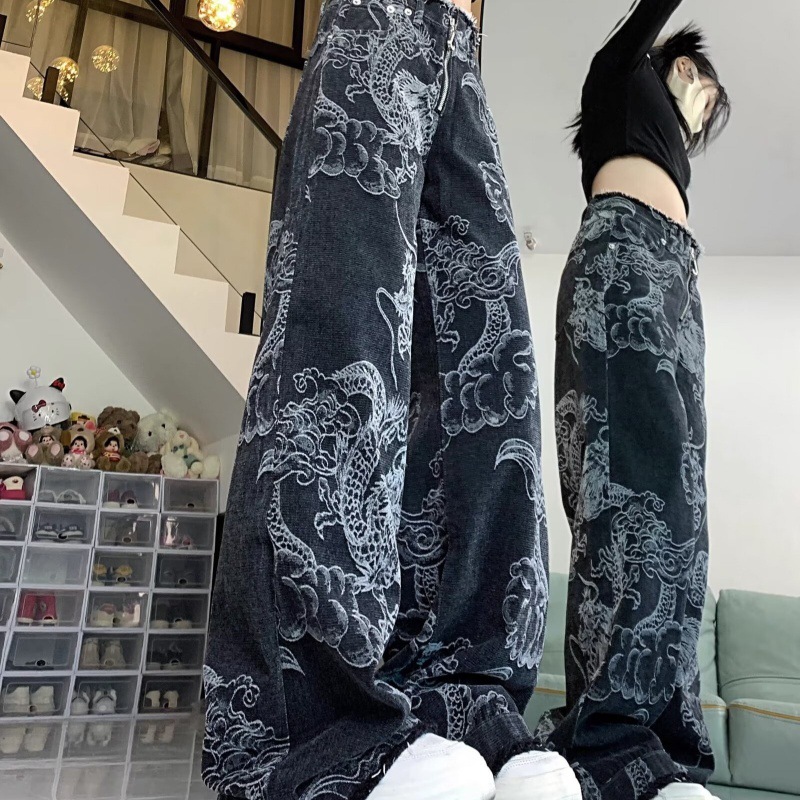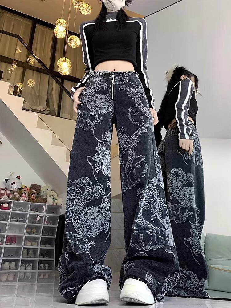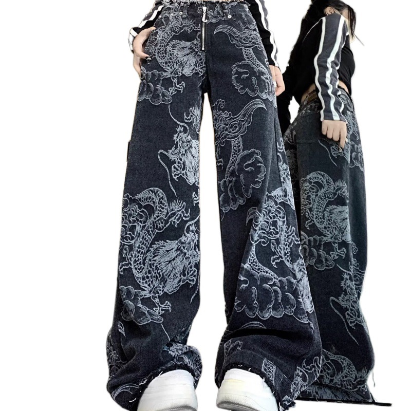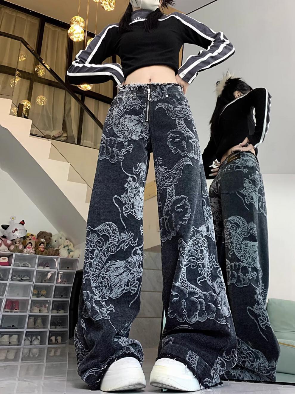 2024 Новые китайские брюки Женские национальные брюки джинсы свободные драконы с вышивкой