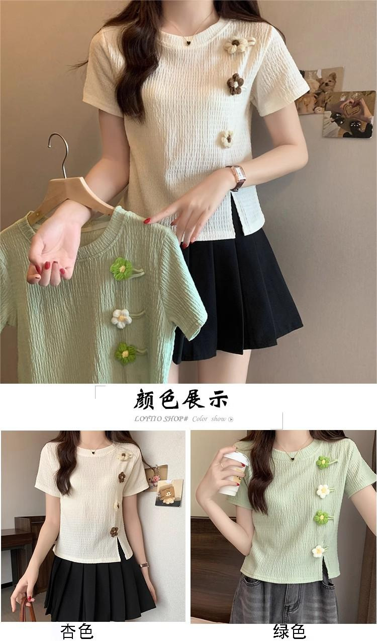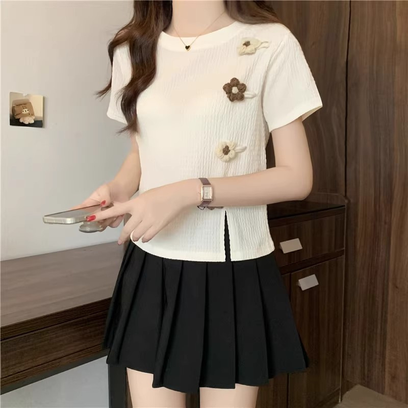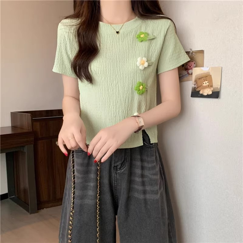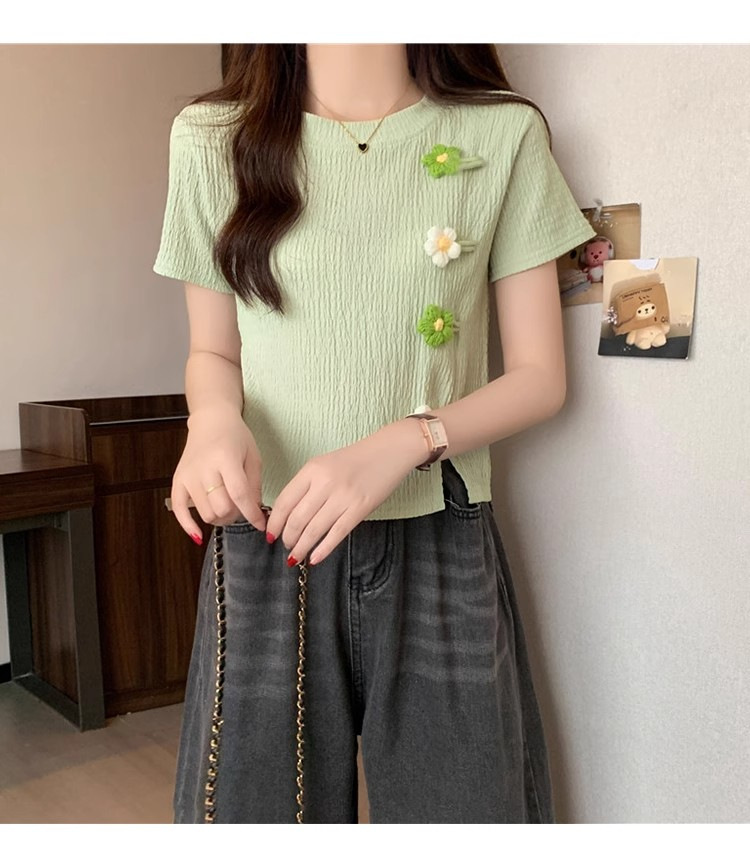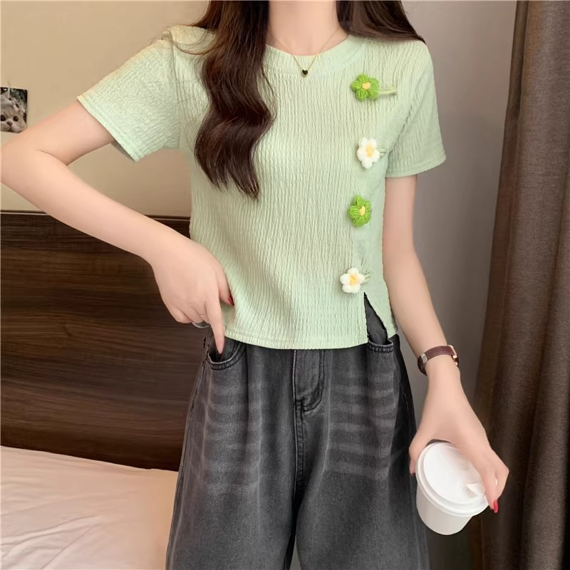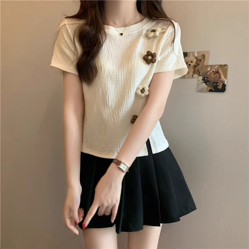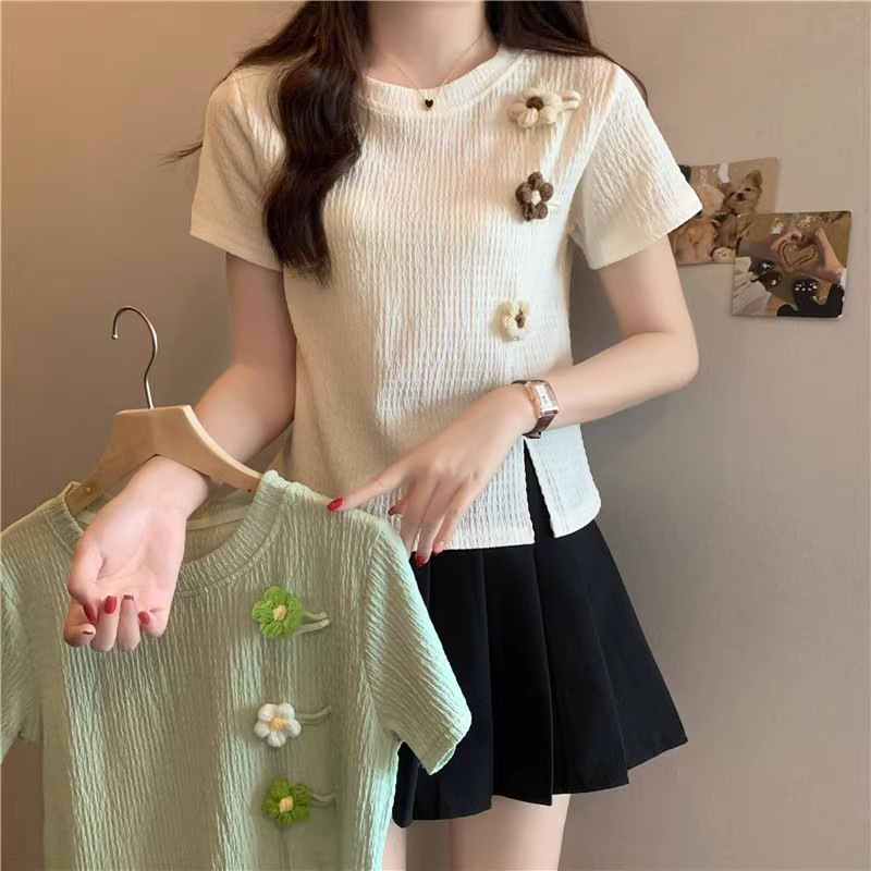 Короткая маленькая футболка с короткими рукавами женская 2024 новая корейская летняя трехмерная цветочная топ